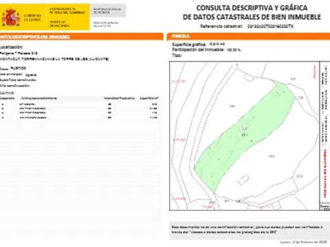 Terreno urbanizable en Torremanzanas con una totalidad de 13.500 M2 242 M2 de Matorral 5.810 M2de Pinar maderable 7.448 M2 de Almendro secano Ubicado en el polígono nº7 en la parcela nº318 t...