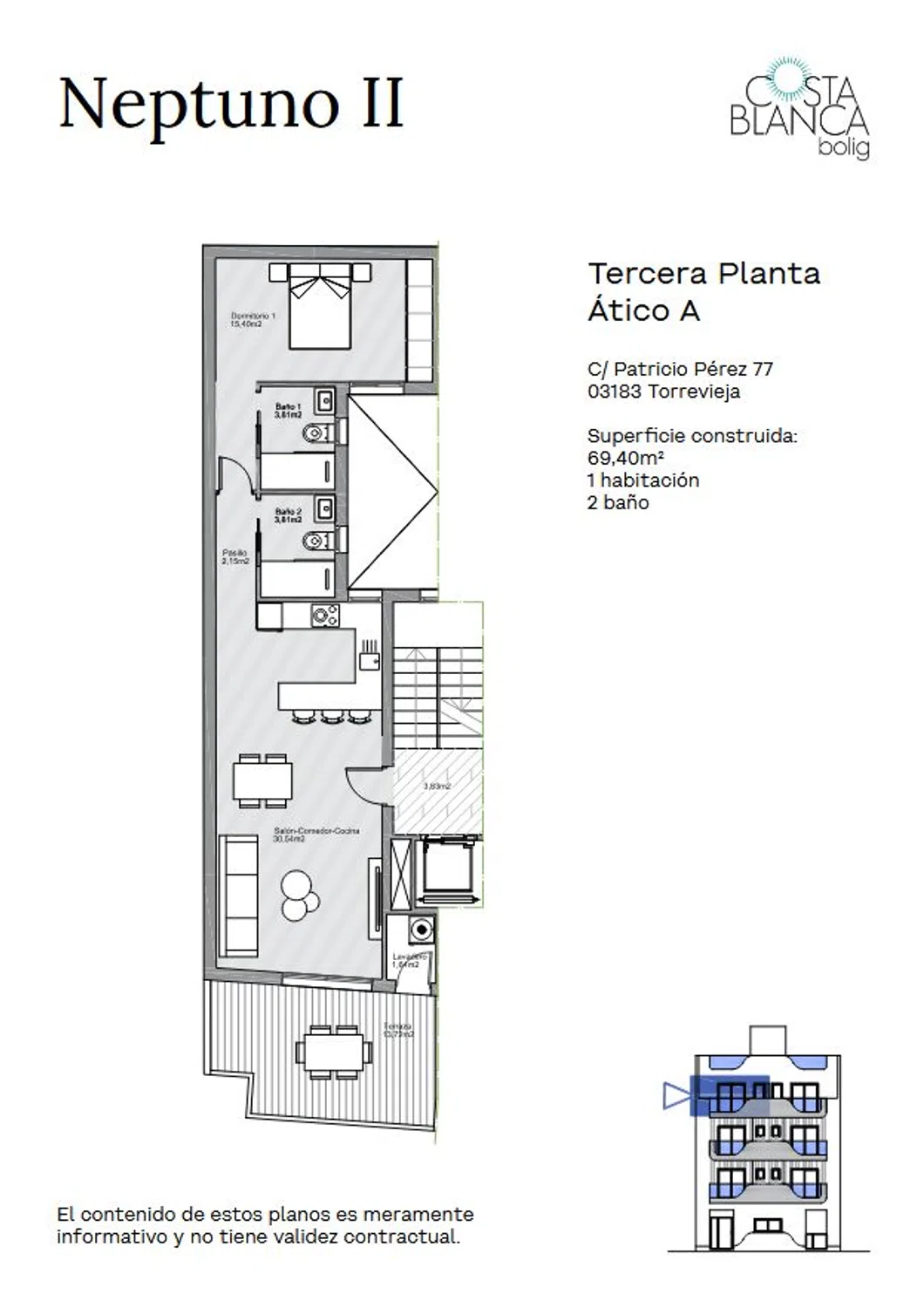 Descubre Edificio Neptuno II, una exclusiva promoción de tan solo 7 apartamentos modernos, diseñados para ofrecer el máximo confort y estilo. Vive con todas las comodidades modernas y disfruta del solárium en la azotea, piscina y otros espacios comunitarios premium. Características de las viviendas: 2 baños completos y cocinas totalmente equipadas con muebles altos y bajos. Preinstalación de aire acondicionado por conductos. Ventanas y puertas de aluminio con rotura de puente térmico; persianas motorizadas en fachada principal. Armarios empotrados con revestimiento textil, cajoneras y barra de colgar. Suelo porcelánico de gran formato y pintura lisa blanca en toda la vivienda.