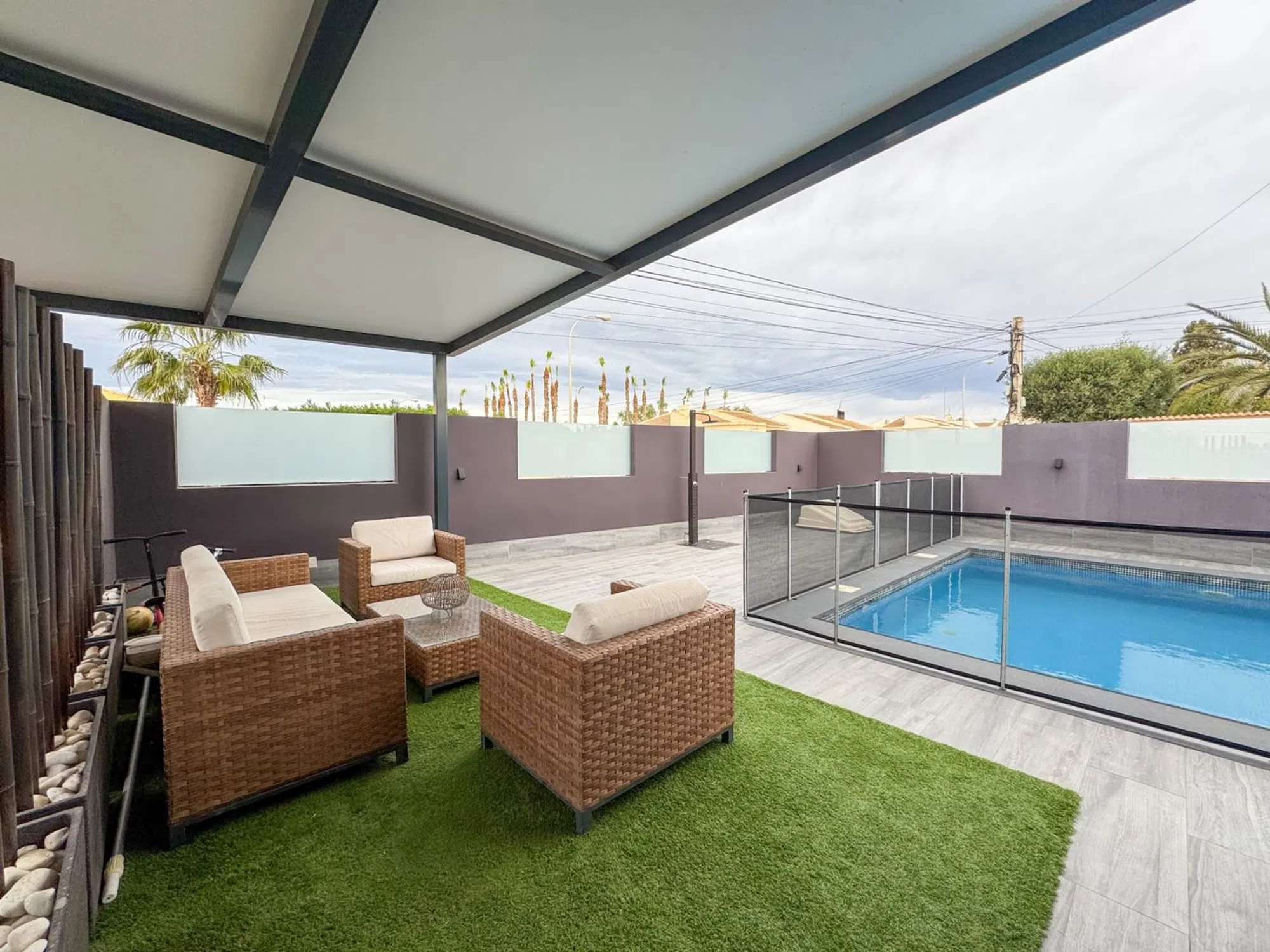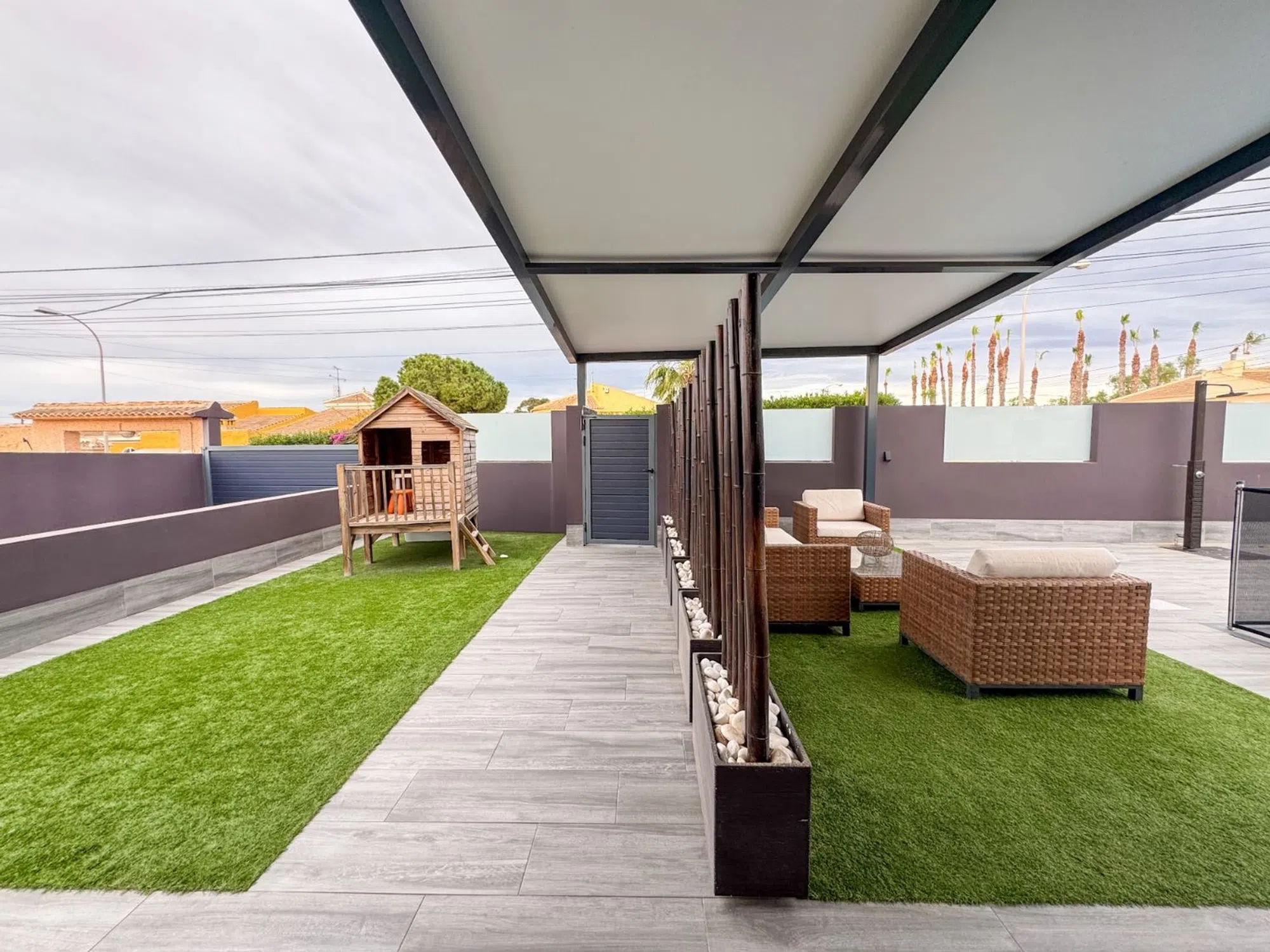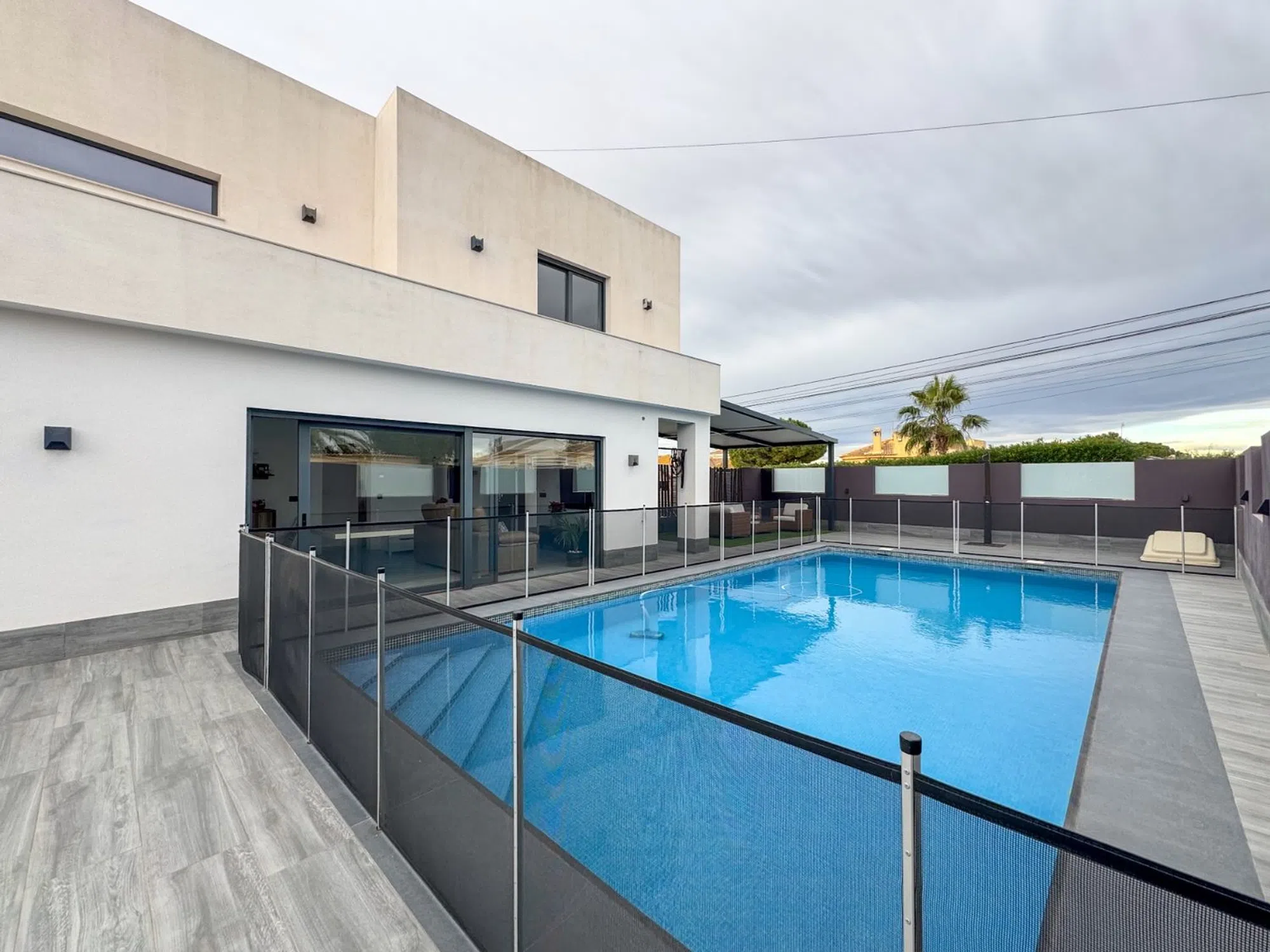 Presentamos una villa contemporánea única, diseñada para quienes buscan privacidad, amplitud y un estilo de vida sofisticado. Construida sobre una parcela de 410 m² y completamente renovada en 2016, esta propiedad combina diseño moderno, funcionalidad y confort. La vivienda ofrece 162 m² construidos y 138 m² útiles, distribuidos en estancias luminosas con líneas minimalistas. Dispone de seis habitaciones, entre ellas cuatro dormitorios amplios, además de tres baños completos renovados con acabados actuales. La casa se entrega amueblada, excepto el sofá, la televisión del salón y las pertenencias personales. El exterior de la villa es uno de sus grandes atractivos. Una amplia piscina privada se integra perfectamente con una gran terraza elevada, proporcionando zonas ideales para tomar el sol, relajarse o disfrutar de comidas al aire libre. La propiedad incluye también un área chill-out cubierta, césped artificial de calidad y capacidad para estacionar hasta cuatro vehículos. Ubicada a pocos minutos de restaurantes, farmacias, un parque acuático, pistas de pádel y del Centro Comercial Habaneras, ofrece una combinación excepcional de tranquilidad y accesibilidad.