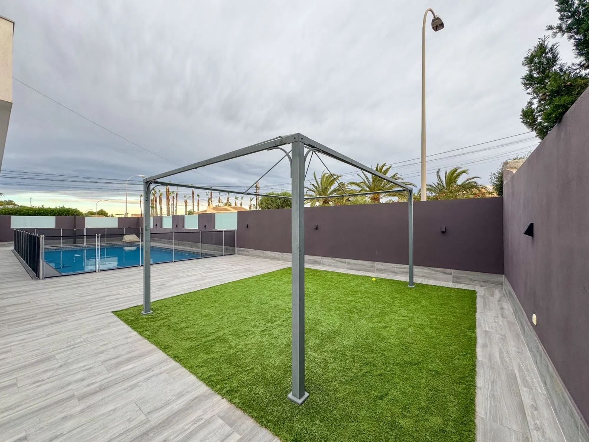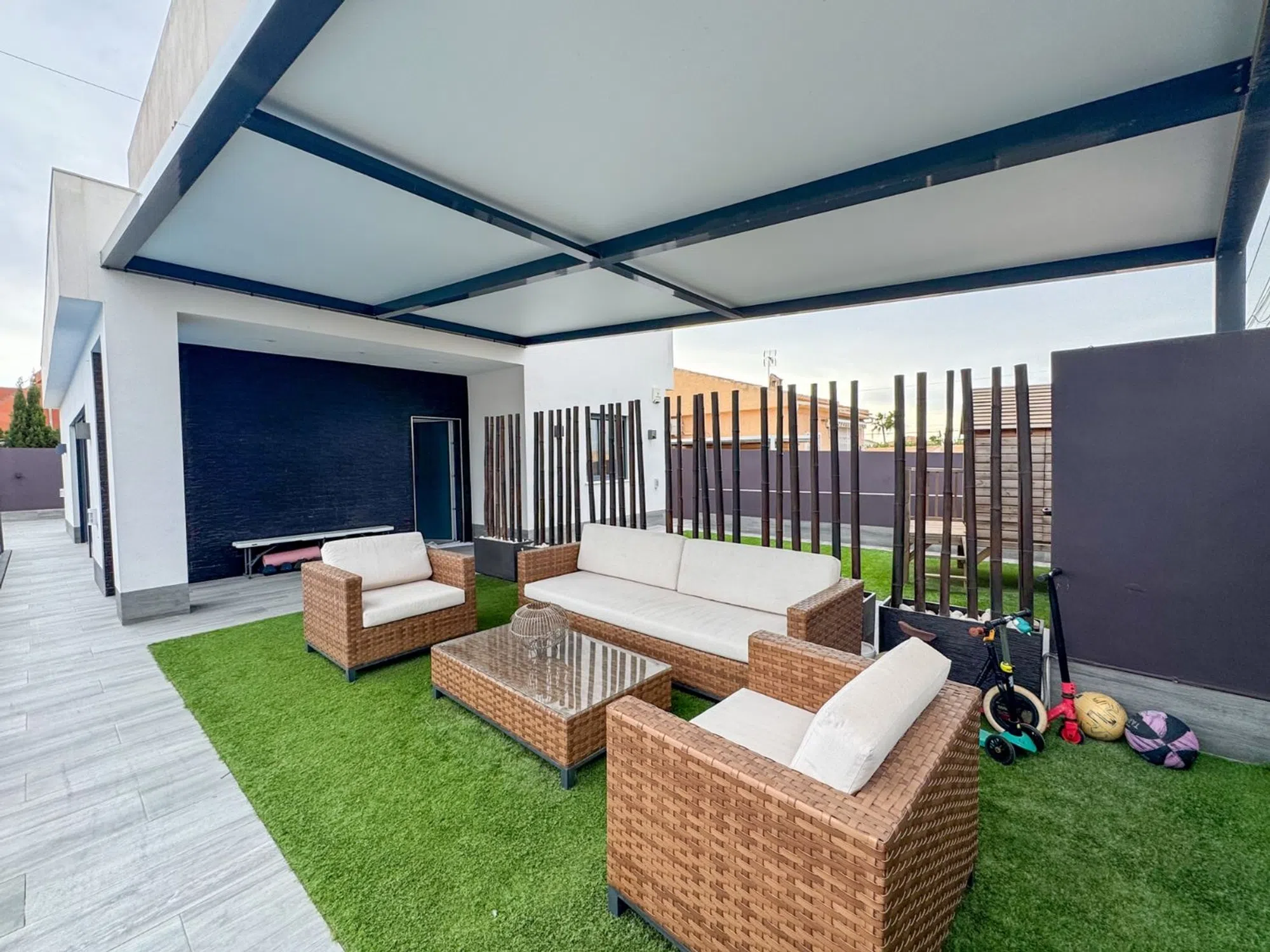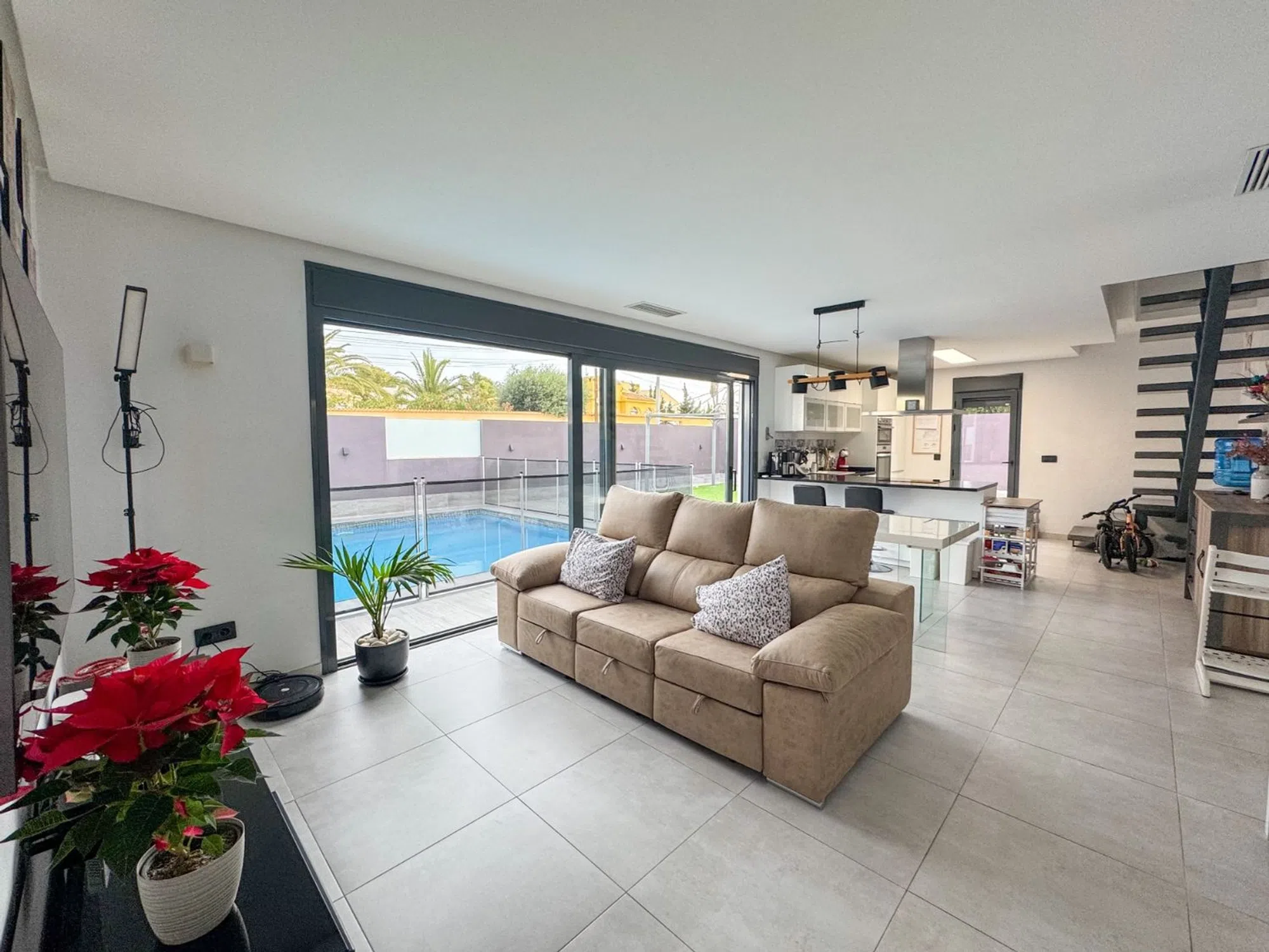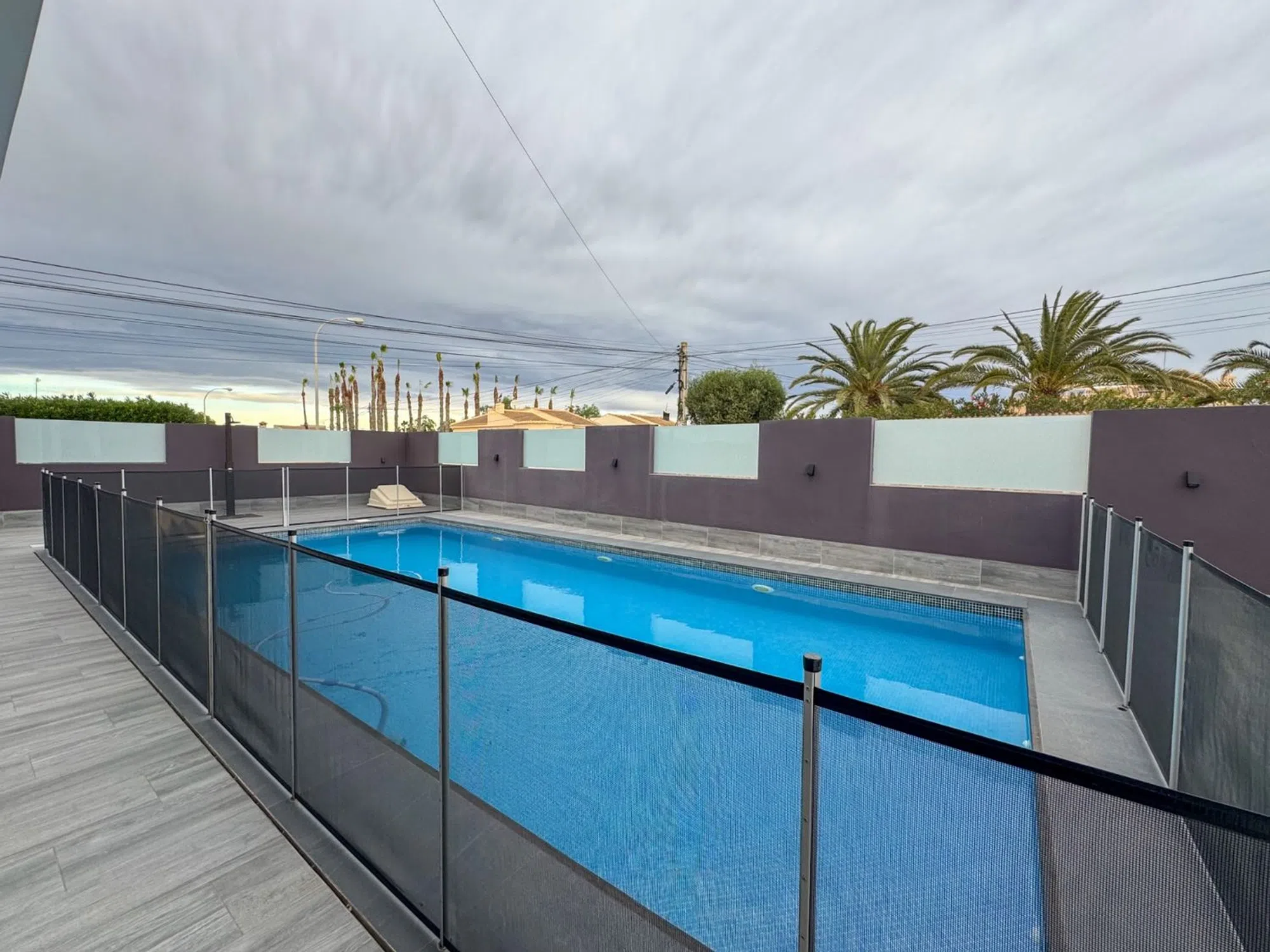 Presentamos una villa contemporánea única, diseñada para quienes buscan privacidad, amplitud y un estilo de vida sofisticado. Construida sobre una parcela de 410 m² y completamente renovada en 2016, esta propiedad combina diseño moderno, funcionalidad y confort. La vivienda ofrece 162 m² construidos y 138 m² útiles, distribuidos en estancias luminosas con líneas minimalistas. Dispone de seis habitaciones, entre ellas cuatro dormitorios amplios, además de tres baños completos renovados con acabados actuales. La casa se entrega amueblada, excepto el sofá, la televisión del salón y las pertenencias personales. El exterior de la villa es uno de sus grandes atractivos. Una amplia piscina privada se integra perfectamente con una gran terraza elevada, proporcionando zonas ideales para tomar el sol, relajarse o disfrutar de comidas al aire libre. La propiedad incluye también un área chill-out cubierta, césped artificial de calidad y capacidad para estacionar hasta cuatro vehículos. Ubicada a pocos minutos de restaurantes, farmacias, un parque acuático, pistas de pádel y del Centro Comercial Habaneras, ofrece una combinación excepcional de tranquilidad y accesibilidad.