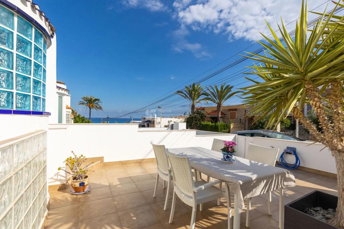 Despiértese con el sonido de las olas y disfrute de impresionantes vistas al mar desde casi todos los niveles de esta hermosa casa adosada en La Mata, Torrevieja. Con la playa y el mar Mediterráneo a solo 190 metros, esta casa ofrece una ubicación verdaderamente privilegiada y lo mejor de la vida costera en la Costa Blanca. Esta propiedad bien mantenida cuenta con 4 habitaciones (3 dormitorios y 2 baños) distribuidas en tres plantas. Luminosa, moderna y cómoda: la combinación perfecta de encanto mediterráneo y diseño contemporáneo. Planta Principal – Luz, Espacio y Vistas En la parte delantera de la casa, una soleada terraza orientada al sur le da la bienvenida con fantásticas vistas al mar, ideal para desayunar al sol o disfrutar de una relajante cena. En el interior, encontrará una cocina de planta abierta en excelentes condiciones con acabados luminosos, conectada al salón que se abre a un balcón con impresionantes vistas al mar. Desde aquí, una escalera conduce a la azotea. Azotea – Sol y Vistas Panorámicas La azotea es lo más destacado de esta casa, ya que ofrece sol desde la mañana hasta la noche y una de las mejores vistas al mar de La Mata. Perfecto para tomar el sol, cenar, entretener o simplemente disfrutar del tranquilo ambiente mediterráneo. Planta Baja – Dormitorios, Baños y Piscina Privada En la planta baja encontrará los tres dormitorios y dos elegantes baños de la casa, ambos con duchas. El dormitorio principal tiene acceso directo a la terraza trasera, donde descubrirá su propia piscina privada, un lugar tranquilo para refrescarse y relajarse en completa privacidad. Características Clave Increíbles vistas al mar desde varios niveles A solo 190 metros de la playa y el mar Terrazas soleadas con sol y sombra Totalmente amueblado con muebles modernos y de buen gusto Piscina privada y amplia azotea Luminoso, fresco y listo para entrar a vivir Ubicación La Mata es una de las zonas costeras más queridas de Torrevieja, conocida por su larga playa de arena, su auténtico encanto español y su ambiente acogedor. Todo lo que necesita está a poca distancia: restaurantes, cafeterías, tiendas y el hermoso paseo marítimo, mientras que la casa en sí ofrece paz y privacidad. El aeropuerto de Alicante está a unos 35 minutos en coche y el centro de Torrevieja está a poca distancia en coche. Resumen Una oportunidad única de poseer una casa adosada con piscina privada, azotea y excepcionales vistas al mar, a pocos pasos del Mediterráneo. Ideal como residencia permanente, casa de vacaciones o inversión de alquiler de alta demanda. Ubicación: La Mata, Torrevieja Distancia al mar: 190 metros Habitaciones: 4 (3 dormitorios, 2 baños) Piscina privada y azotea Orientación sur con vistas al mar Totalmente amueblado y listo para entrar a vivir.