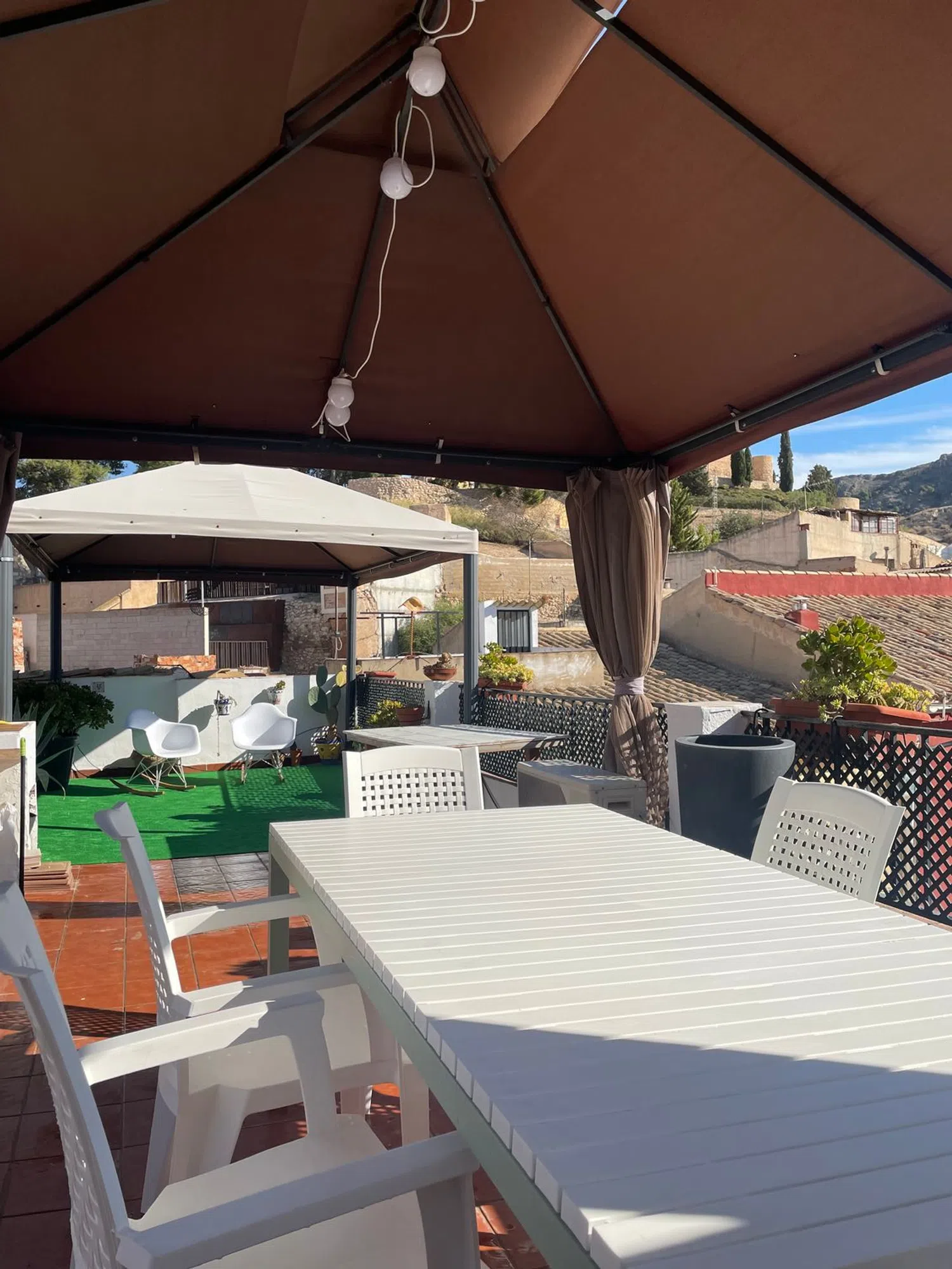 On the upper floor, you will find another kitchen, three bedrooms—two of which also have dual spaces—and a notably large third bedroom. This level is complete with a full bathroom that includes a bathtub. The highlight of this property is undoubtedly the terrace, arguably one of the best in the area. It offers over thirty square meters of space, perfect for enjoying leisure time with family and friends while providing breathtaking views of the castle, the square, and the bell tower.