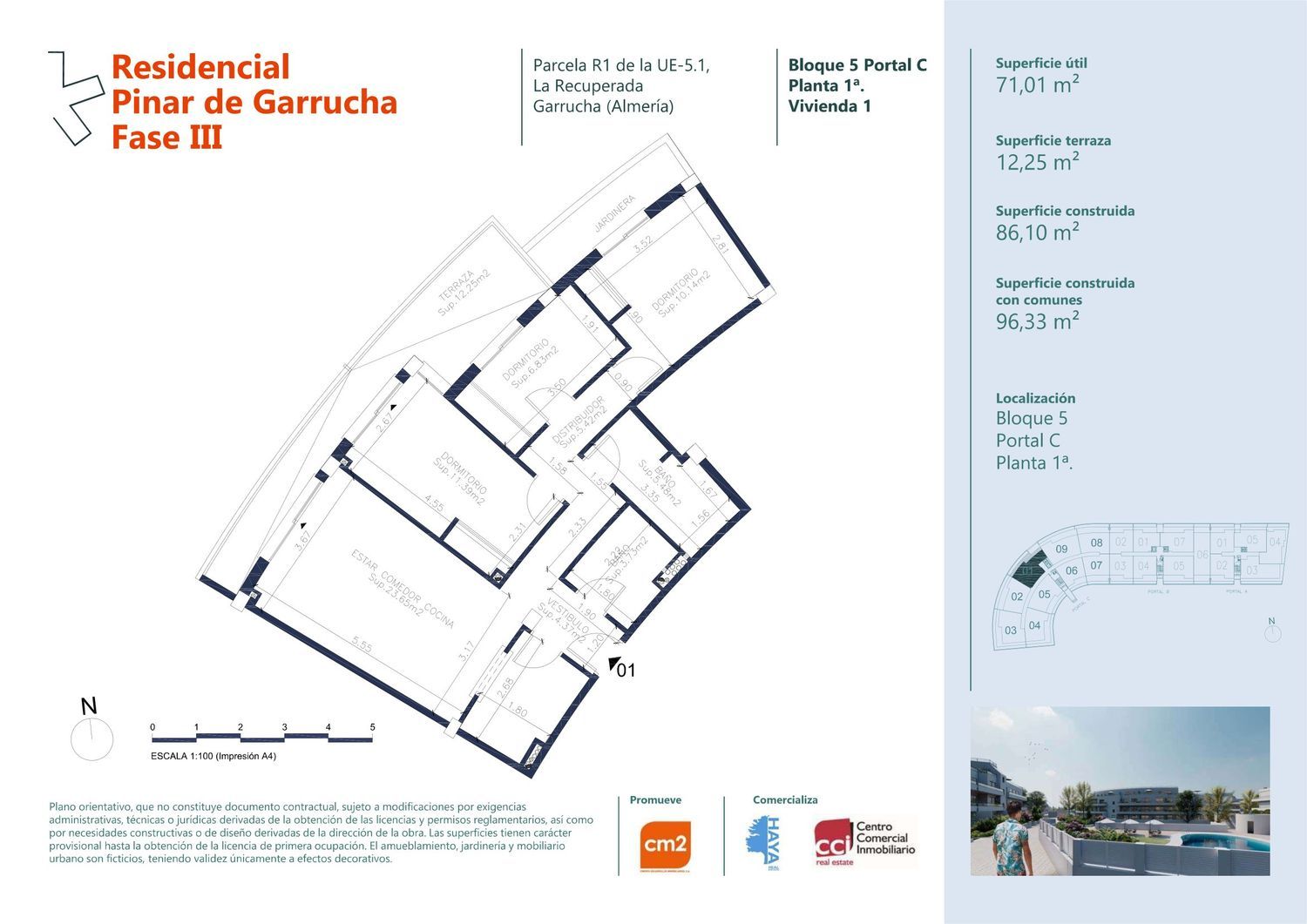 En la Costa del Levante Almeriense, amparada por recónditas calas recortadas en las Sierras Almagrera y Cabrera, se encuentran las extensas playas de fina y dorada arena, arropadas por una línea de flora única, envidia de toda la región.Con una franja marítima de 6 kilómetros, su carácter excepcional por el cuidado y limpieza con que se mantienen, y por sus aguas cristalinas del Mar Mediterráneo, ha llevado a conseguir que luzcan numerosos distintivos otorgados a las playas de máxima calidad.Comprende una amplia tipología de viviendas ubicadas en un entorno privado de zonas verdes rodeado de piscinas, zona de recreo acuática, pista de pádel, zonas de juegos infantiles. A tan solo 200 metros de pinar garrucha se encuentra el paseo marítimo, comúnmente denominado el malecón, que cuenta con kilómetro y medio de baranda de mármol y unos mimados jardines mezclados con la arena de la costa, que hacen de él una espléndida avenida sobre el mediterráneo. en él también podemos encontrar una gran variedad de comercios: restaurantes, heladerías, terrazas, tiendas, donde pasear y disfrutar del enclave y la gran vida social y turística de la zona.DotacionesLa urbanización, cerrada perimetralmente, cuenta con amplias zonas ajardinadas, piscinas comunitarias, zonas de recreo y pista de pádel.SituaciónSituado en una zona privilegiada por encontrarse junto al pueblo marinero de Garrucha (con Puerto Comercial y Deportivo), a 200 metros de la playa y Pº Marítimo, muy cerca de Mojácar Playa con sus centros de ocio familiares y nocturnos y de las maravillosas playas de Garrucha.ComunicacionesA 93 kilómetros de Almería, a unos 500 kilómetros de Madrid y a 10 minutos de las excelentes playas de Vera.