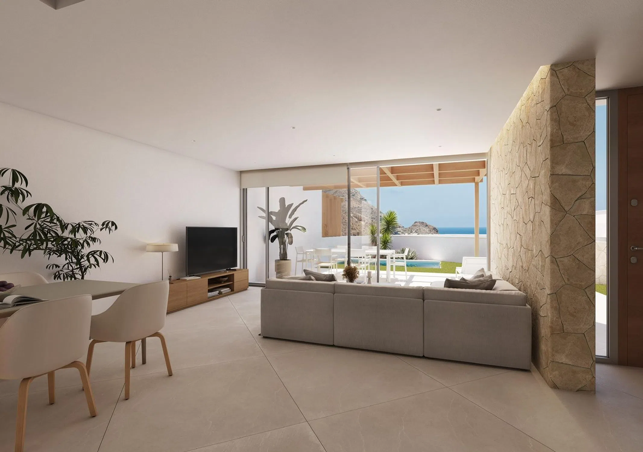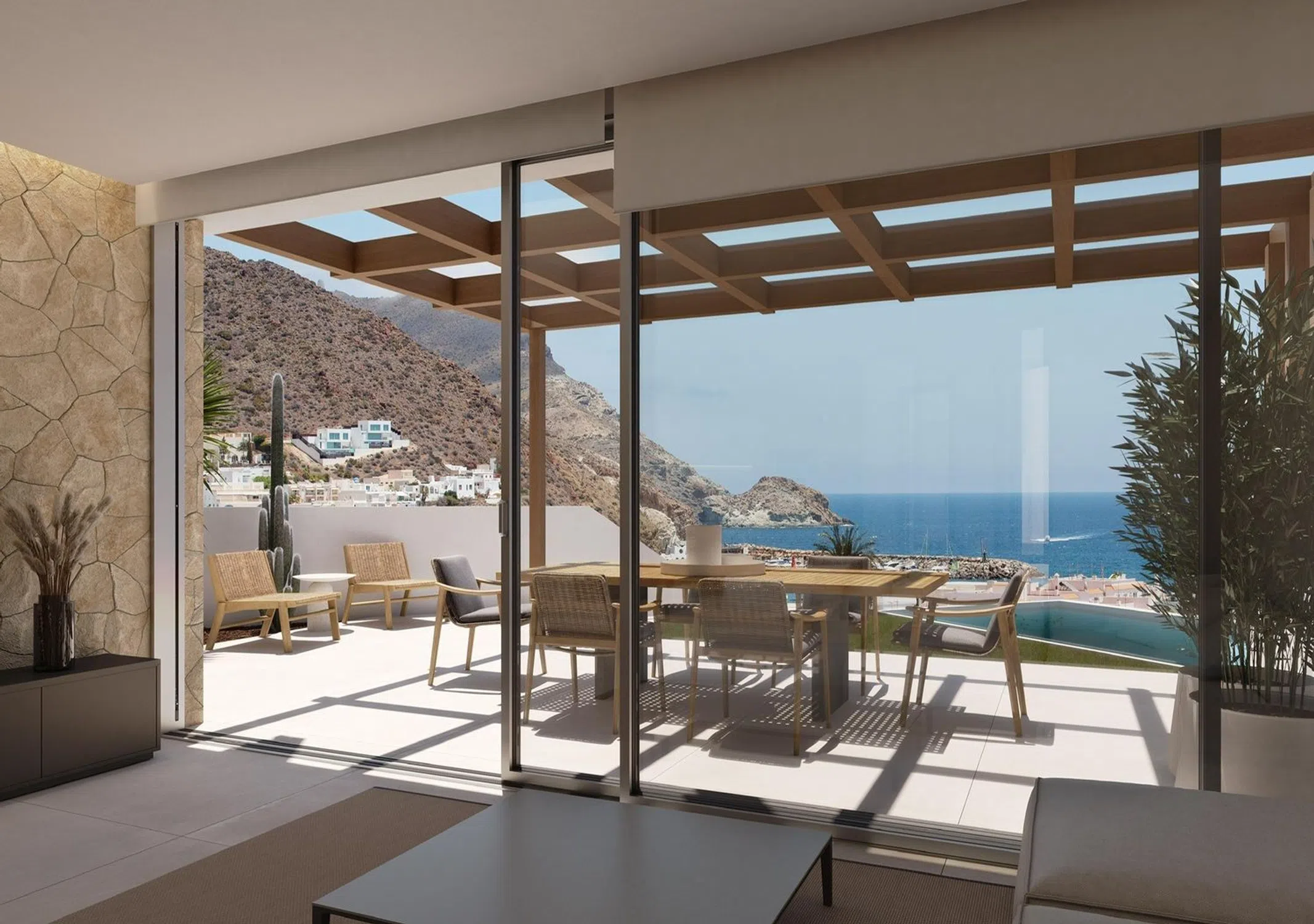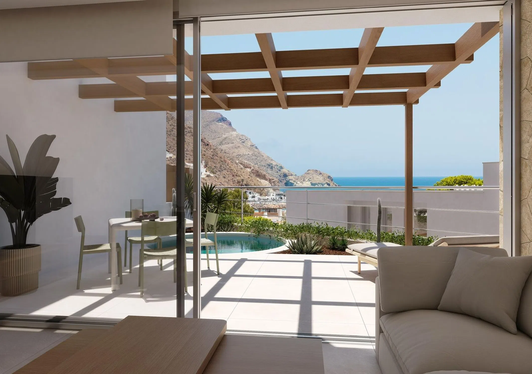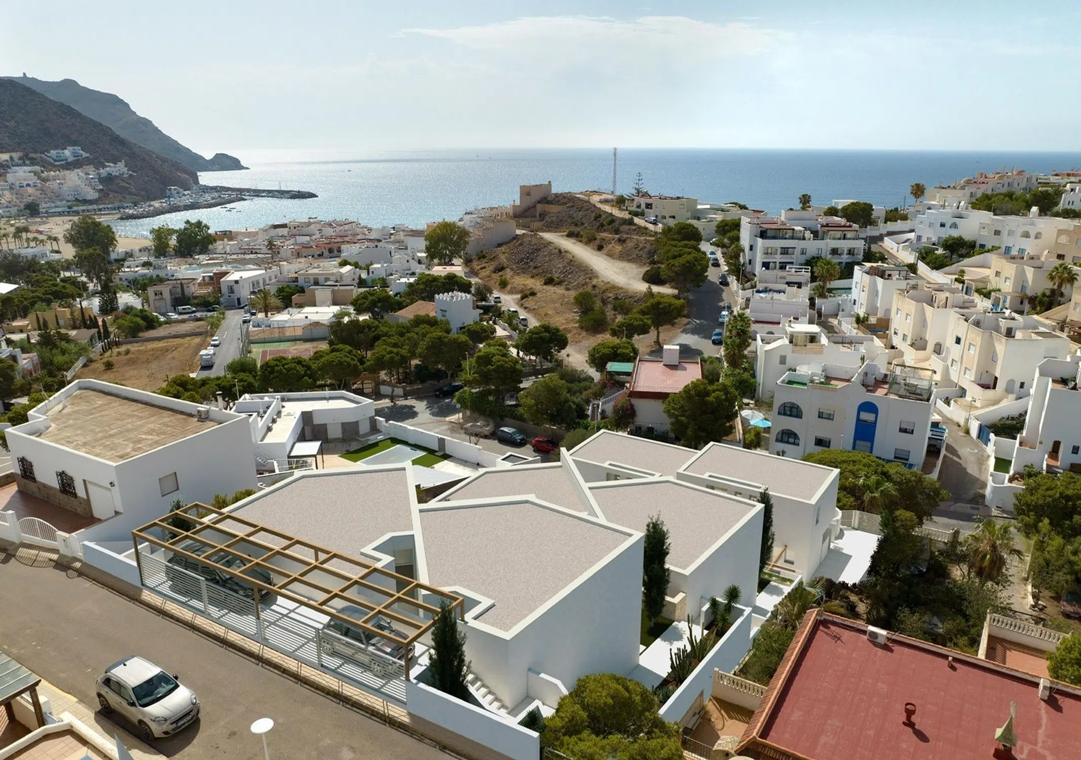 LIV Cabo de Gata. Promoción de obra nueva en San José. LIV San José, son 6 viviendas pareadas de obra nueva en la zona más tranquila de San José, cerca de todos los servicios, en la población más demandada del Parque Natural del Cabo de Gata, a 2 minutos de las Playas de Genoveses y Monsul y con bonitas vistas al mar en algunas de las viviendas. Seis únicas viviendas totalmente equipadas, de diseño moderno y funcional, amplias terrazas para disfrutar de las vistas, zona de aparcamiento, y piscina incluida en el precio. Esta única y exclusiva promoción, cuenta con espacios amplios, buenas calidades, pensadas para disfrutar de este entorno también único. Las viviendas están distribuidas de la siguiente forma: Planta baja, salón comedor, cocina totalmente equipada, aseo y zona de lavadero. Planta alta: habitación principal con baño en suite, dos habitaciones y otro baño completo. Junto a las mejores playas, calas, campo y naturaleza, esta ubicación también única te permitirá vivir de la manera más especial y como siempre habías pensado.