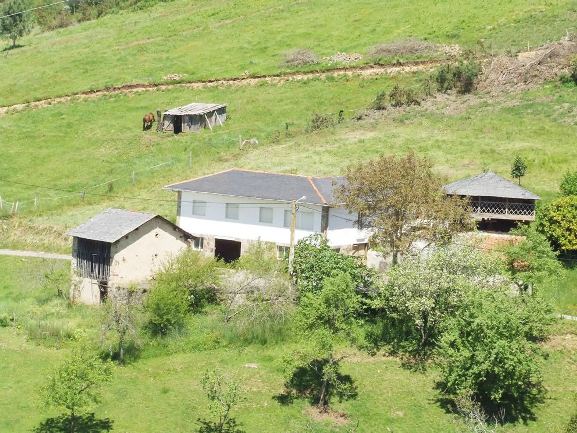 Bonita casa con hórreo, pajar y finca de 3 Has (la finca está dividida en 2 parcelas una a la parte de arriba de la casa y otra por abajo). Casa distribuida en cocina, baño, salón y 3 dormitorios. Horno de hacer pan. Agua y alcantarillado público. No calefacción. Todo el conjunto situado en un entorno natural y muy tranquilo.