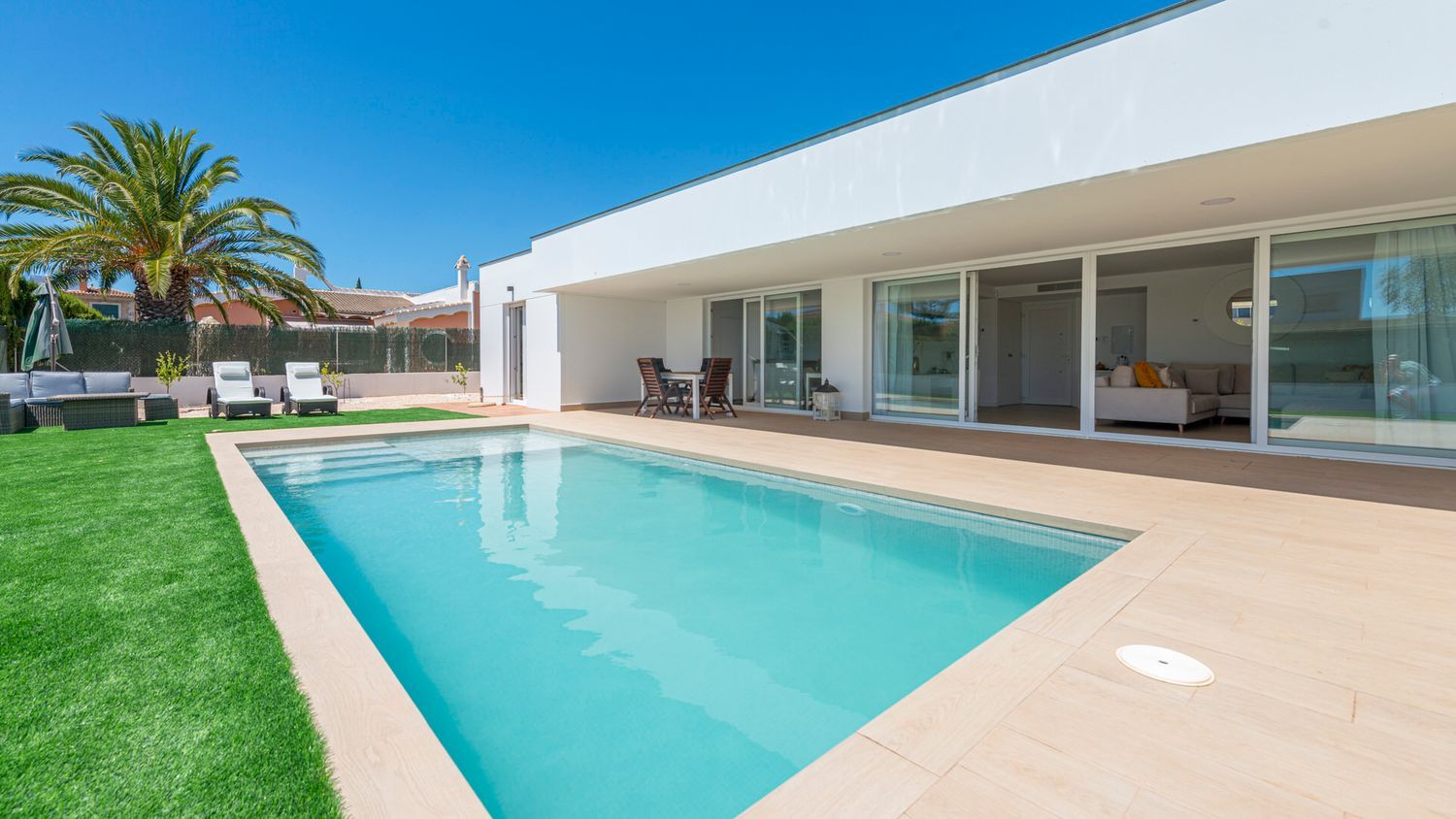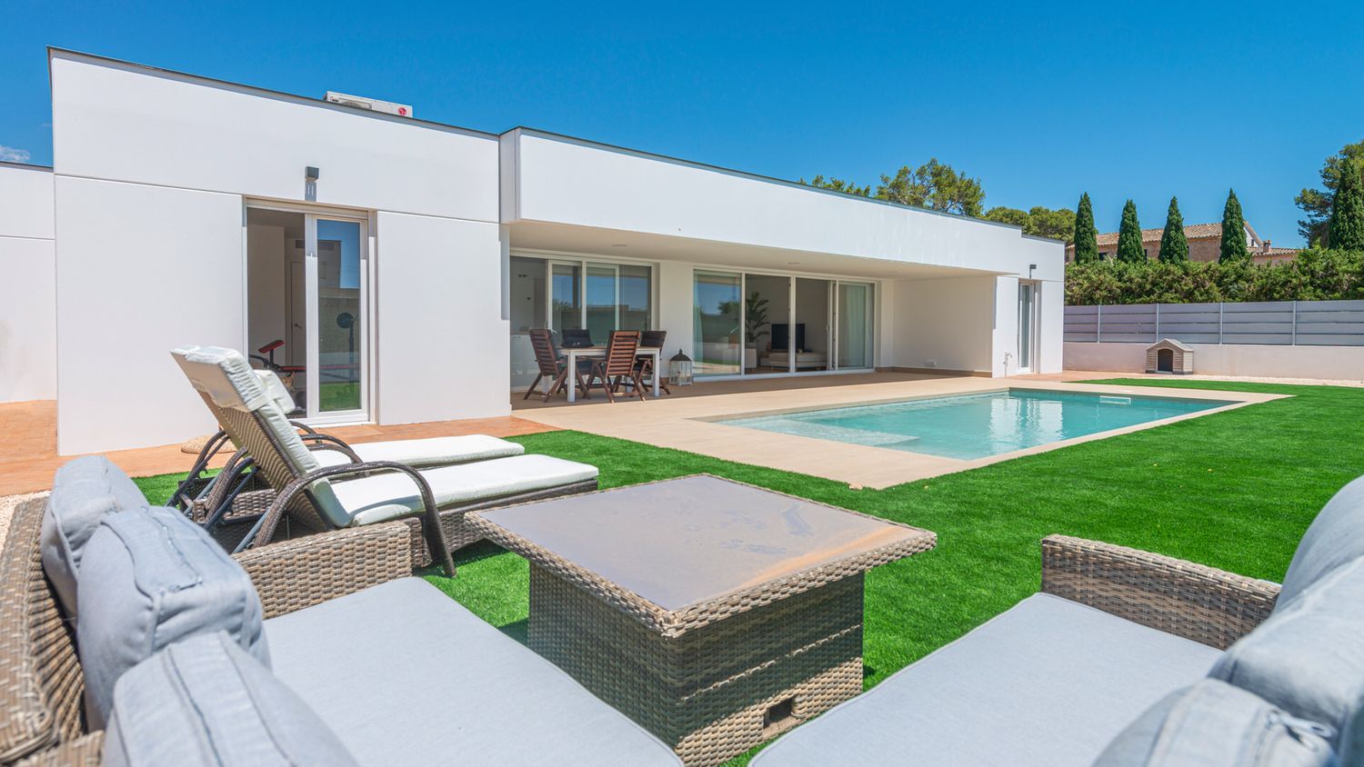 Este moderno chalet de nueva construcción estilo bungalow está situado en una urbanización de Marratxi y no está lejos del aeropuerto.La parcela ofrece una superficie de aprox. 656 m². La propiedad en ella está orientada al suroeste y fue construida en 2021. La superficie habitable de aprox. 162 m² se distribuye en una sola planta y ofrece una luminosa sala de estar, cuatro dormitorios, tres baños, una cocina moderna y totalmente equipada, así como un lavadero. La zona exterior de la casa consta de un jardín con piscina y una terraza parcialmente cubierta. Plazas de aparcamiento para dos vehículos completan esta oferta.