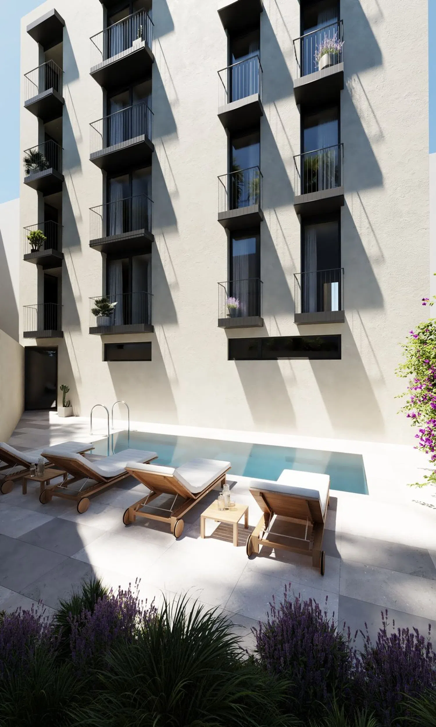 This building under construction will consist of five floors, all accessible via an elevator. Additionally, residents can enjoy a community swimming pool. The homes are designed with dual orientation and feature large windows, optimizing natural light and allowing for unobstructed views. The apartments come in options of two and three bedrooms.
