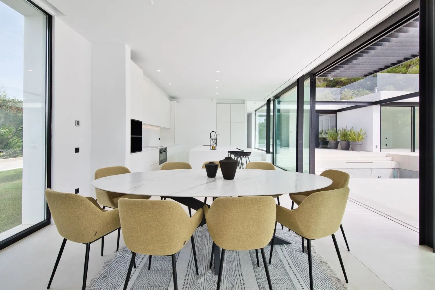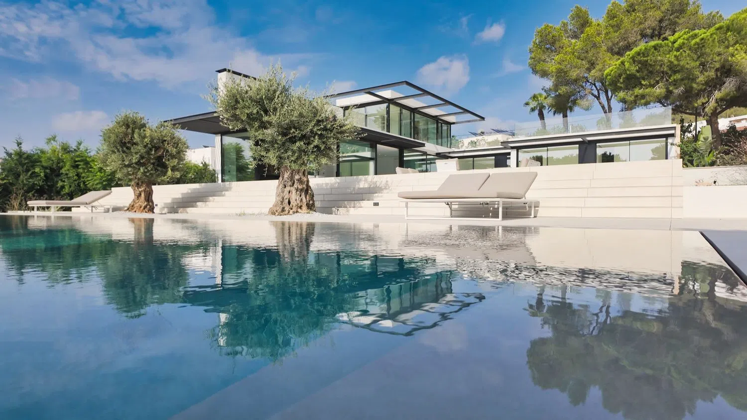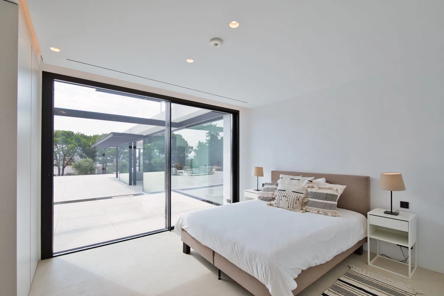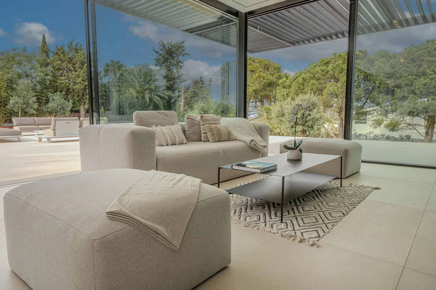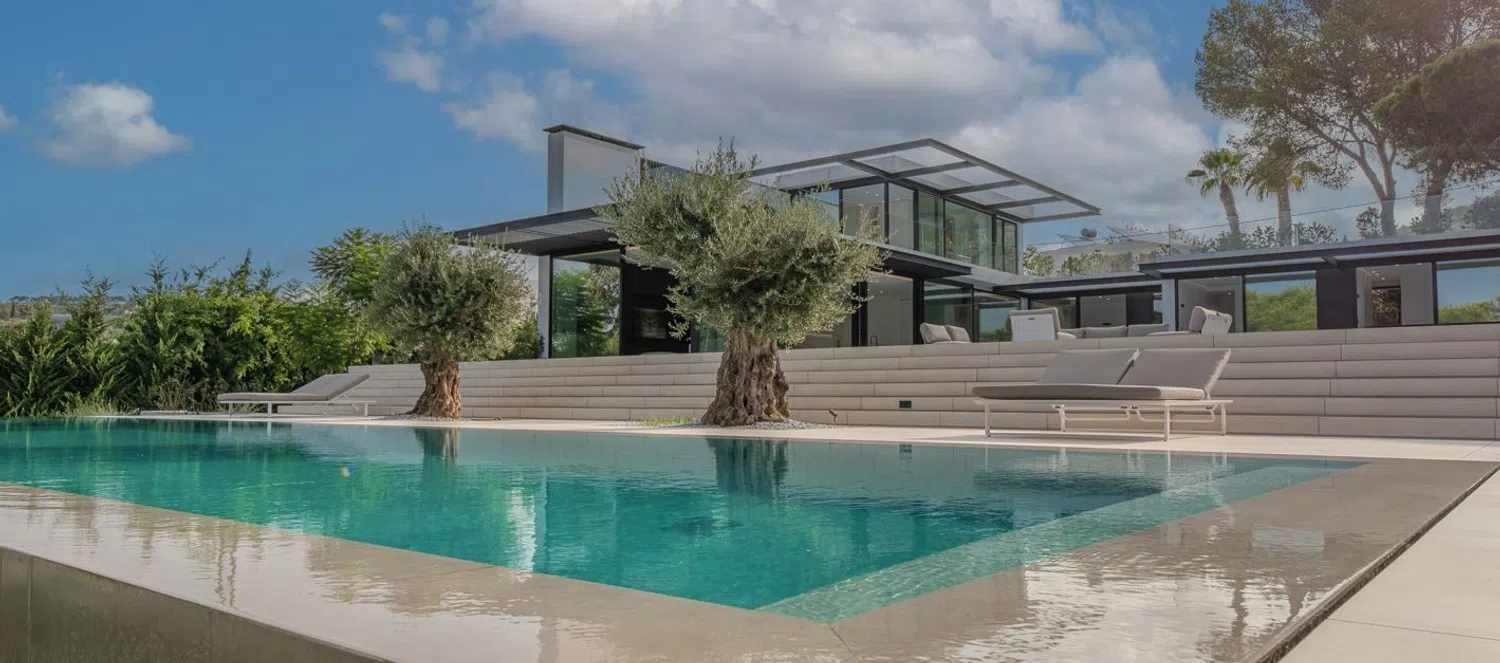 The villa has been designed to emulate the luxury of a high-end hotel suite. Each bedroom is equipped with state-of-the-art technology, including television, RJ45 connection, electric blinds, and an en-suite bathroom, along with integrated wardrobes. The materials and finishes are of high quality, ensuring comfort in all aspects. The villa offers optimized insulation and features a dual-flow ventilation system, underfloor heating, and a reversible hot-cold air conditioning system. The pool, in addition to being climatized, is equipped with a cover for added convenience.