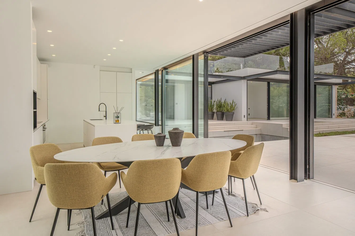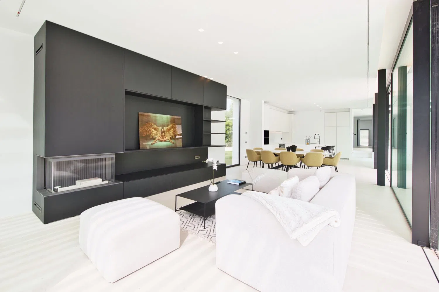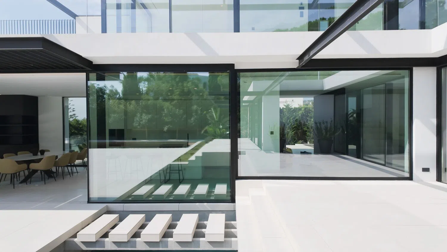 With cutting-edge design, the property offers four garden-facing bedrooms, each with its private bathroom and dressing room. One of the bedrooms has a separate entrance, perfect for a potential nanny. The reception areas are spacious and feature a fully equipped kitchen with high-end furnishings that opens towards a charming koi pond. The adjacent dining and living areas boast a cozy wood fireplace, creating a warm and sophisticated atmosphere. The electric windows throughout the property provide continuous views to the outside, harmoniously integrating with the terraces.
