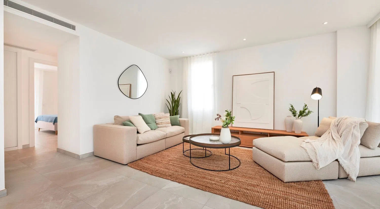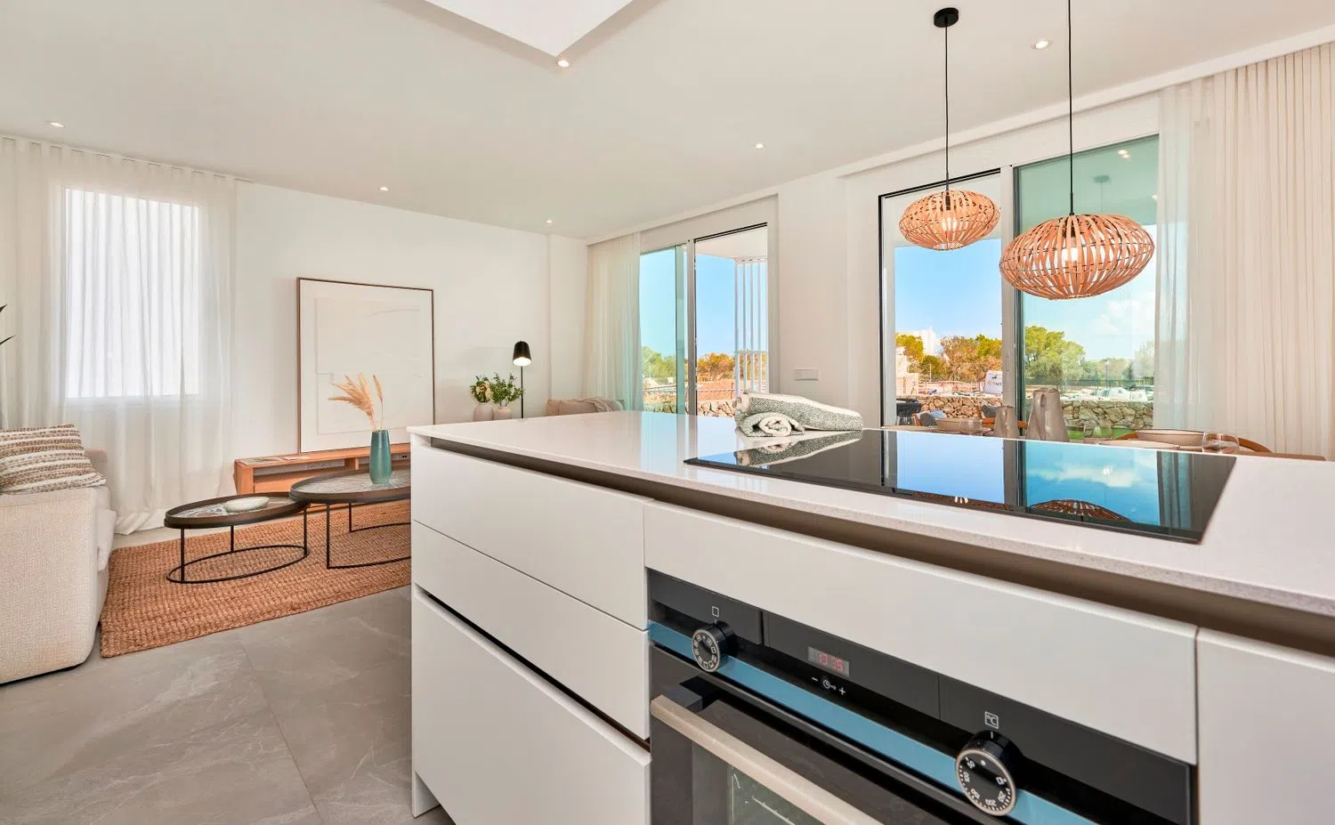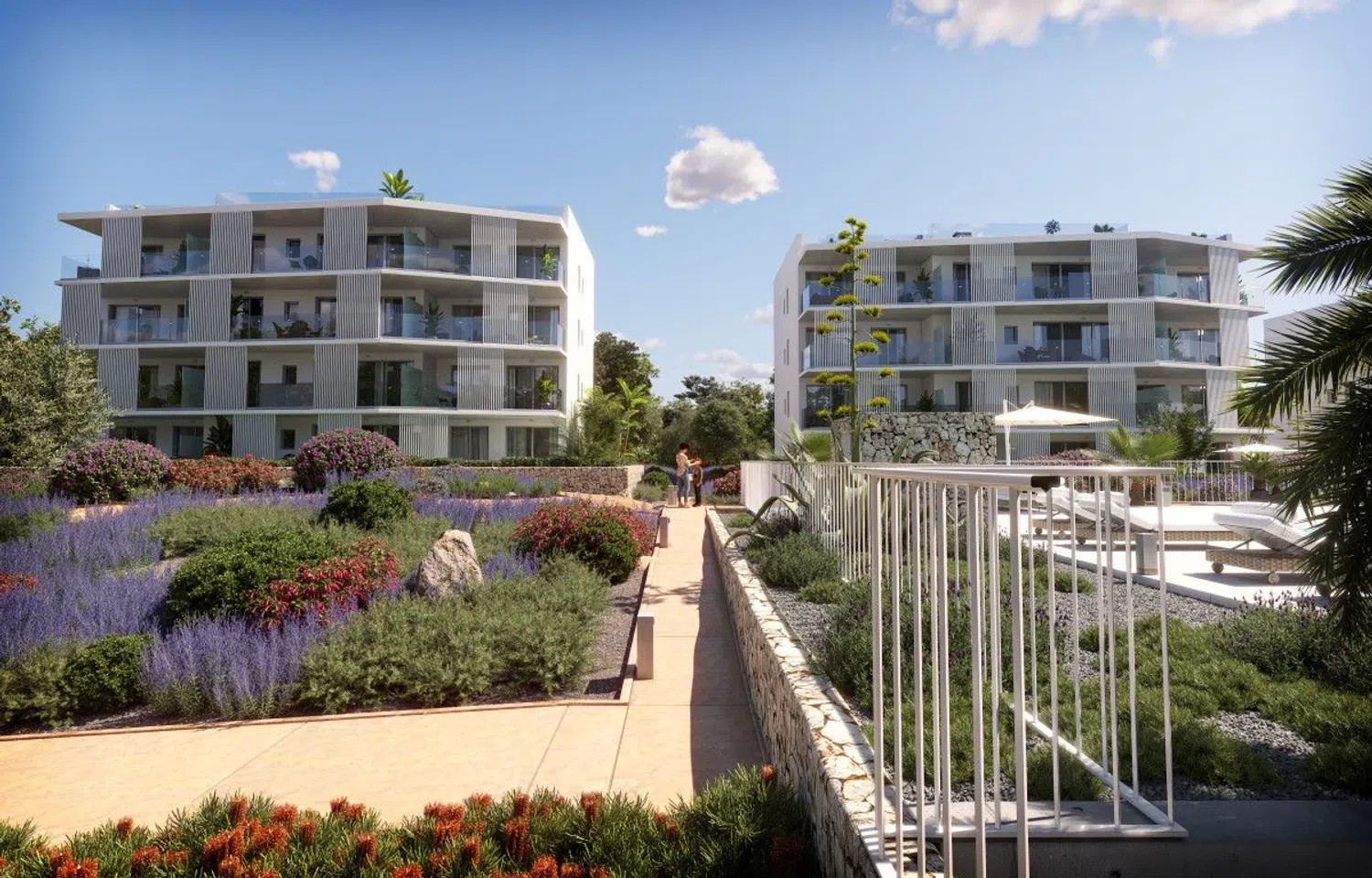 All apartments are designed to maximize natural light, featuring a spacious living room that opens to the terraces and integrates a kitchen-dining area. These homes have two double bedrooms and two bathrooms, one of which is en suite. Each residence includes a surface parking space and an underground storage room. The construction will feature high-quality finishes, such as furnished kitchens in light tones with matching countertops, equipped with an induction hob, oven, and extractor hood. The bathrooms are outfitted with modern suspended wooden furniture and elegantly designed showers.