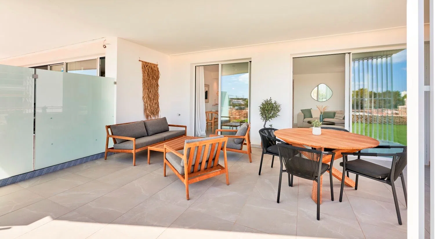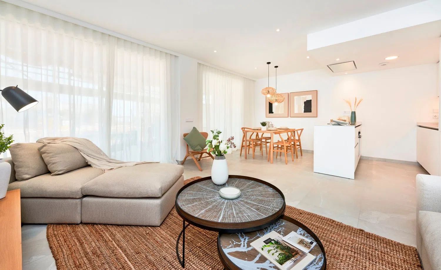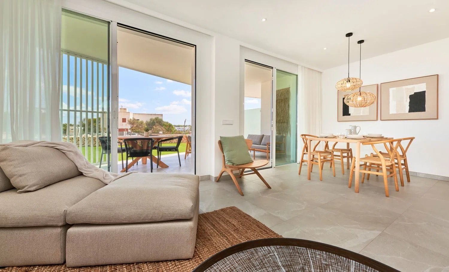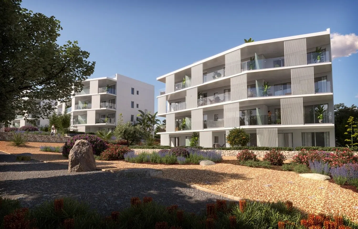 All apartments are designed to maximize natural light, featuring a spacious living room that opens to the terraces and integrates a kitchen-dining area. These homes have two double bedrooms and two bathrooms, one of which is en suite. Each residence includes a surface parking space and an underground storage room. The construction will feature high-quality finishes, such as furnished kitchens in light tones with matching countertops, equipped with an induction hob, oven, and extractor hood. The bathrooms are outfitted with modern suspended wooden furniture and elegantly designed showers.