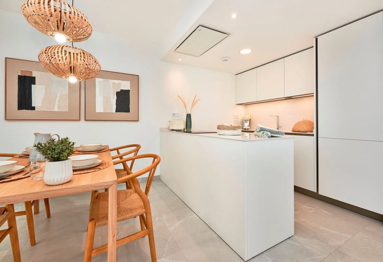 A large-format porcelain tile has been chosen for the interiors, extending with its non-slip version on the terraces. The air-air climate control system with a heat pump and a hidden Split system in the false ceiling will ensure comfort all year round. Additionally, an aerothermal system will be employed for hot water production. This modern and efficient project is set to be completed in the third quarter of 2024, with an energy certificate of A.