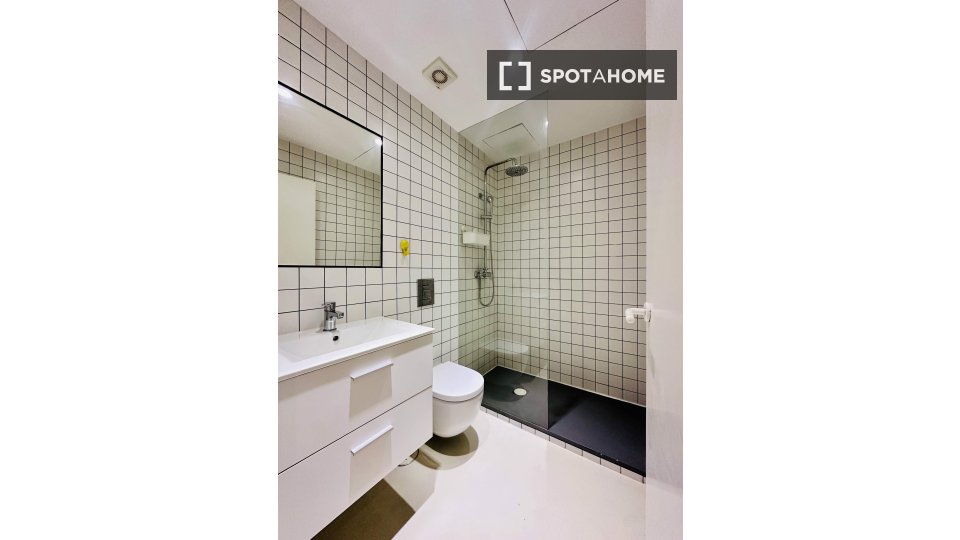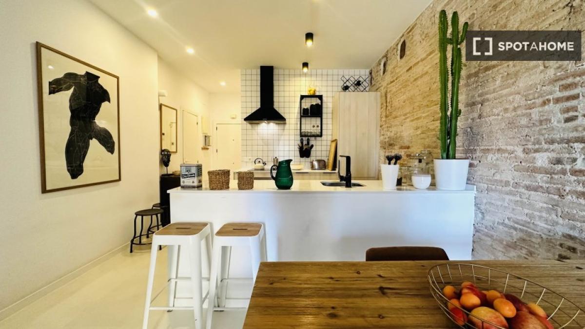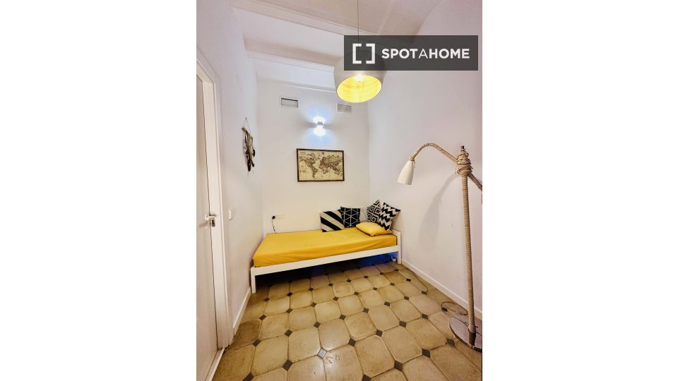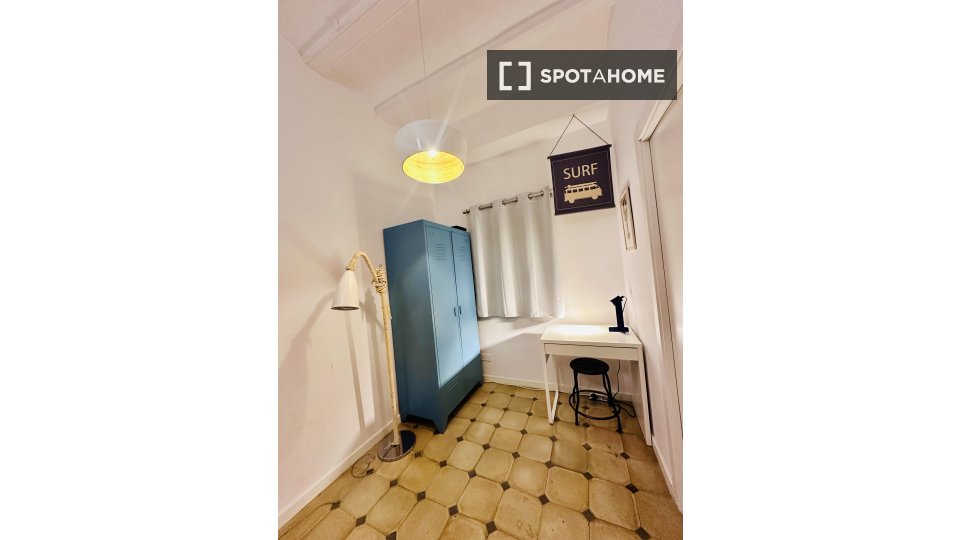 This is a spacious room in a shared 2-bedroom apartment located in an energetic part of El Raval, Barcelona. The room features modern furnishings, a balcony, and access to essential amenities such as a well-equipped kitchen complete with a dishwasher and oven. Central air conditioning ensures comfort, and all utility bills, including WiFi, are covered.