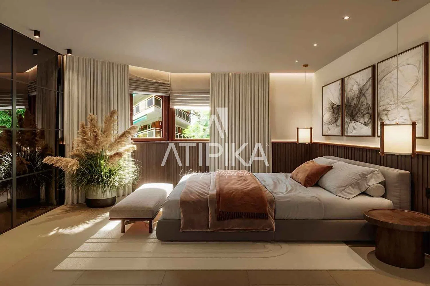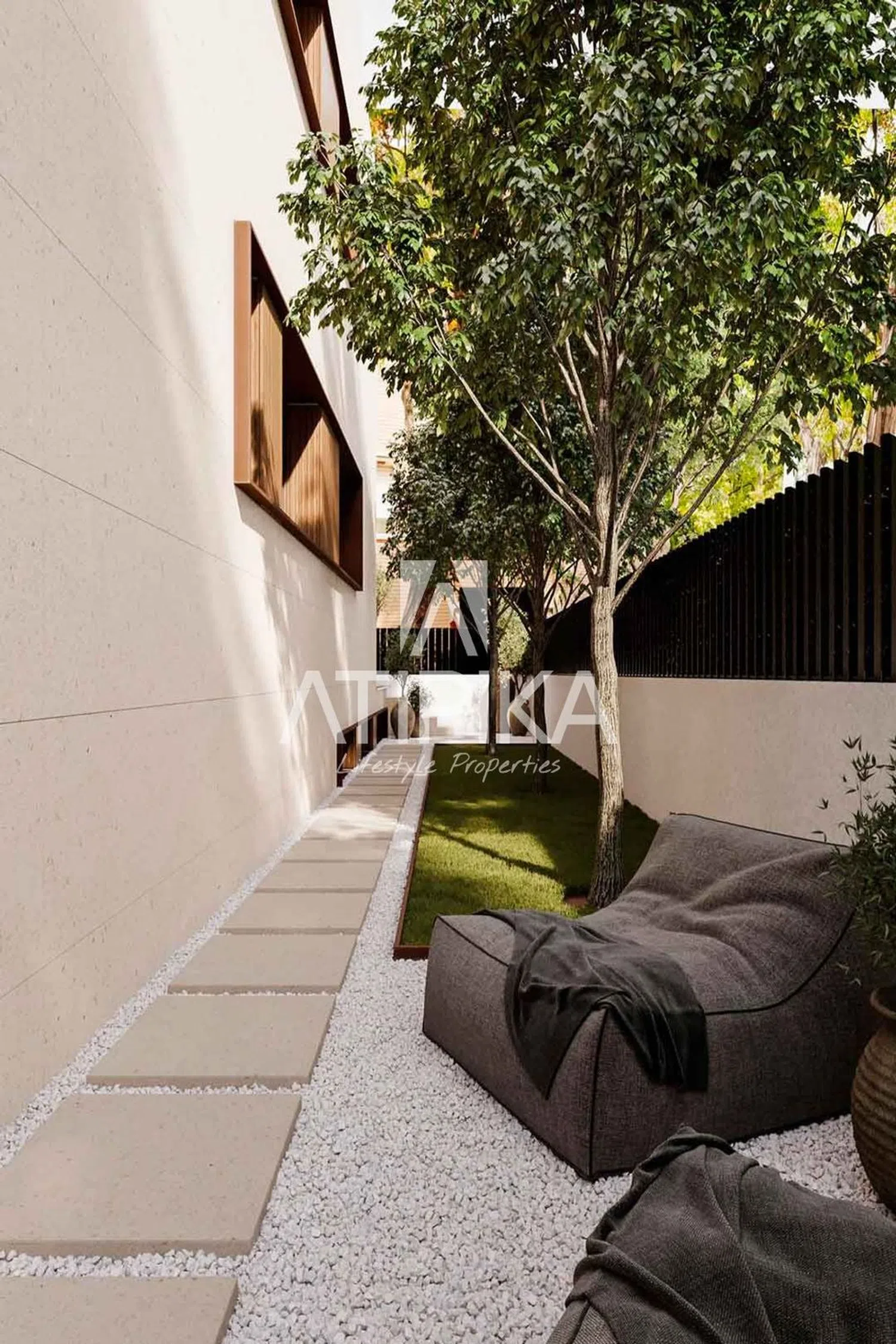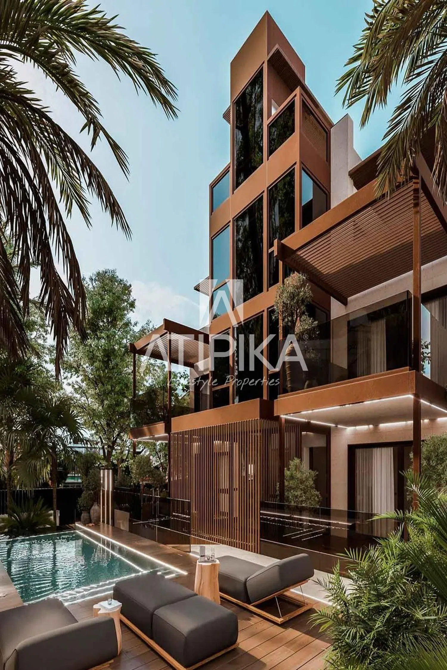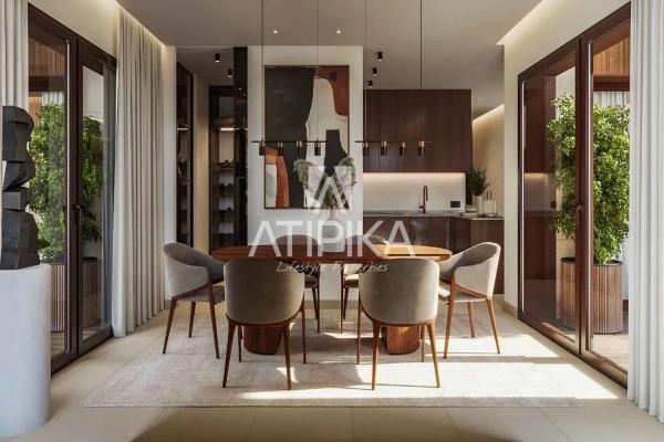 The common areas of this exclusive community are designed to offer maximum comfort and enjoyment. A dreamlike garden with an overflowing swimming pool covered in cream-colored mosaic creates wonderful turquoise reflections. Access to different levels is both aesthetically and functionally delightful, thanks to a distinctive staircase and a glass panoramic elevator. Inside, the homes are characterized by a blend of practicality and stylized design. The living rooms open to kitchens with islands and varnished oak furniture, complemented by Dekton countertops and integrated appliances that maintain a cutting-edge appearance.