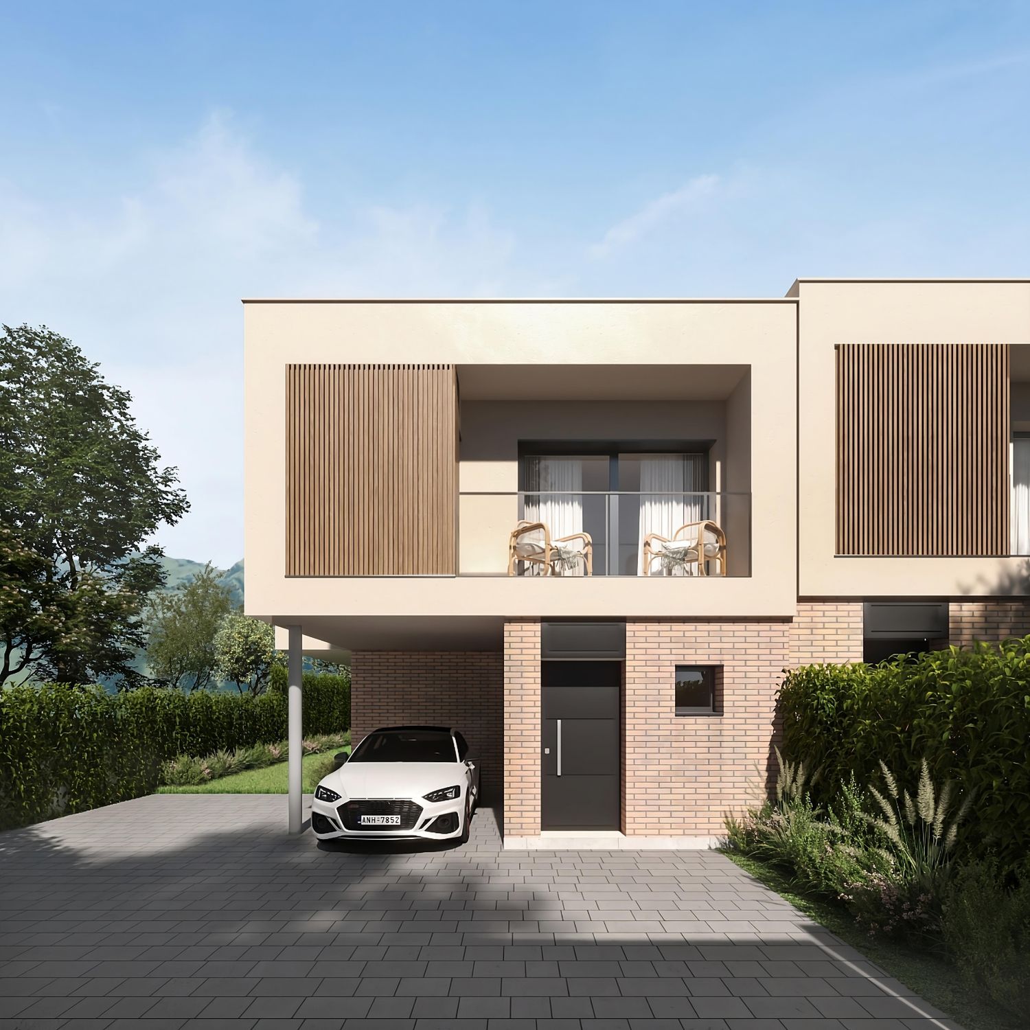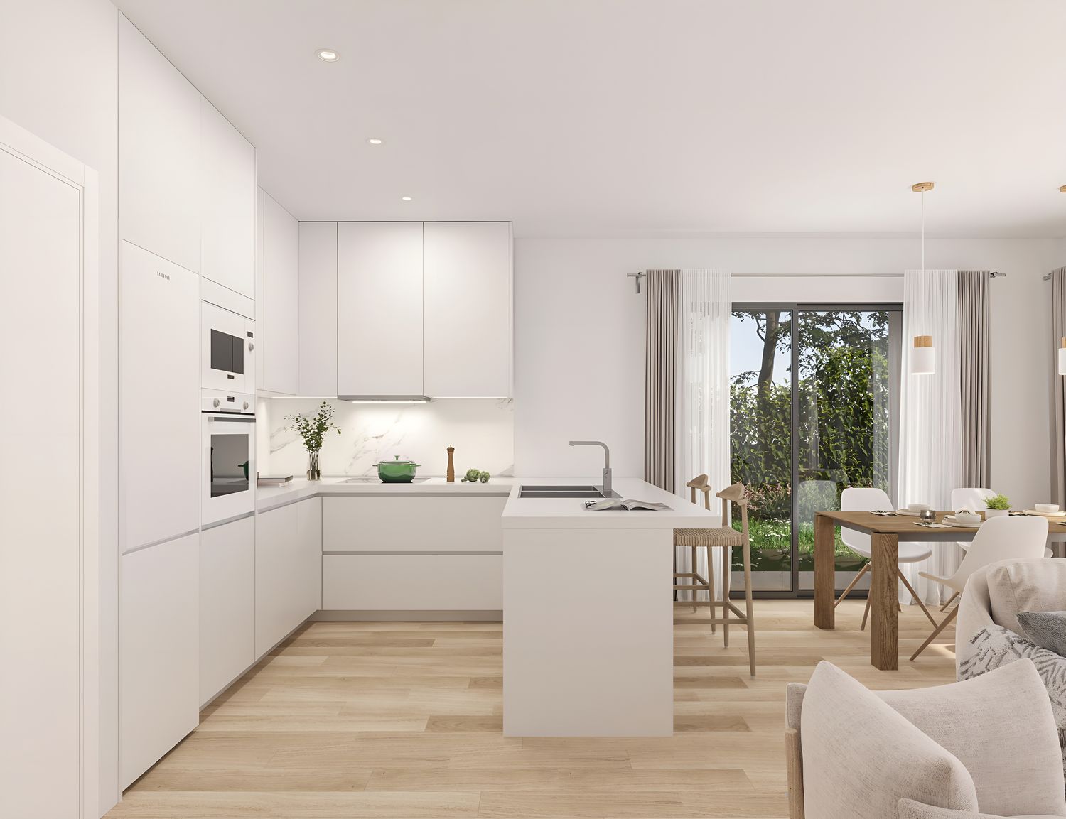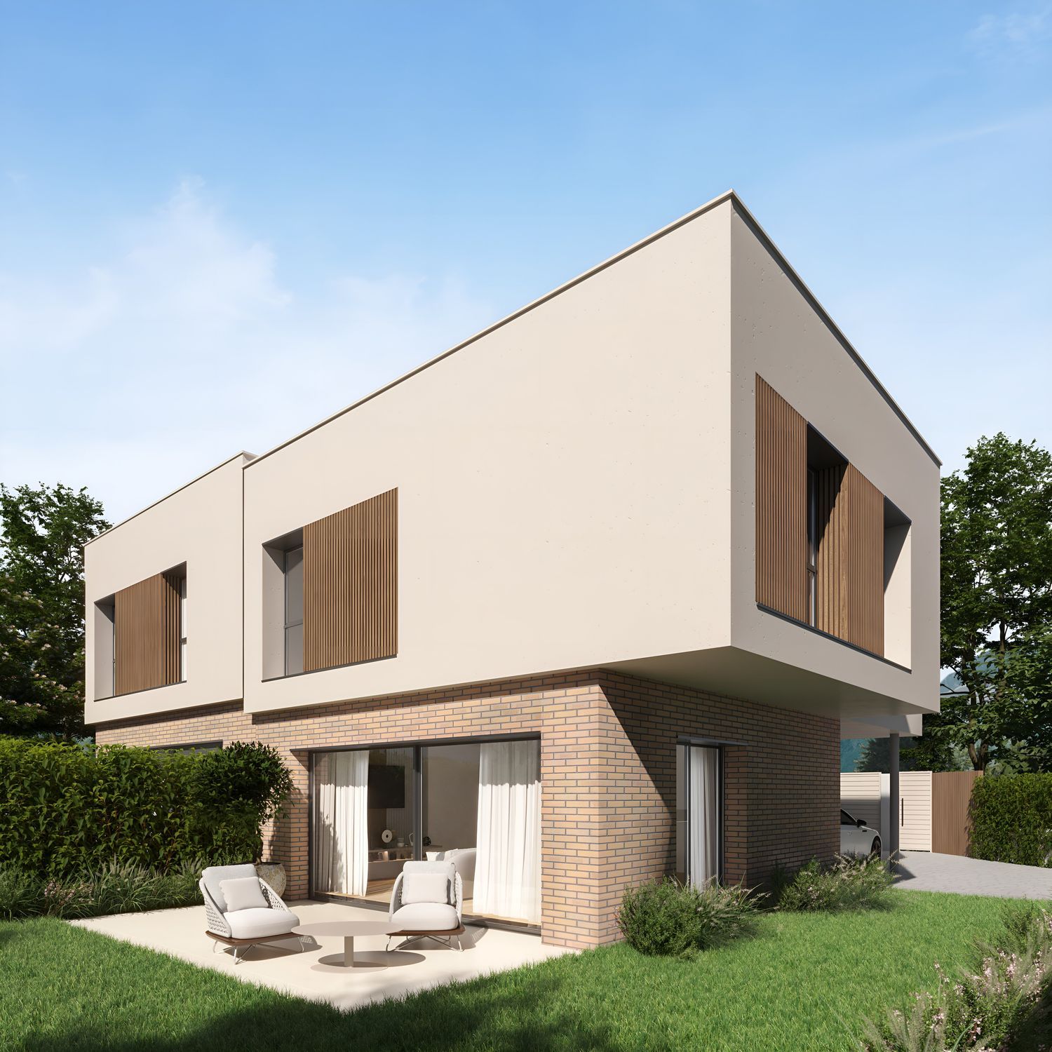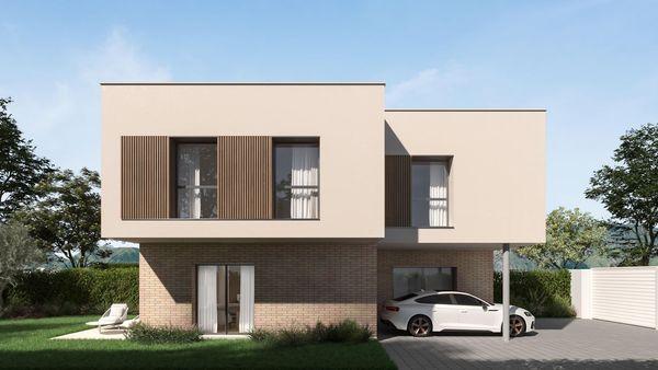 The ground floor delights with large glass windows, infusing the open-plan kitchen and living area with natural light and offering seamless access to the garden, where an expansive terrace awaits. In addition to the kitchen, living room, a toilet, and laundry room, the ground floor includes a versatile room, perfect as a playroom, study, library, or additional bedroom. An open staircase leads to the upper floor, designated as the night area, comprising a master suite and three additional bedrooms sharing a generous bathroom.