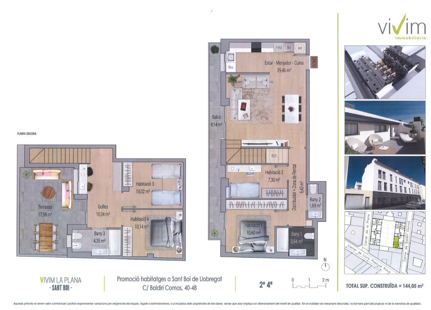 Residencial la Plana, situado en la zona centro de Sant Boi de llobregat, plantas bajas duplex con piscina propia, entrada independiente, áticos duplex con terraza, parquings opcionales. Obra nueva con acabados modernos y sostenibles, domótica, parquet, aerotermia, ventanas aluminio, etc. Ubicada junto a colegios, supermercados, centros deportivos, zona comercial, centros asistenciales, ferrocarril, autobus.
