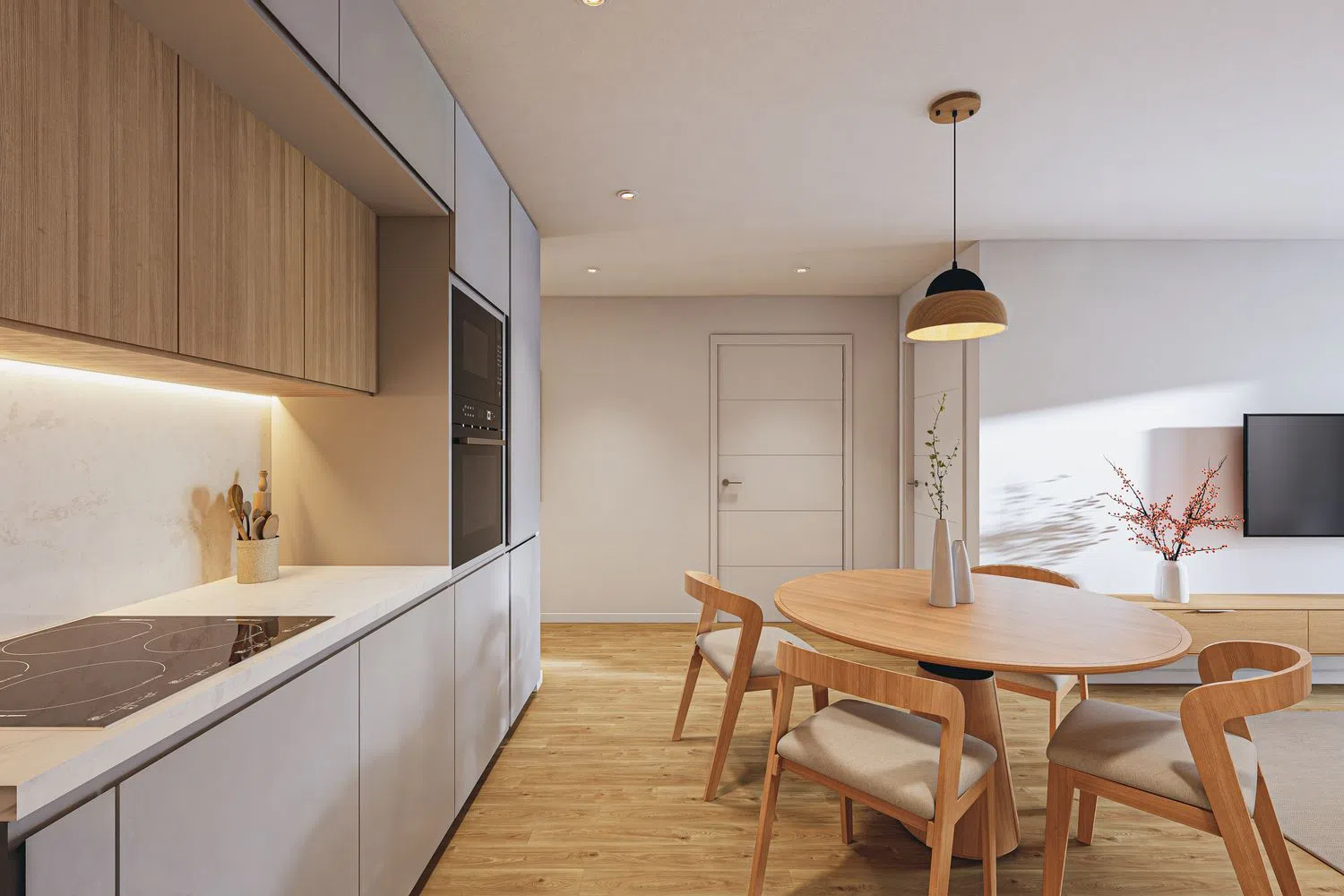 Inside, you'll find oak laminate flooring that is exceptionally water-resistant, and sturdy interior doors add to the durability and aesthetic appeal of the space. The bathroom is fitted with high-quality fixtures and furniture, while the ergonomically designed kitchen comes fully equipped with modern appliances, including a dishwasher. The ducted air conditioning with an aerothermal system offers superior energy efficiency.