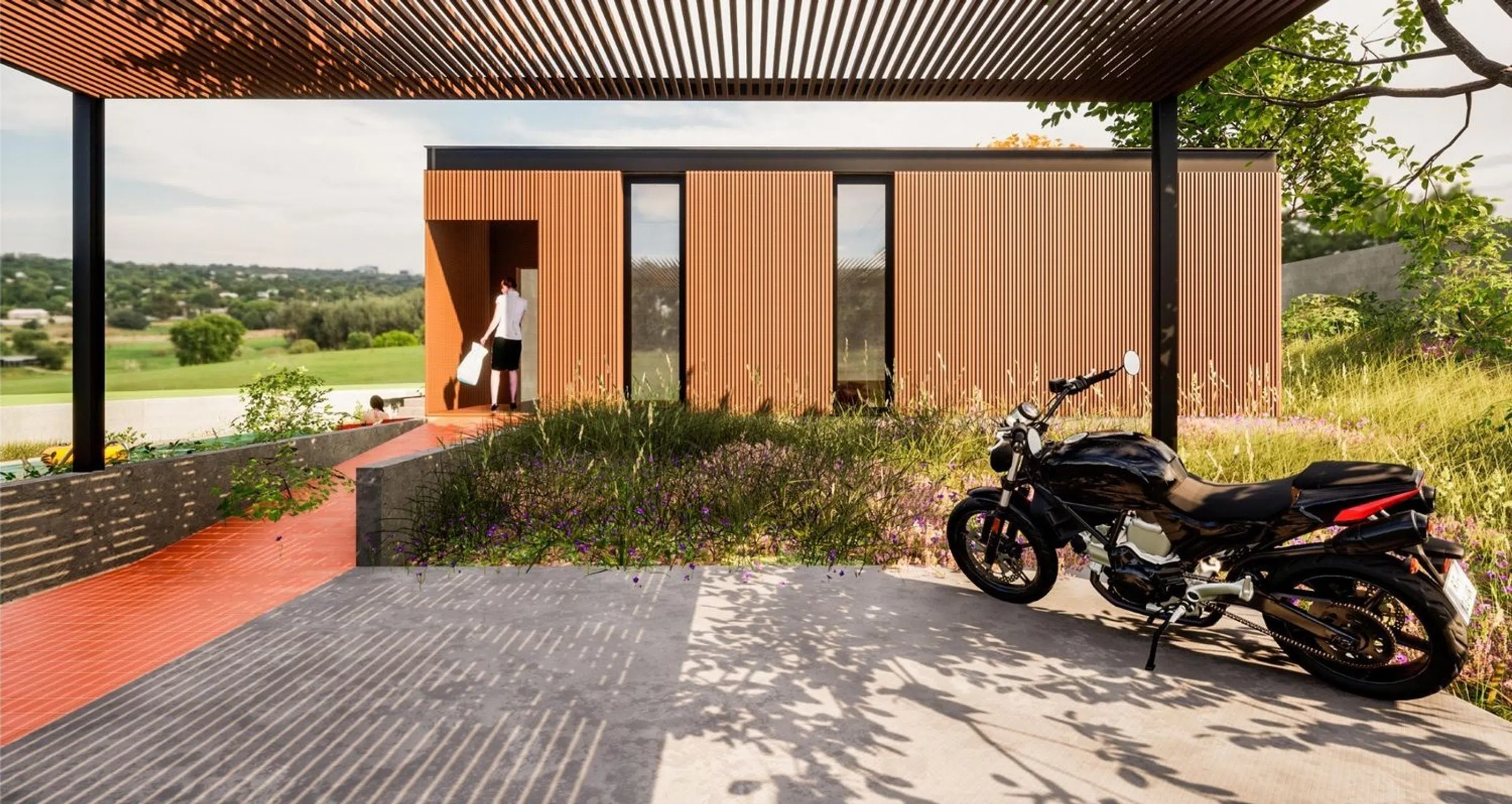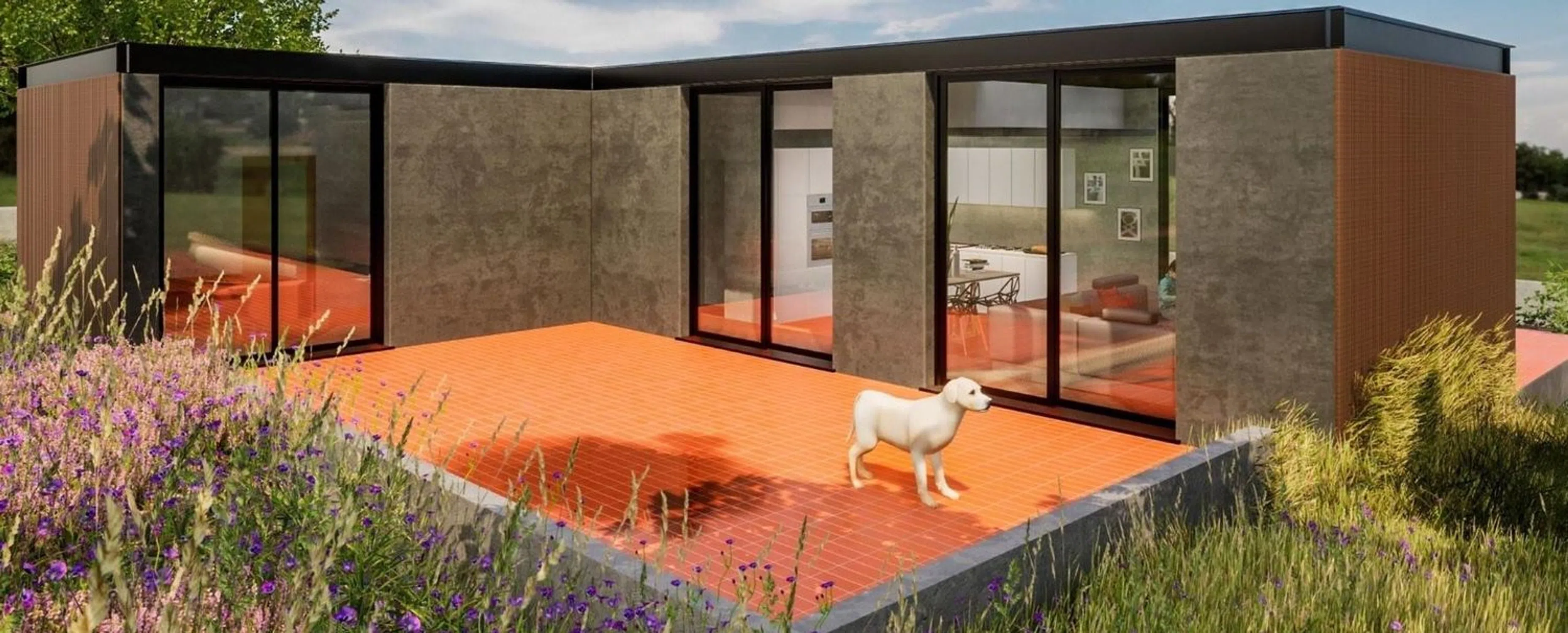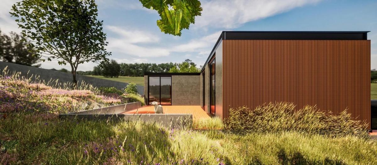 The price includes technical fees, foundation and earthworks, pavement in parking and exterior areas around the home, loading and unloading of the housing module, wooden slat facade with cement chipboard cladding, gravel roof, aluminum windows with double glazing, white lacquered MDF doors, bathrooms equipped with washbasin, bathroom furniture, shower with screen, and toilet.