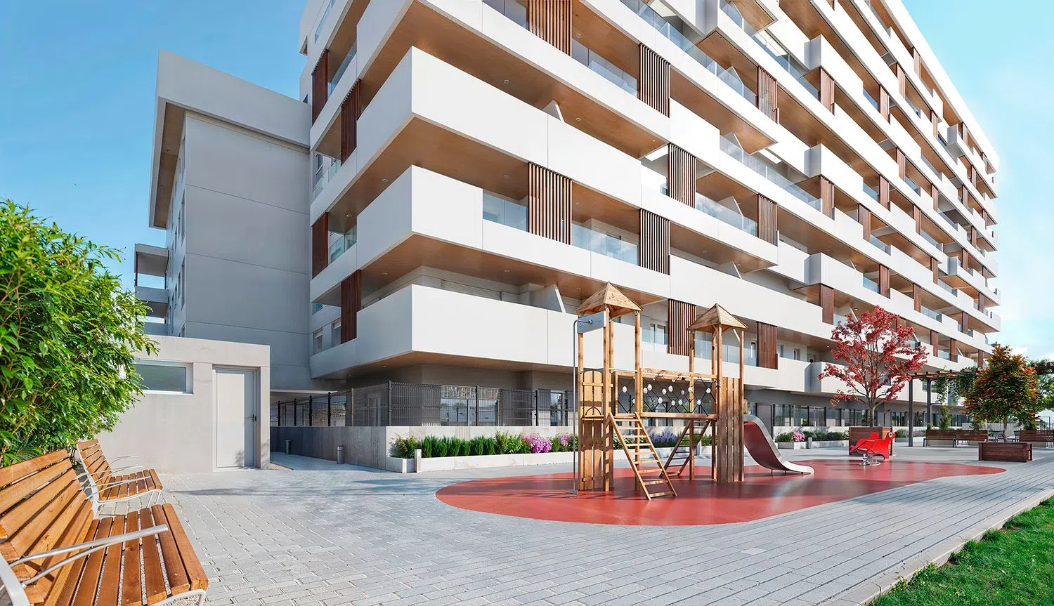 The development is complemented by extensive communal areas, including a pool, lush gardens, and children's play zones. Sustainability is a cornerstone at , ensuring thermal comfort while respecting the environment. Features include aerothermal systems for underfloor heating, hot water, and air conditioning, photovoltaic panels, and separate drainage networks for greywater collection and reuse of rainwater and greywater.