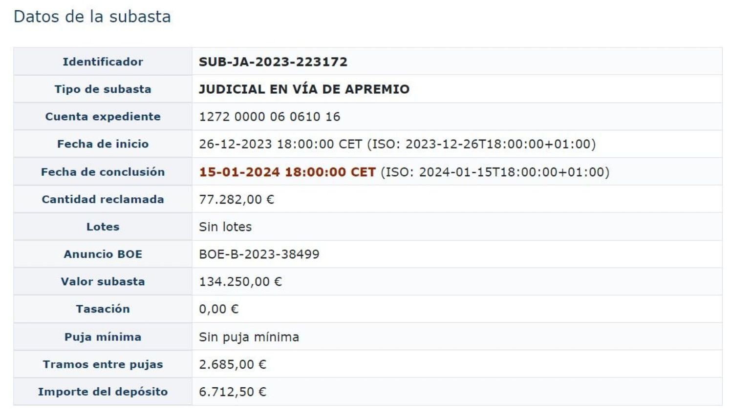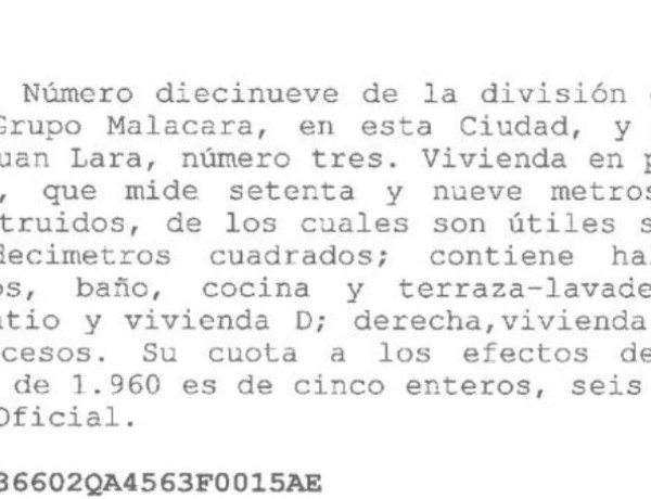 ****SUBASTA BOE SUB-JA-2023-223172 CIERRE DE SUBASTA el 15/01/2024******NO VISITABLE**REFERENCIA CATASTRAL: 6936602QA4563F0015AELa adquisición del inmueble publicitado en este anuncio se realizará exclusivamente en el marco del proceso de subasta judicial en el que se encuentra. El importe publicado ha de ser considerado como el importe mínimo en base a la cual la parte acreedora no superará la puja, es decir, si la puja fuese inferior al importe publicado, la empresa acreedora lo superará. En caso de que la puja sea superior al importe publicado, el acreedor no superará el importe.Toda la información aquí publicada se encuentra disponible de manera pública en el BOE.En el enlace adicional se puede pinchar directamente.