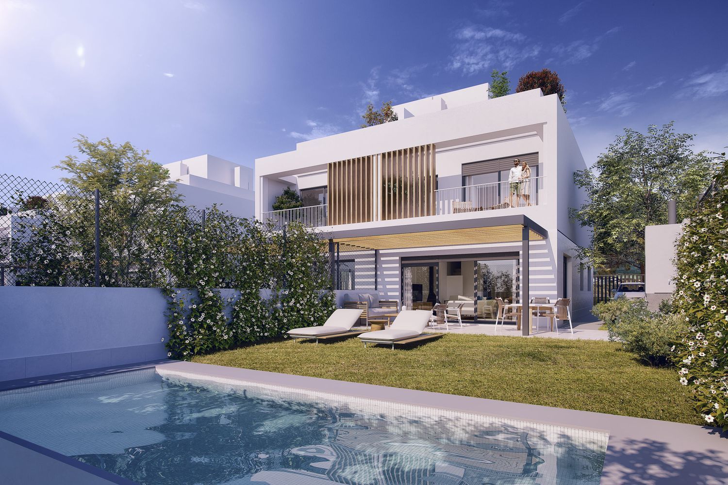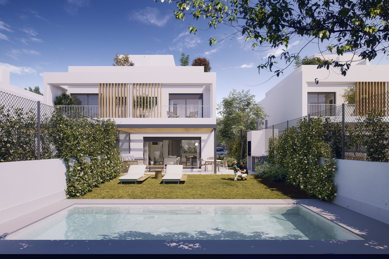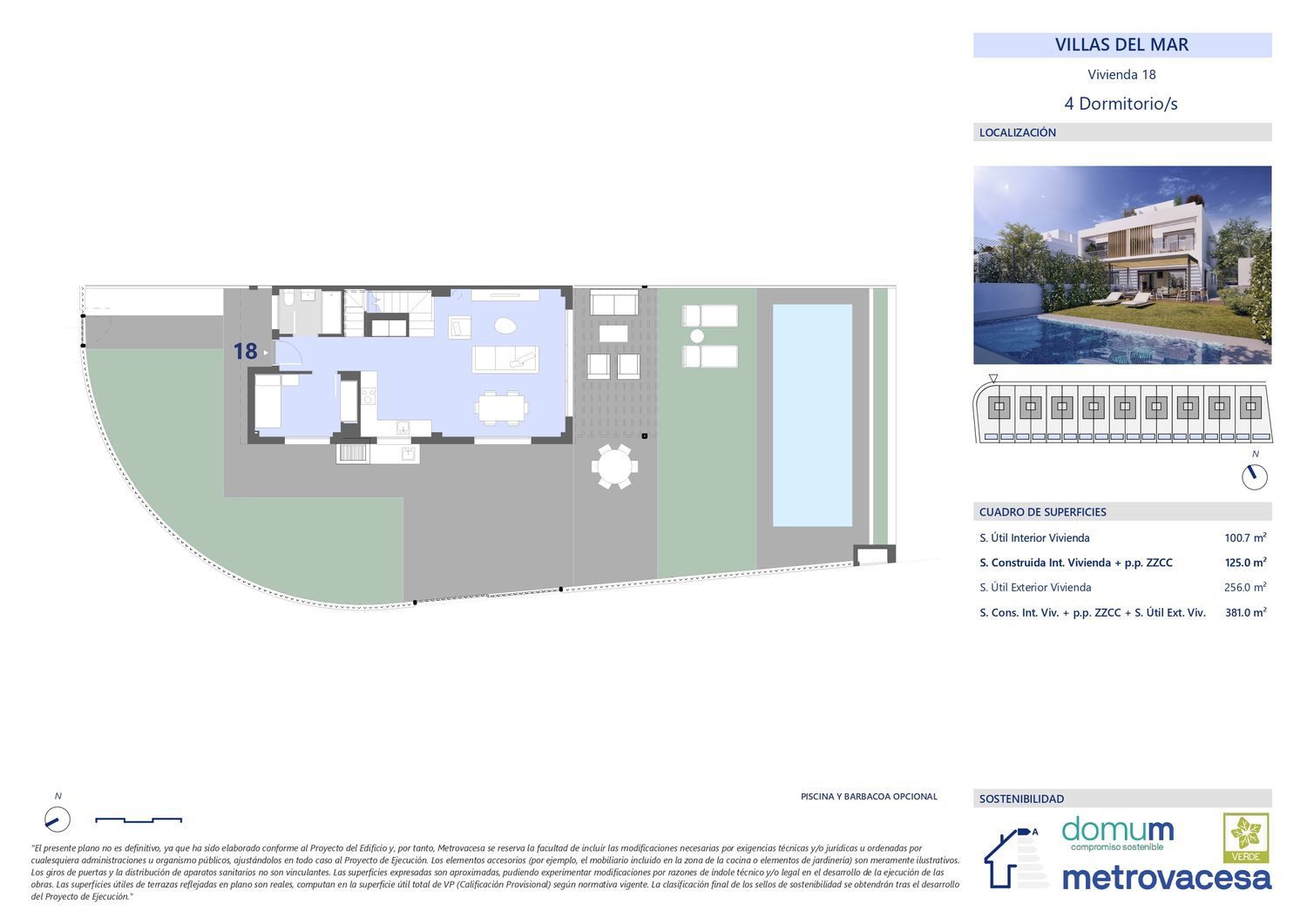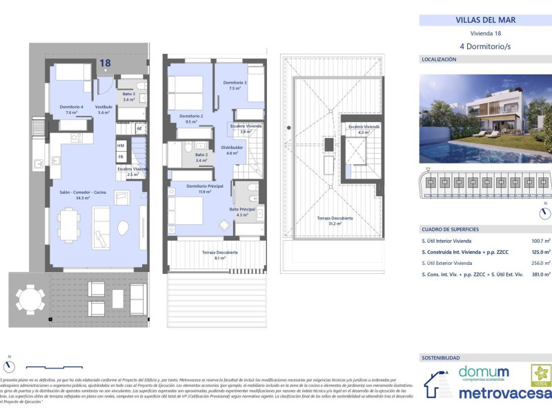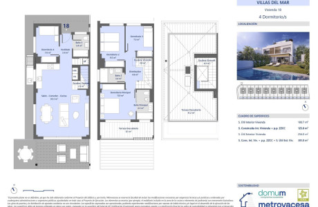 Complejo de 18 villas pareadas en 1ª linea de playa. Distribuidas en 3 plantas. Planta baja con salón comedor cocina, dormitorio y baño de cortesía. Planta 1ª zona noche con 2 dormitorios, baño y dormitorio principal con baño en suite. Planta 3 planta solárium. La vivienda en su planta baja dispone de espacio exterior con plaza de aparcamiento privado y zona terraza exterior con espacio preparado para jardín. Se puede optar entre opciones de personalización sin coste y opciones con sobre coste. de estas últimas entre otras podrás optar por que te instalemos piscina y/o barbacoa.
