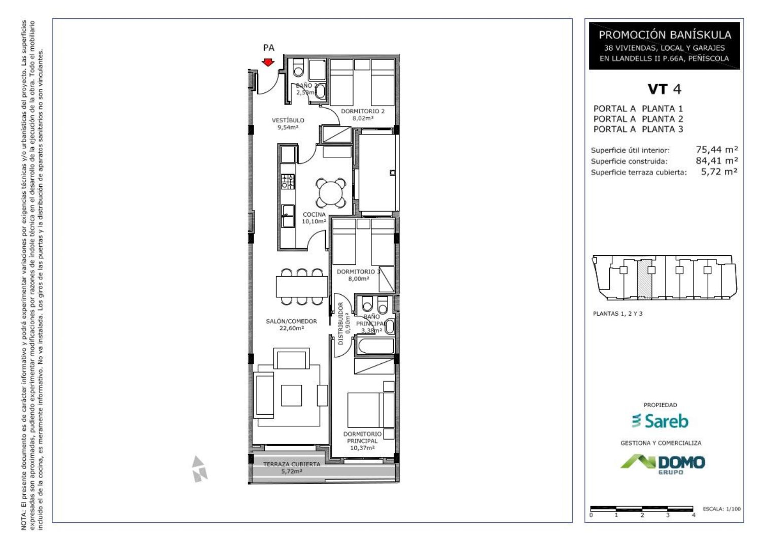 Promoción de 38 viviendas en altura de 3 y 4 dormitorios, con 33 plazas de garaje, 5 plazas de moto y un local comercial situada en la calle Landells 16, de Peñíscola. En un edificio de 4 plantas sobre rasante y una planta sótano.El total de viviendas, 32 son de 3 dormitorios y 6 de 4 dormitorios. Todas cuentan con terrazas.Promoción propiedad de Sareb.Peñíscola se ubica al Norte de la Comunidad Valenciana, en un punto privilegiado del Mediterráneo español. Es un municipio en la costa de Castellón, a 50 km al norte de esta ciudad. Es una importante zona turística, especialmente en verano.El edificio se encuentra en la calle Llandels 16, a unos 7 minutos andando de la Platja de Peñíscola y a 9 minutos de la Platja del Migjorn situada junto al puerto. Ponte en contacto con nosotros para ampliar información o reservar vivienda. También puedes pinchar en el enlace de nuestra página Web y dejarnos tus datos, para ponernos en contacto contigo.Algunas viviendas incorporan plaza de garaje con un precio adicional de 7.000 € + IVA.