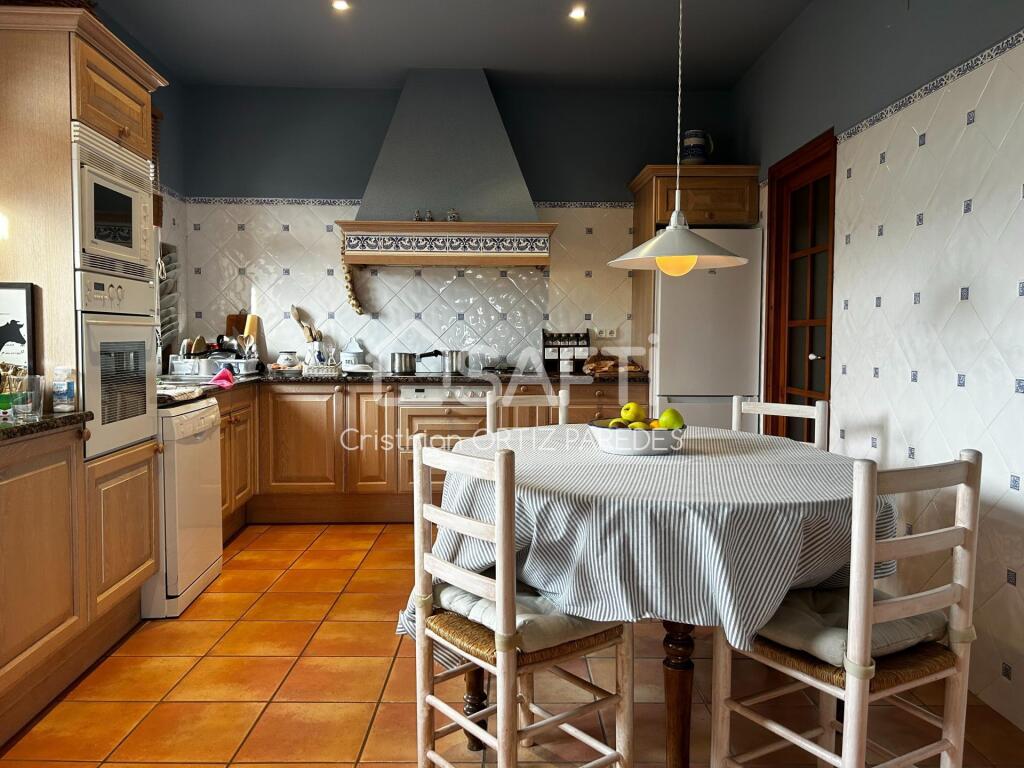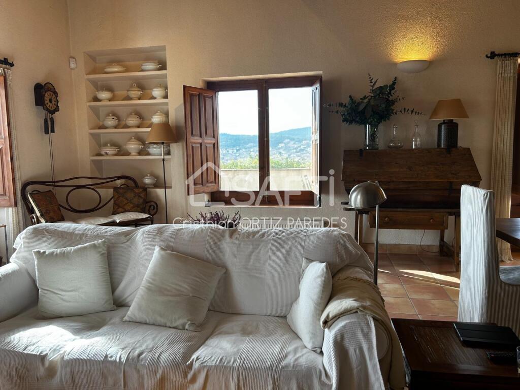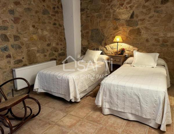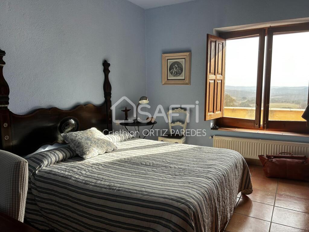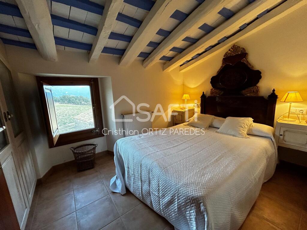 La casa principal está distribuida en tres plantas y dispone de seis dormitorios; un amplio salón-comedor con techos altos, una gran chimenea y puertas acristaladas con acceso a una gran terraza con vistas; una acogedora cocina rústica; un salón independiente; un patio interior y una sala de juegos.