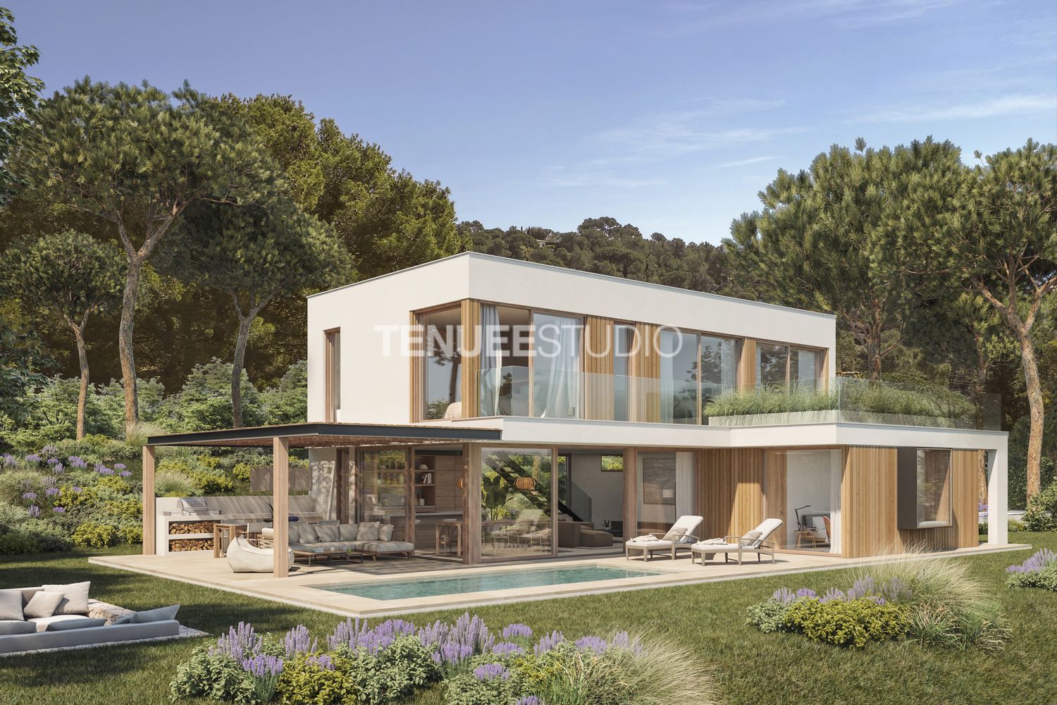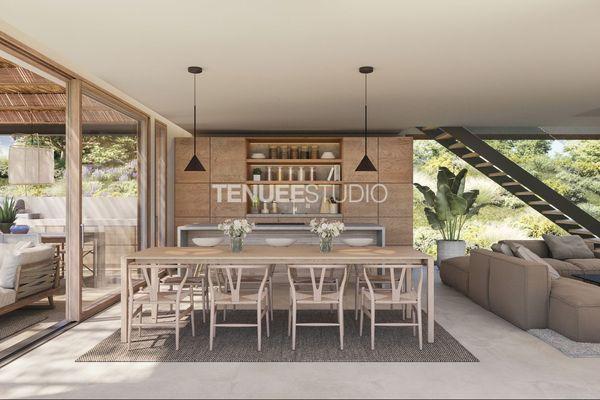 The flat roofs are finished with gravel, while the elegant exterior carpentry incorporates EVO NATURE's triple-glazed wood closures. The ground floor features porcelain gres tiles consistently used for both interiors and exteriors, while upstairs is adorned with KOOK floor's exquisite natural oak parquet. Cutting-edge features like photovoltaic panels and an aerothermal air conditioning system optimize the residence's energy efficiency, complemented by a sophisticated dual-flow ventilation system.