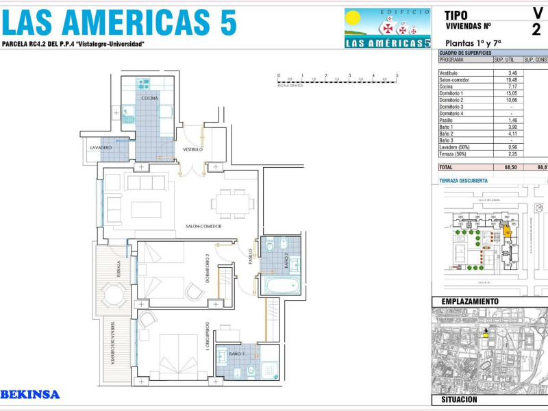 DONDE EL ESPACIO, LA EFICIENCIA, Y EL OCIO SE HACEN UNO. “LAS AMERICAS”, junto a la Avenida de Andalucía de Huelva, y formada por pisos con amplias terrazas, todos ellos con garajes y trasteros, así como amplias zonas comunes dotadas de piscinas de adultos e infantil, zonas verdes, pista de padel, y zona de juegos de infantiles, donde disfrutar, además de la luminosidad que tendrán todas las viviendas, en especial de las impresionantes vistas hacia Palos que tendrán las viviendas con orientación sur, con fachada hacia las zonas comunes.LAS AMERICAS V está compuesto por espaciosas viviendas de 2 a 4 dormitorios, y superficies de 89 m2 los de 2 dormitorios, de 118 y 121 m2 los de 3 dormitorios, y de 143 y 149 m2 los de 4 dormitorios. Viviendas eficientes con Calificación Energética A, con las que poder acceder a una hipoteca verde, con los beneficios económicos que ello supone.Su ubicación junto al Campus Universitario El Carmen, y la avenida de Andalucía, con todos los servicios a su alrededor, tales como supermercados Mercadona y Hipermercado Carrefour, Centro Comercial Holea, Hospital Juan Ramón Jimenez, el Complejo Deportivo del Saladillo, colegios, institutos, hostelería, y todo tipo de comercios, su espaciosa zona común, y su localización a escasos 300 m del Parque Antonio Machado con más de 40.000 m2 de zonas verdes, y a 800 m del Parque Moret que con sus más de 720.000 m2 es el parque urbano más extenso de Andalucía, hacen del edificio “LAS AMERICAS V”, un lugar ideal para vivir.Los residentes de “LAS AMERICAS V” dispondrán de unas inmejorables comunicaciones ya sea mediante transporte público, mediante vehículo privado al poder acceder a la H-30 a escasos 2 minutos, o si prefieren hacer ejercicio, mediante bicicleta, dada su cercanía al carril bici que desde el campus El Carmen, llega hasta el centro de la ciudad.NOTA: Las Infografías incluyen objetos y mobiliario que en ningún caso forman parte de la oferta publicada. Solicita información de las condiciones de la promoción. En caso de discrepancia entre la información (renta, condiciones, …) de la página web con la recogida en los documentos contractuales entregados al cliente, prevalecerán siempre éstos últimos. Toda la información y entrega de la documentación de acuerdo con lo establecido en el Decreto 218/05, será facilitado al cliente en la oficina de ventas de la promoción IVA no incluido en los precio publicados.