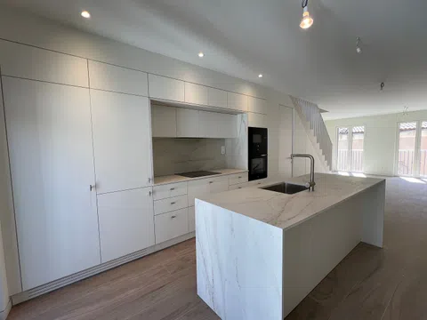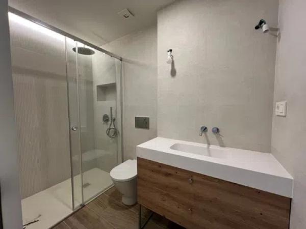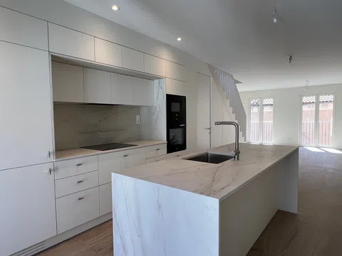 In the kitchen, functionality meets elegance with state-of-the-art appliances and integrated furnishings. The countertops, crafted from Dekton or similar materials, draw inspiration from classic travertine stone. Each unit comes with essential modern appliances including an induction cooktop, oven, extractor hood, integrated dishwasher, and a panelled refrigerator.