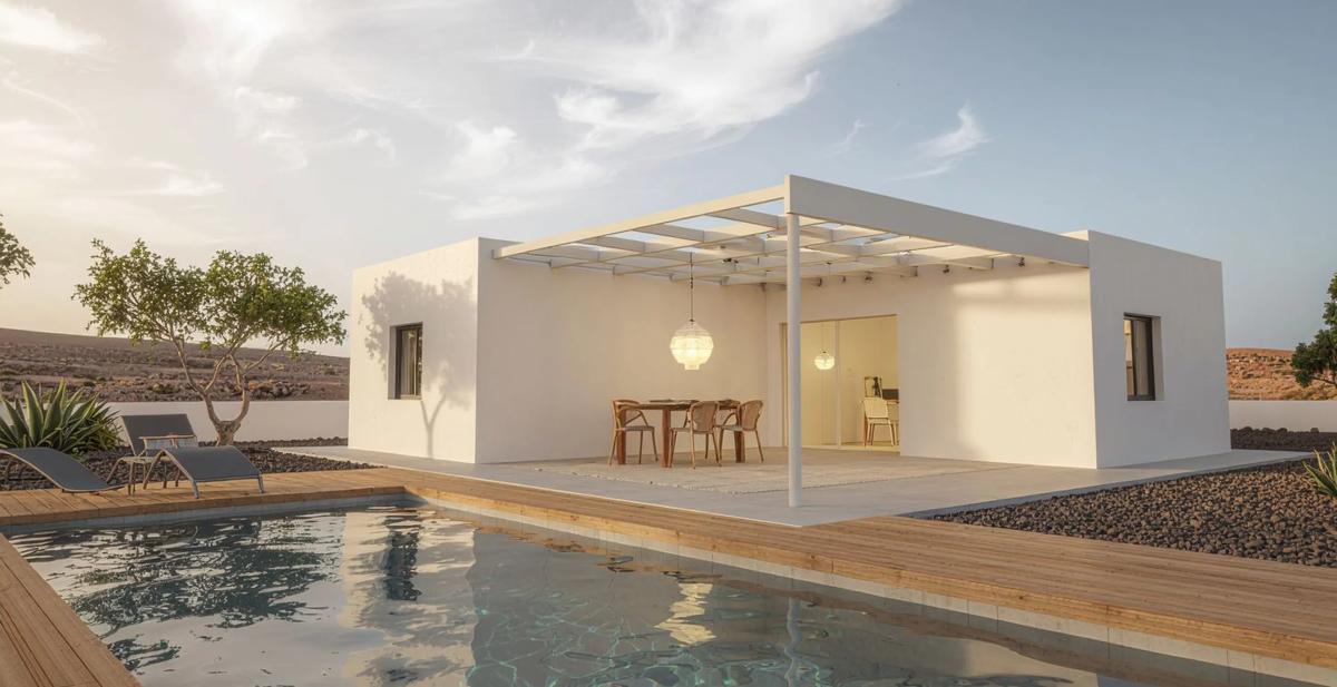 Costa Tinaya — Casilla de Costa (La Oliva) Villas de lujo con piscina privada, jardín y diseño contemporáneo Amanecer con la brisa del norte de Fuerteventura, abrir el salón en esquina y fun...