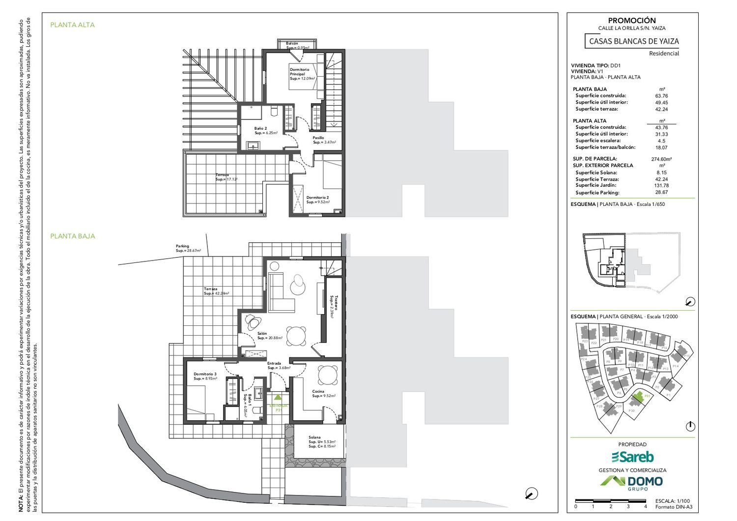Promoción de 31 chalets unifamiliares situada en Yaiza, en Lanzarote. Se distribuyen a lo largo de una vía interior, con acceso desde dos calles, una de ellas vía principal dentro del municipio.Las viviendas son de dos plantas con 3 dormitorios, dos baños y aparcamiento abierto en superficie. Solo una vivienda dispone de piscina y garaje bajo rasante (vivienda 17). Grandes parcelas privativas.Se trata de un proyecto que se encuentra ejecutado aproximadamente en un 90%. Las obras se han reanudado en octubre de 2022, y está previsto que finalicen en la otoño de 2023.Se trata de una excelente oportunidad que se puede destinar a primera vivienda pero también para segunda y como inversión.