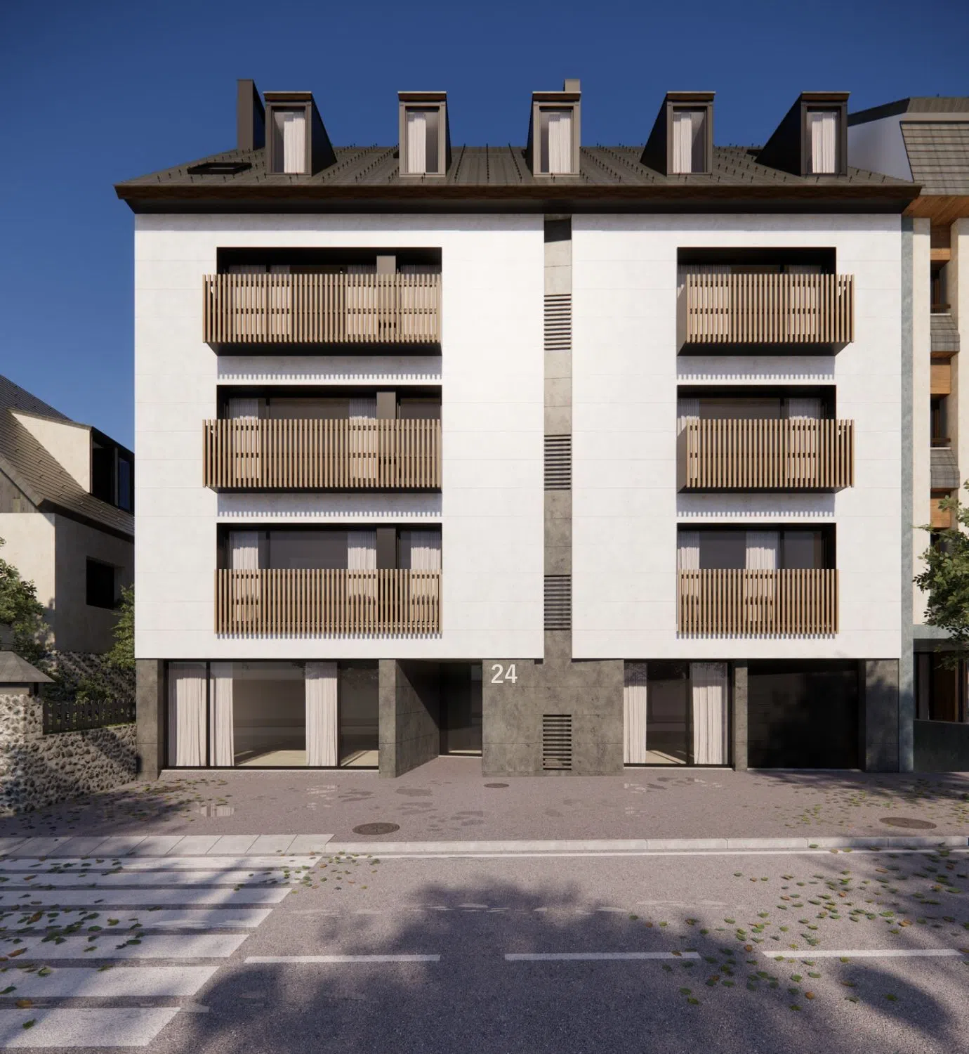 This is a new real estate development in the heart of Vielha, featuring a building designed for modern living. The development consists of 8 residential units along with commercial spaces. Each apartment offers ample living space with options of 2 or 3 bedrooms, complemented by a 40 m² balcony or terrace, 2 bathrooms, a garage, and a storage room. The interiors are finished to a high standard, ensuring both style and comfort. The building is equipped with an energy-efficient aerothermal heating and cooling system and features an advanced facade design.