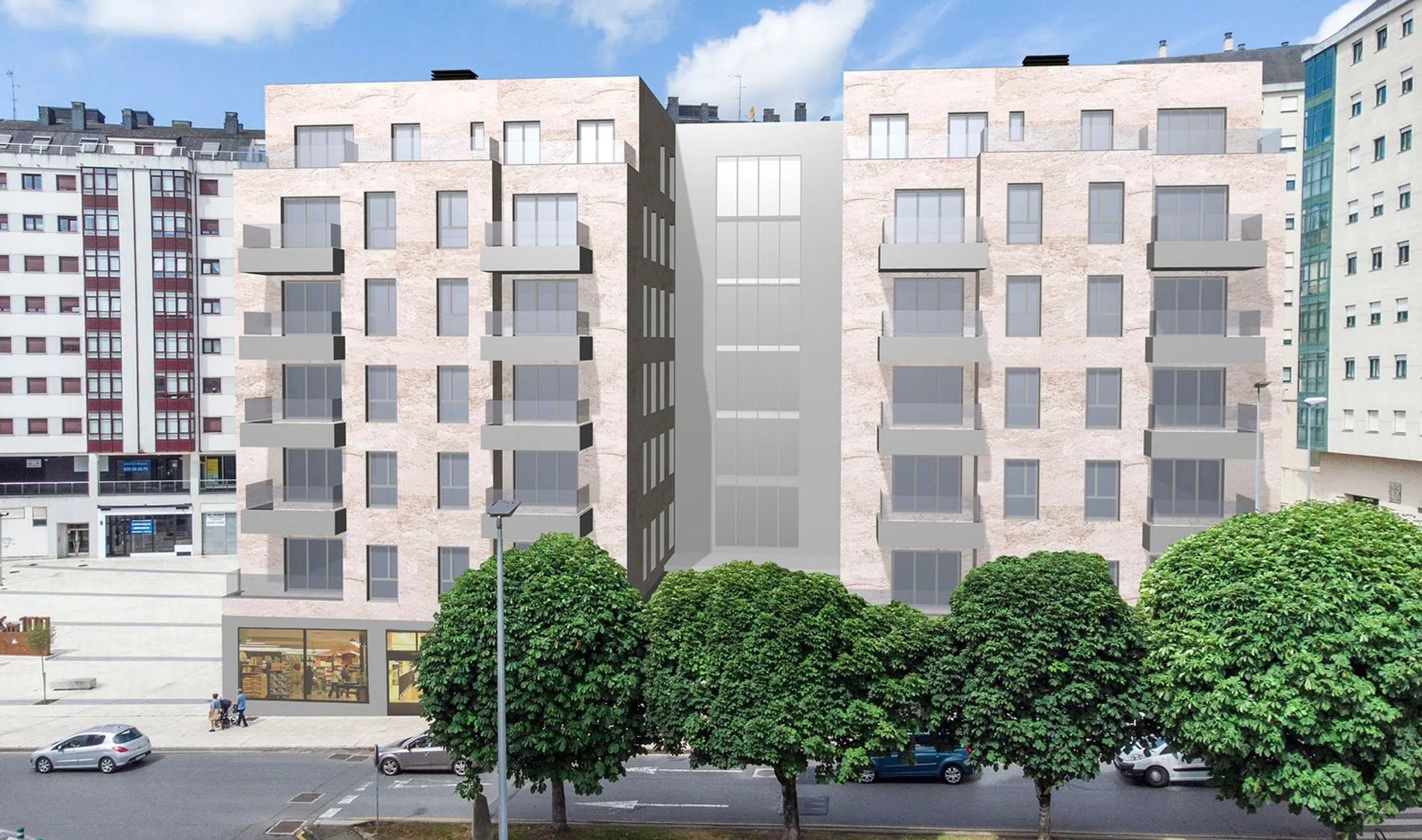 The project will feature the finest finishes, with interior materials from renowned brands: floating floors, large-format and rectified tiles, bathroom furniture, sanitary ware, taps, and kitchen furniture. It is planned to have a ventilated façade with exterior insulation and an interior cavity. Aluminum joinery with thermal break will include triple glazing.