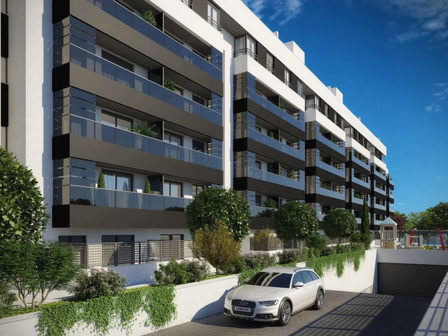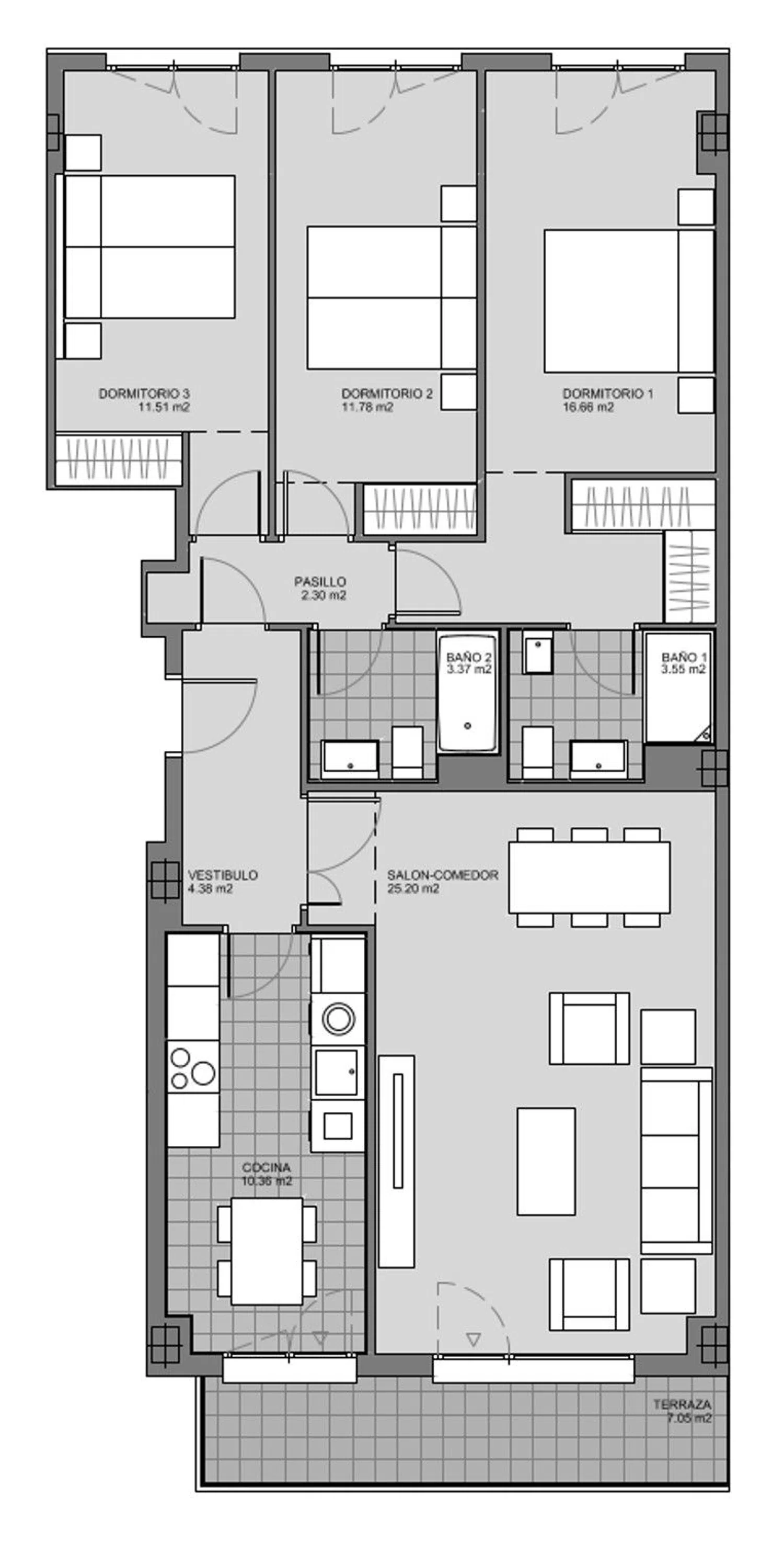 Construction is underway for a new residential development managed under a cooperative system, featuring stylish apartments. The complex consists of a ground floor, four additional floors, and penthouses with expansive terraces. Available units include two and three-bedroom apartments, all with two bathrooms, situated within a gated community. Residents can enjoy shared facilities, including a pool, a solarium, a playground, a community room, and concierge services. Each apartment comes with two parking spaces, a storage room, and spacious terraces. The development is also equipped with accessible housing options designed to meet the regulations of the local housing council.