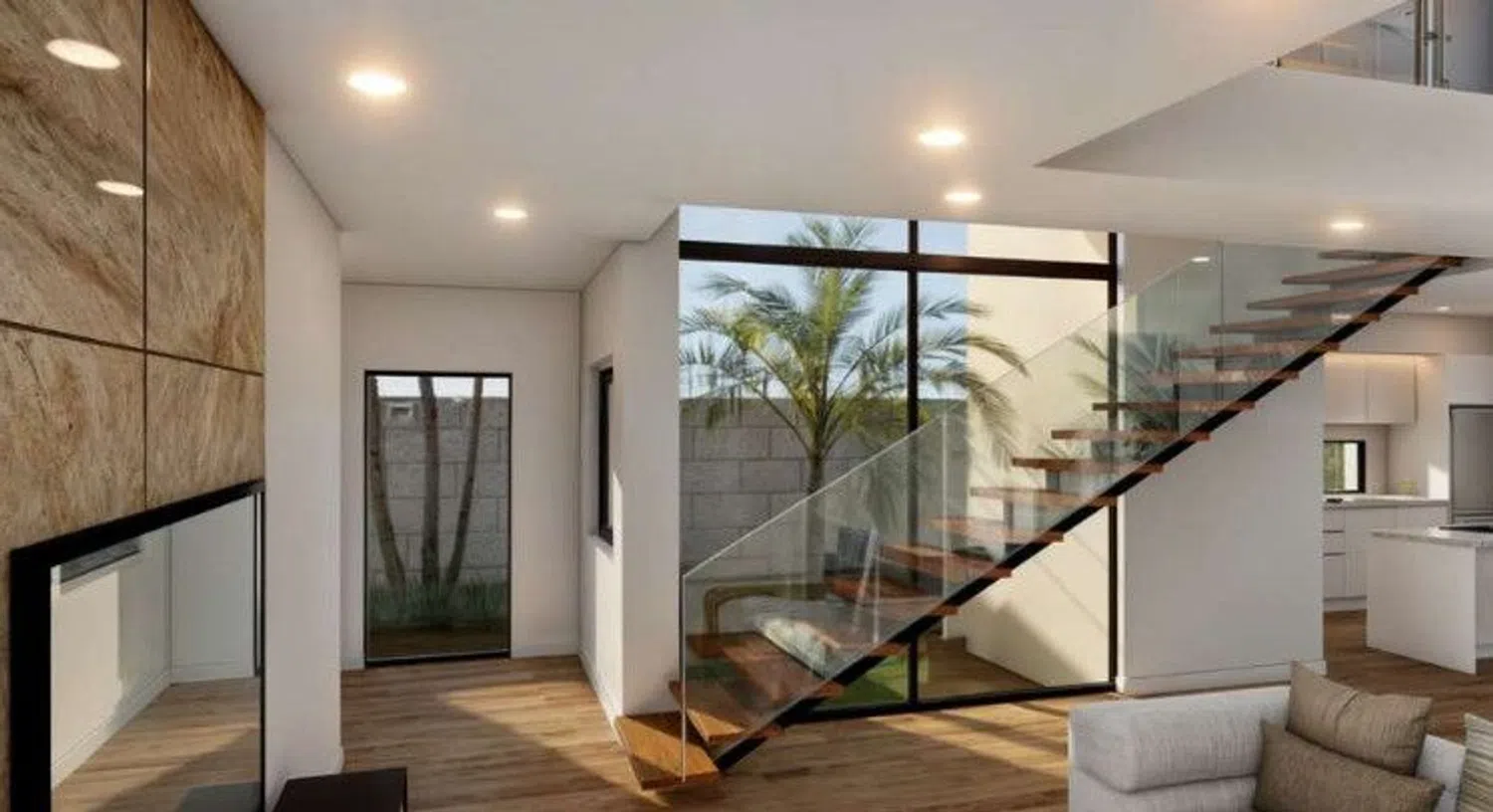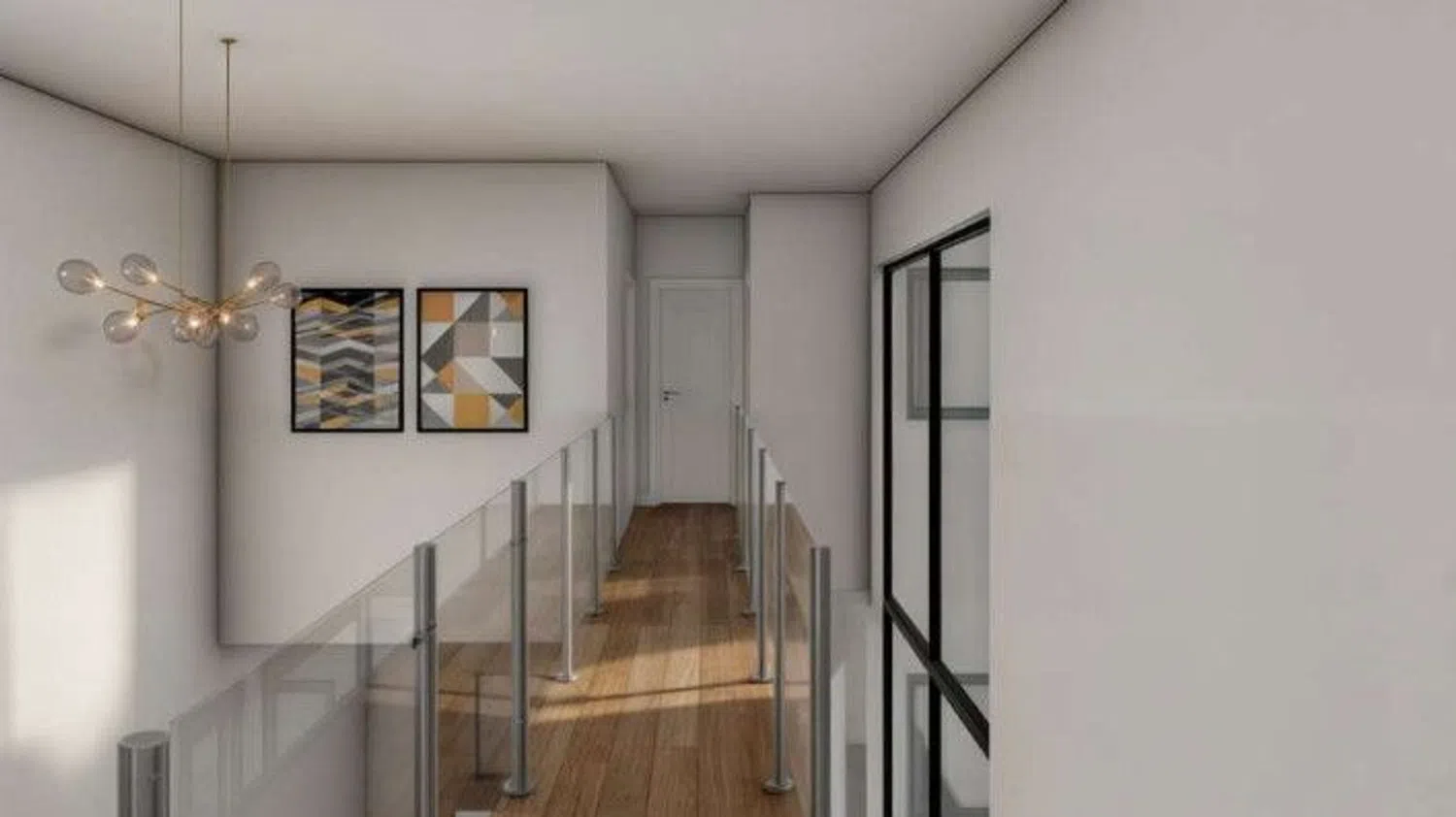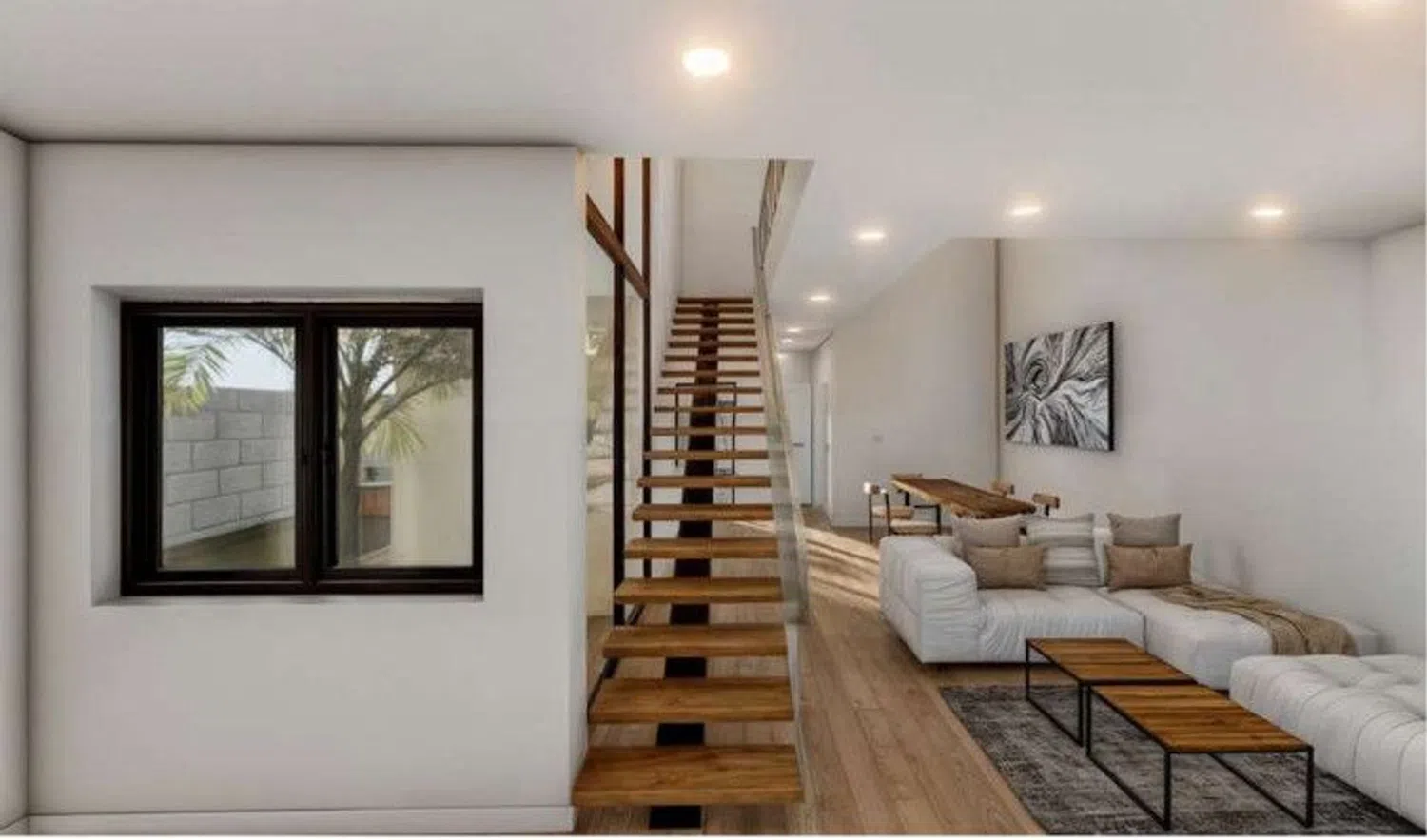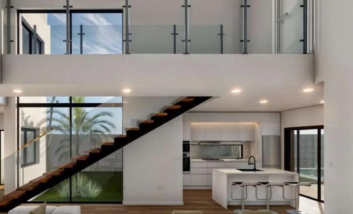 The first floor houses three bedrooms, highlighting the spectacular master suite with a walk-in closet, fully equipped private bathroom, and access to a panoramic terrace with a safety glass railing. The other two bedrooms, one with an impressive window, share a full bathroom, offering abundant light and comfort.