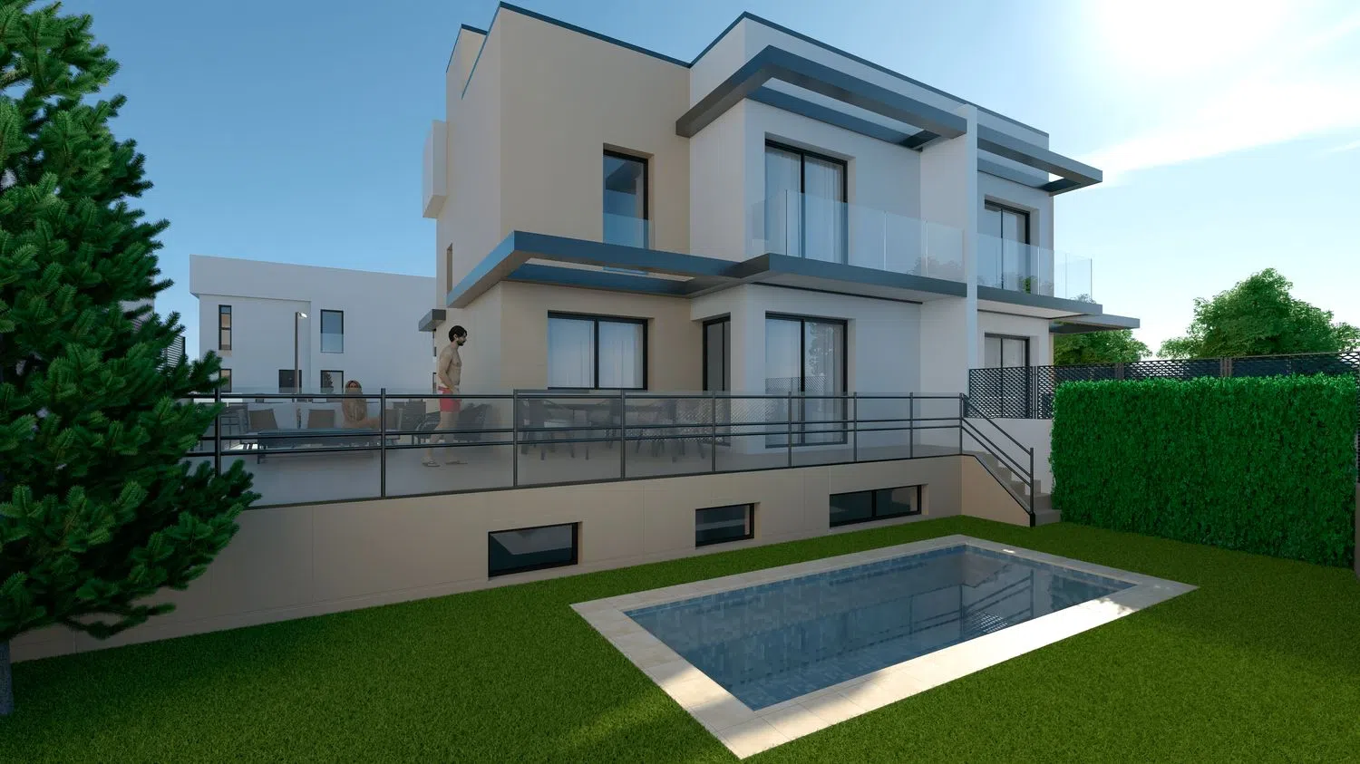 These homes are thoughtfully designed with an additional room on the ground floor, which can serve as an ideal office space, complemented by another bathroom and a spacious open-plan living area with a kitchen. Expansive terraces provide a serene outdoor space for relaxation, taking in the views, or engaging in gardening activities. The possibility of installing a pool adds a delightful touch, offering a refreshing escape for leisure and exercise.