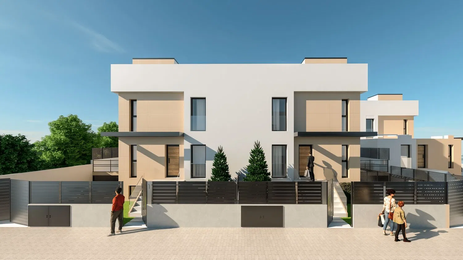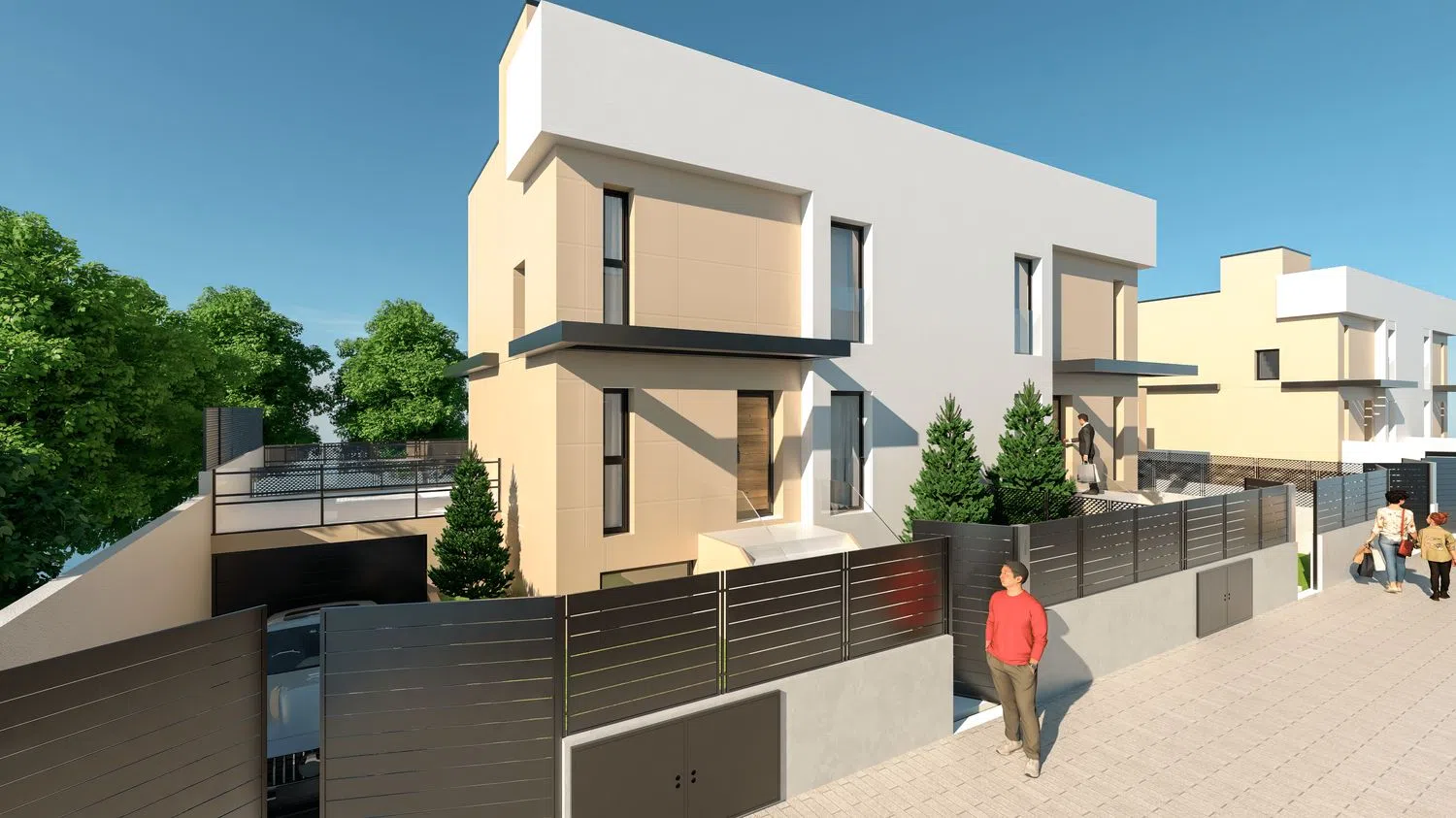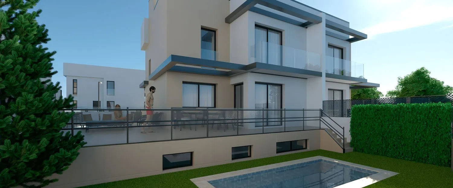 Discover a remarkable new development of five exclusive single-family homes in a highly sought-after location. Each residence boasts over 250 square meters of modern, functional design, offering ample space for family living or a productive home office setup. The upper floor features two bathrooms, including an en-suite with the main bedroom, ensuring a perfect blend of privacy and comfort.