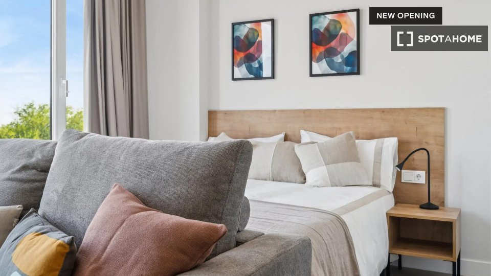 In addition to offering stylish living spaces, our new opening in Madrid also features several modern amenities designed for socializing, wellness, and leisure. Enjoy a moment of relaxation in the terrace and swimming pool, challenge their fitness game at the gym, or have a movie night in the cinema room. The building also includes co-working spaces and meeting rooms, the perfect spaces for productivity and focus, as well as common rooms and outdoor garden areas.