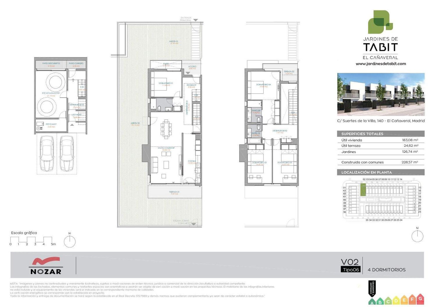 43 viviendas unifamiliares de tres plantas, donde podrás disfrutar de sus dos jardines privados, frontal y trasero, de hasta 189 m². Con 4 dormitorios, 3 baños y un cuarto polivalente en la planta sótano con patio inglés, que se puede convertir en un gimnasio, en una sala de cine o de juegos...En todos sus espacios, las mejores calidades: climatización por suelo radiante y refrescante con aerotermia, doble placa de yeso laminado, armarios vestidos con acabado textil, cocinas equipadas, cuartos de baño alicatados por completo... Interiores diseñados con inteligencia y acabados con rigor, para alcanzar una eficiencia energética y confort máximos.La luz exterior se incorpora al interior a través de grandes cristaleras, para crear un hogar donde la amplitud ya existente se acentúa, con sus dos jardines y terraza en el dormitorio principal. Doble orientación y ventilación cruzada, para tener luz a cualquier hora del día. Con acceso directo a las zonas comunes, para mayor comodidad. El amplio jardín se ha diseñado para satisfacer todas las necesidades, con piscina y una zona de entretenimiento infantil, para que puedan jugar fuera de casa con seguridad y cercanía.Todas las viviendas disponen, además, de dos plazas de garaje cubierto en la planta sótano.Las viviendas de Jardines de Tabit disponen de la máxima calificación energética, para que no sólo contribuyas al cuidado del medio ambiente, sino que también te beneficies de las ventajas de hacerlo, gracias a la utilización de materiales constructivos de calidad y sistemas de confort térmico, como la climatización por suelo radiante y refrescante con aerotermia, que contribuyen al ahorro energético.Emplazado en la calle Suertes de la Villa 140, en El Cañaveral, un nuevo desarrollo en la capital. Una ubicación inmejorable para, de manera simultánea, disfrutar de la naturaleza y de todos los servicios.Con dotaciones ya consolidadas en este barrio joven y dinámico: supermercados, lugares gastronómicos y de ocio, instalaciones deportivas, centros educativos... y otros muchos espacios de inminente apertura. Y junto a todos los equipamientos de Vicálvaro y Coslada.Un entorno completo con más de 100 hectáreas de zonas verdes, como el Parque del Humedal, una referencia de primer orden por sus kilómetros de caminos y senderos. Jardines de Tabit está perfectamente comunicado por varias líneas de autobús, con rutas recientemente ampliadas para mayor comodidad, trenes de cercanías, y acceso directo a la M-45 y la R-3. A tan solo 10 minutos del aeropuerto, y a 15 minutos de la Estación de Atocha y del centro de Madrid.