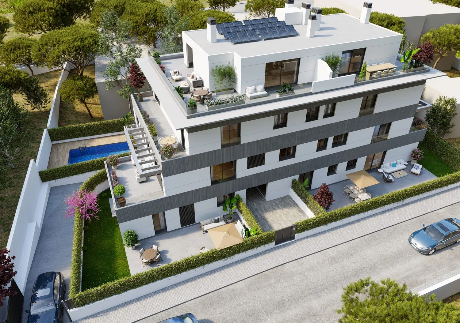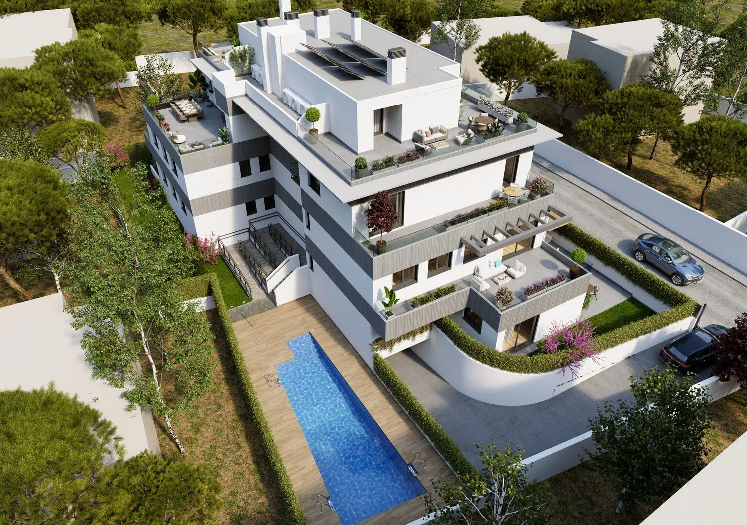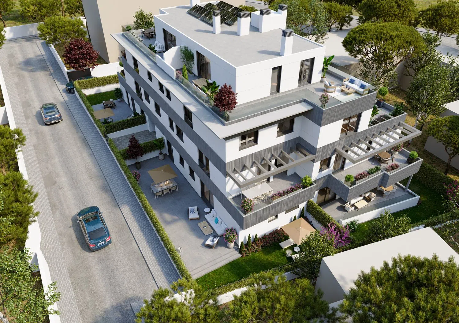 LICENCIA DE OBRA INMINENTE. INICIO DE OBRAS ESTIMADO FEBRERO 2025. DEMOLICIÓN FINALIZADA Obra nueva Residencial Pasaje del Sur, pisos de 3 habitaciones, amplios jardines y terrazas, piscina comunitaria. Residencial Pasaje del Sur es un exclusivo edificio de obra nueva que consta de 9 viviendas, con varias tipologías: - Bajos de 3 habitaciones, 2 baños y amplios jardines de uso privativo desde 85 hasta 120 metros cuadrados. - Primeros de 3 habitaciones, 2 baños y amplias terrazas. - Segundo de 3 habitaciones, 2 baños y una terraza de grandes dimensiones. - Áticos (dúplex, en planta segunda y ático) de 3 habitaciones, 2 baños, aseo de cortesía y terrazas con vistas panorámicas. Cada una de las viviendas incluye una plaza de garaje y un trastero, con posibilidad de adquirir una segunda plaza. Las zonas comunes incluyen una sala comunitaria y una piscina exterior. La promoción tiene un cuidado diseño que combina estética, alta calidad de materiales y funcionalidad con domótica integrada, y un sistema constructivo que posibilita un aprovechamiento óptimo del espacio en todas las estancias. La climatización de las viviendas será mediante sistema de aerotermia frío-calor que se distribuye por suelo radiante. Las viviendas cuentan con la máxima certificación energética, siendo “A” en proyecto. El proyecto contempla la ampliación de Pasaje del Sur, que pasará a comunicar la calle Guía con la calle Fuente de la Salud, según prevé el PGOU de Pozuelo de Alarcón. La promoción tiene una localización privilegiada, se ubica en una calle muy tranquila en un entorno totalmente consolidado, a escasos 2 minutos andando del Parque Fuente de la Salud y de Camino de las Huertas. Cuenta con gran oferta de servicios a los que acceder andando, como centros educativos (Kensington School, Liceo Sorolla, Escuelas Pías San Fernando, San José de Cluny), supermercados, tiendas, restaurantes, zonas verdes, centro comercial El Torreón, etc. Las viviendas están muy bien comunicadas, con fácil acceso a la A-6, M-40, M-515 y M-503.