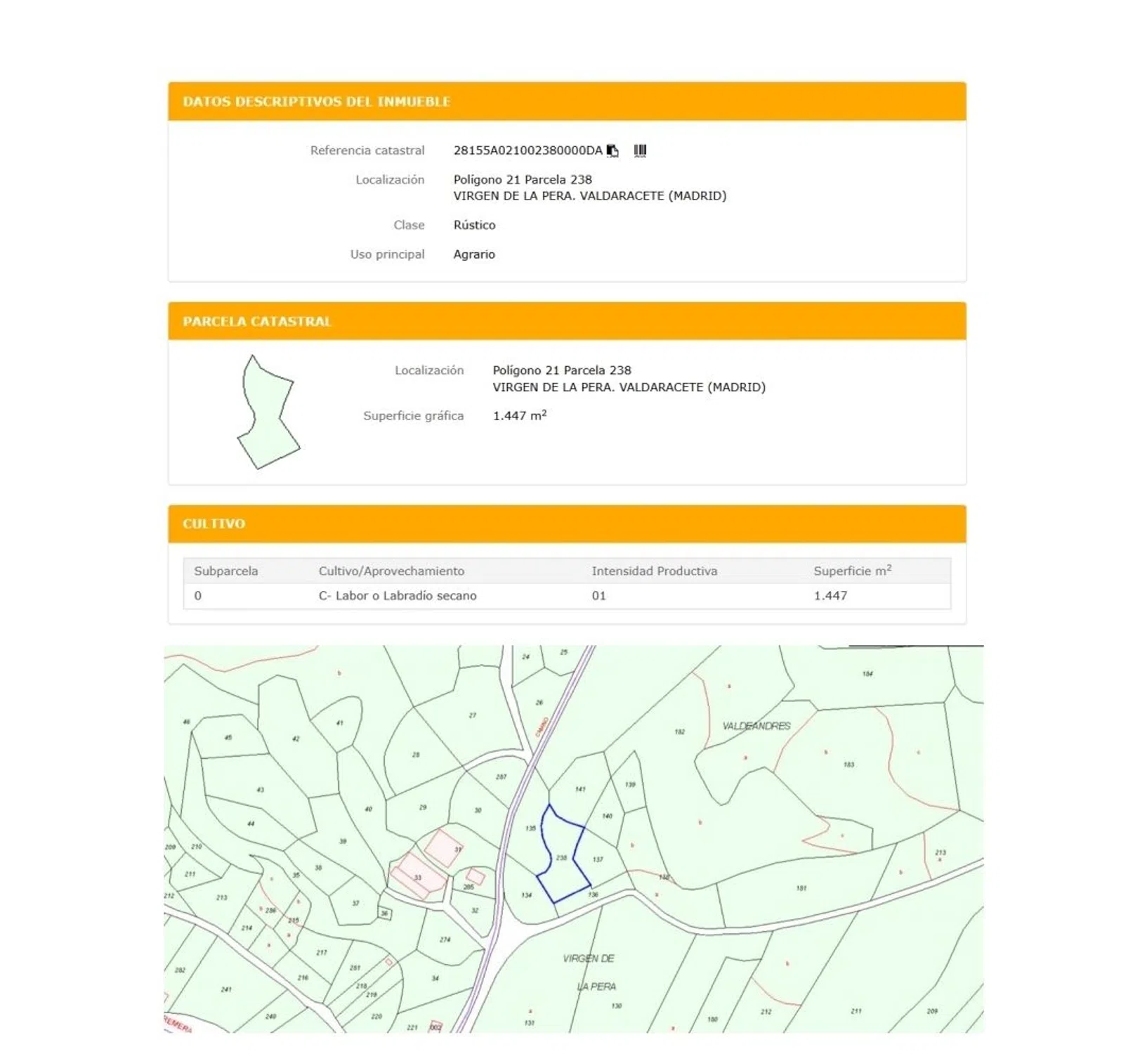 Parcela rústica en venta en Valdarácete (Madrid). Superficie gráfica de 1447 m². - Polígono 21, Parcela 238. - Referencia catastral: 28155A021002380000DA.