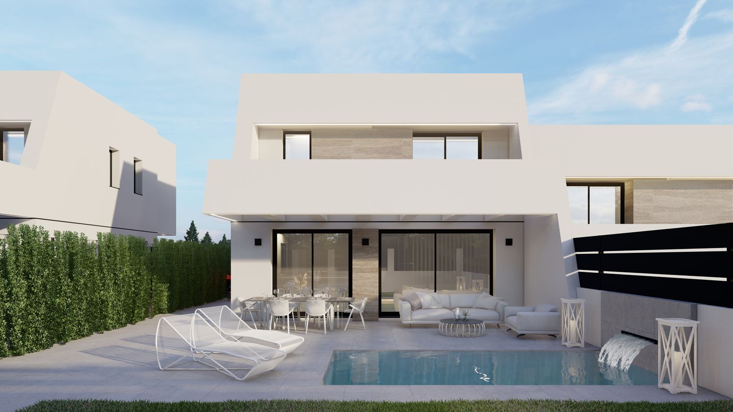The homes are located in the Santa Clara area, characterized by their avant-garde aesthetics and impeccable design, highlighting the modernity and quality of their finishes. This gated community is composed of an upper floor and a ground floor with a private pool and basement (optional extras), where quality and sustainability are the order of the day.