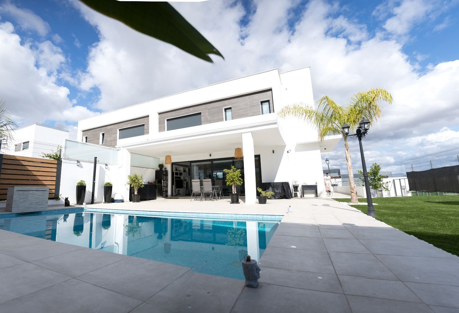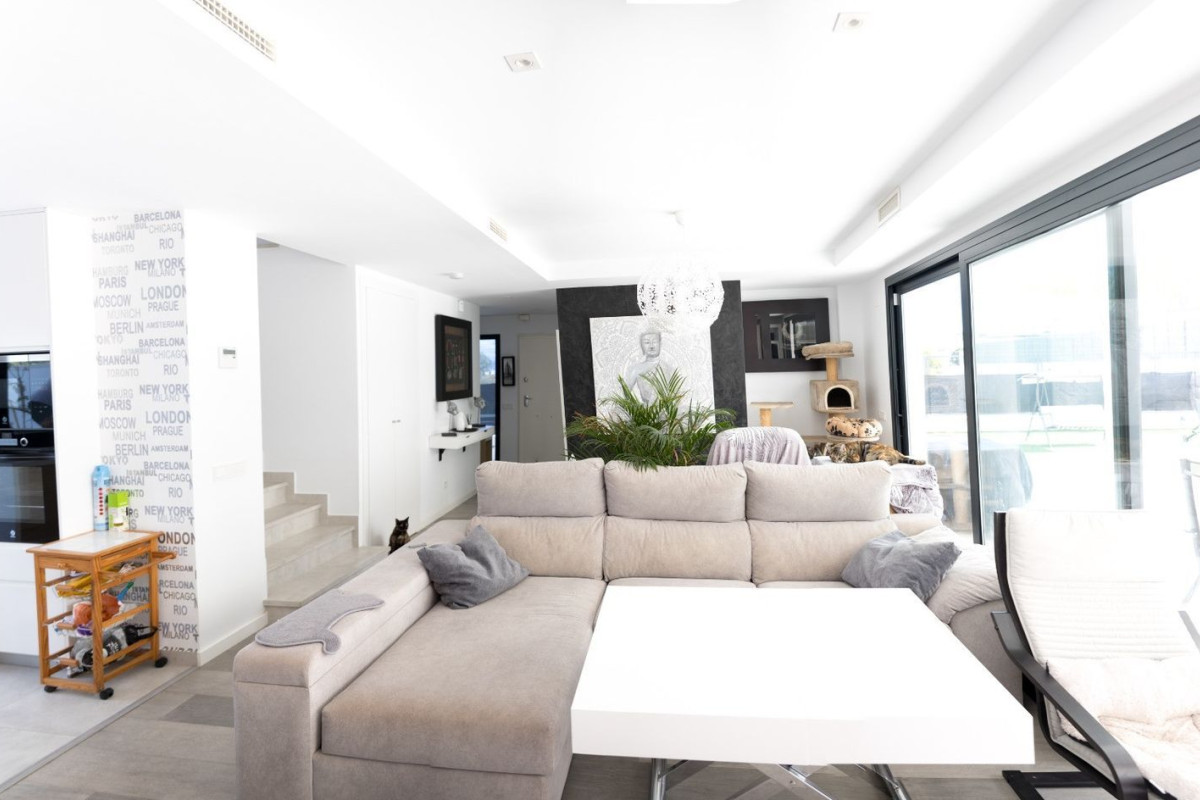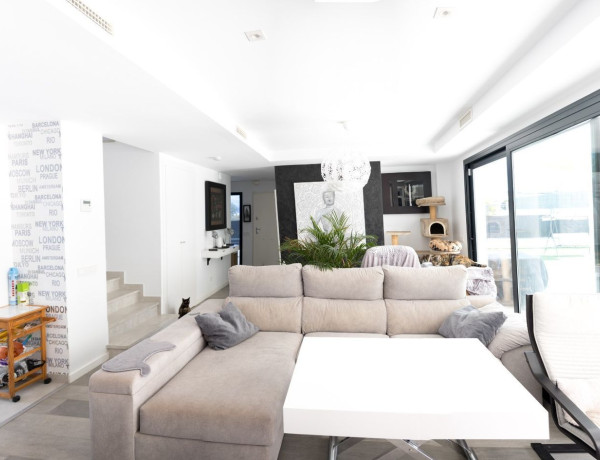 Retamar, Alhauarin de la Torre.Localizada al noreste del mismo. Está ubicada a tan sólo 16 km de Málaga y a 8 km del Aeropuerto Internacional de Málaga. Podrás acceder a la nueva autovía de circunvalación en pocos minutos por la A-7, además encontrarás la parada de autobús Casas Blancas a unos 13 minutos caminando por donde pasan las líneas M-136, M-138 y M-140 que conectan con la Plaza Mayor en Málaga y con pueblos cercanos.Está próximo a la Costa del Sol más occidental, con rápido acceso a Torremolinos, Benalmádena y Fuengirola. Además, su enclave entre la serranía de Mijas y su municipio, le acreditan como puerta de entrada y salida del Valle de Guadalhorce. Supermercados, farmacias, centros de salud o colegios forman parte de los servicios cercanos que te facilitarán tu día a día en Alhaurín de la Torre, mientras que tu sólo tendrás que disfrutar de un espacio pensado para aportarte tranquilidad y bienestar.Esta moderna residencia, construida en el año 2020 con materiales de alta calidad y un diseño vanguardista, establece nuevos estándares de excelencia. El exterior del chalet presenta una fachada contemporánea que refleja estilo y elegancia.Ubicada en una parcela de 453 metros cuadrados, la casa de 140 metros cuadrados se distribuye en dos plantas de 70 metros cada una. Los grandes ventanales antirrobo de doble acristalamiento brindan una luminosidad excepcional, con orientación sur para aprovechar al máximo la luz natural. La vivienda cuenta con focos de LED en todas las habitaciones y dos unidades independientes de aire acondicionado frío/calor para cada planta, garantizando un ambiente confortable en todo momento.El chalet pareado unifamiliar ofrece una serie de comodidades, como una puerta blindada, 4 dormitorios, 1 vestidor y un dormitorio principal con baño completo y vestidor. Además, existe la posibilidad de convertir un amplio espacio en un balcón. Un dormitorio adicional cuenta con su propio balcón y vistas impresionantes. El espacioso salón, con una cocina americana equipada con electrodomésticos de alta gama, crea un ambiente acogedor y elegante.La casa cuenta con 3 baños completos, 2 con platos de ducha grandes y 1 con bañera, todos con mampara. Además, dispone de un lavadero conectado entre las plantas, un solárium con punto de agua y un aparcamiento privado para dos coches y dos motos.El área exterior destaca por una piscina de agua salada con plataforma para hamacas, asiento incorporado y una moderna cascada iluminada. El jardín, con césped artificial de calidad y plantas naturales, está preparado con tuberías y electricidad para un posible almacén y baño exterior. La casa cuenta con porches delantero y trasero, este último con cocina exterior y lavadero.Además, la propiedad cuenta con características sostenibles, como placas solares para agua caliente y electricidad, lo que representa un notable ahorro energético. El garaje cuenta con una puerta automática, y la vivienda incluye un portero automático accesible mediante teléfono móvil para verificar la entrada. La seguridad se refuerza con cámaras y vigilancia privada (con cargo adicional). La propiedad también ofrece reforzamiento acústico, preinstalación domótica, chimenea, suelos de parquet de alta gama y sanitarios Roca, todo ello con vistas panorámicas hacia Málaga.