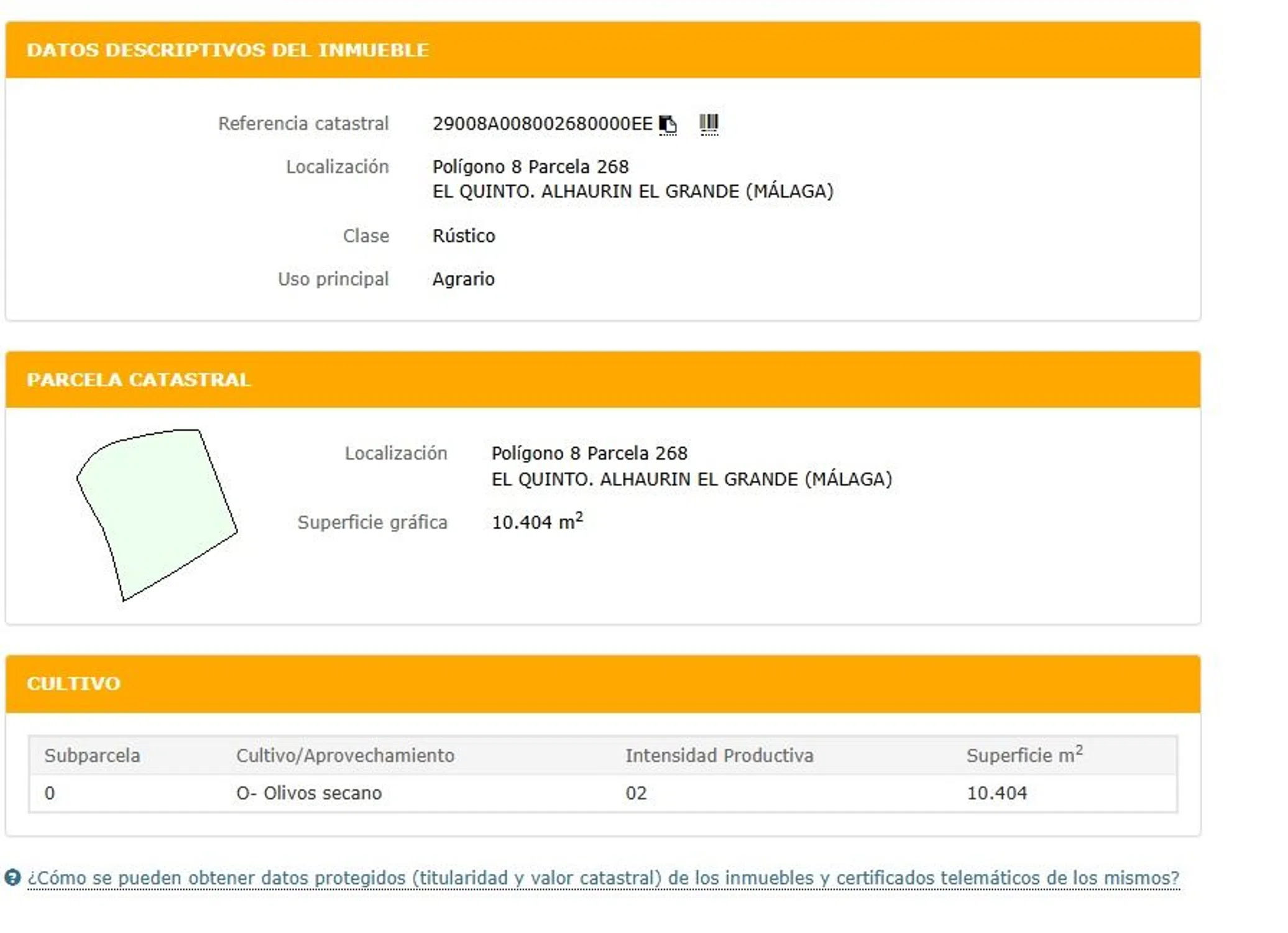 Se vende espectacular finca con unos 80 olivos. Con una zona para cultivar en la parte inferior lindando a un arroyo para cultivar huerto. La finca se encuentra completamente vallada con una entrada privativa. Posibilidad de realizar enganche de energía eléctrica y Agua. La finca esta sobre una ligera pendiente que le da más vistas. Situado en el término municipal de Alhaurín el Grande, a 5 minutos del núcleo urbano, y a 10 minutos de Alhaurín De la Torre. El acceso se realiza por vía urbana asfaltada. La superficie total es de 10404 m2. Aunque de momento no es urbanizable hay sitio mas de que de sobra para instalar una casa prebabricada, casa de madera o mobilhome. ESTÁ SEMANA ESTOY EN MÁLAGA PARA PODER ENSEÑAR LA FINCA Y GESTIONAR SU VENTA.