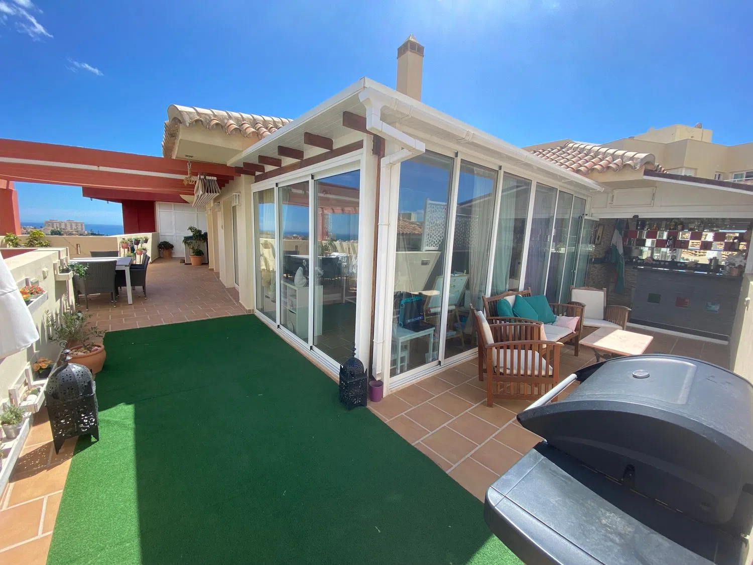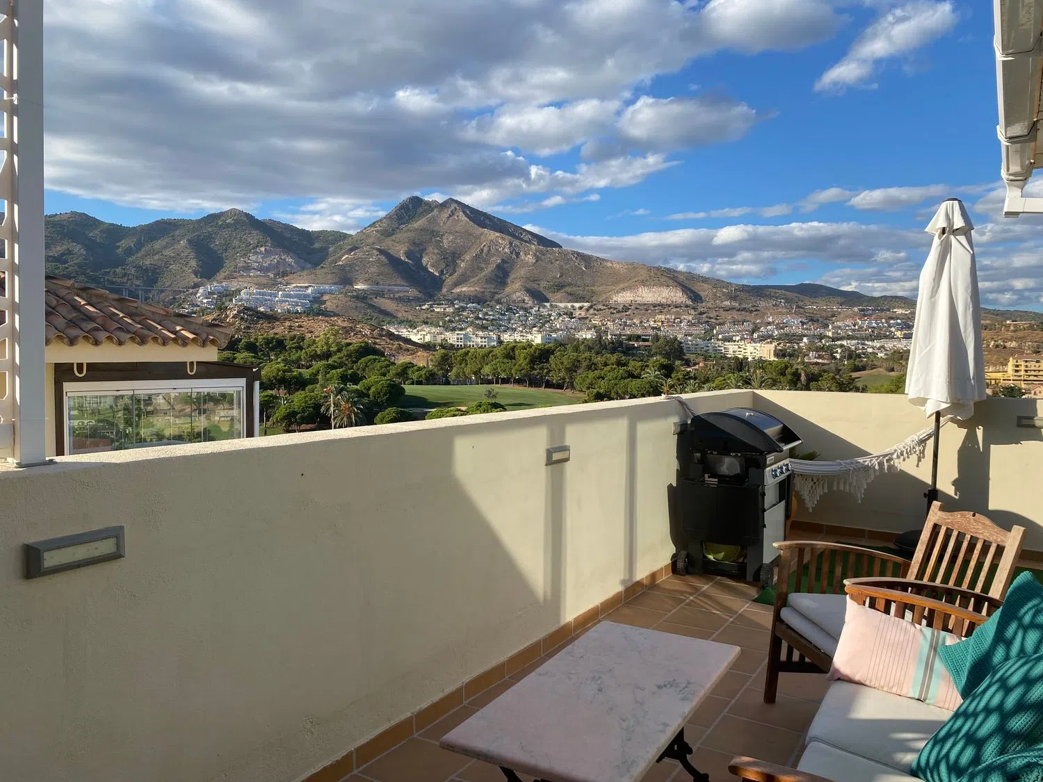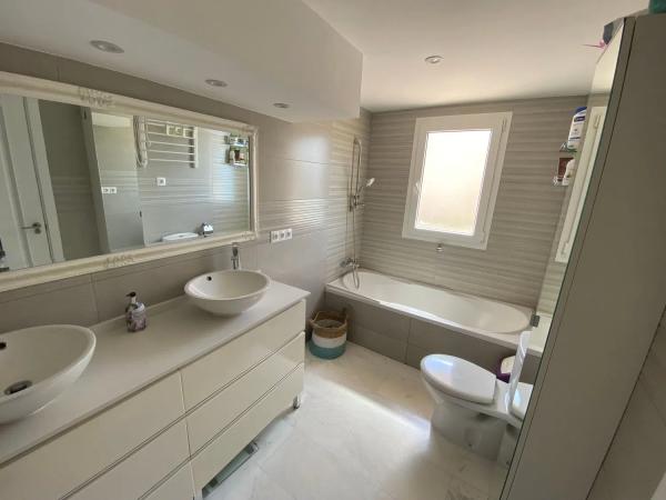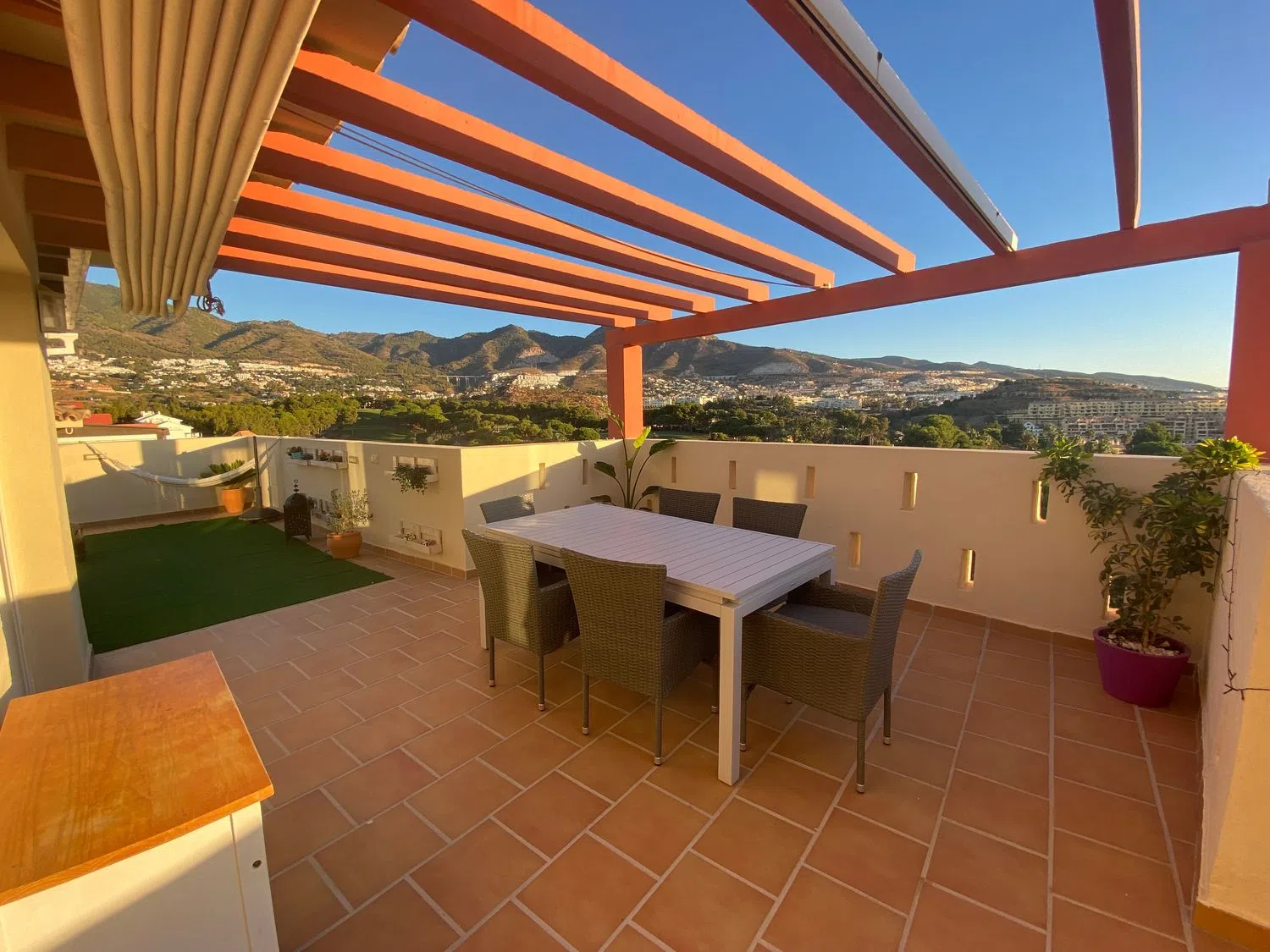 Amplio ático en esquina ubicado en primera línea de golf que además disfruta de vistas al mar y a la montaña. Este ático goza de una total privacidad al no tener vecinos al lado, ubicado en la 4ª planta cuenta con 3 dormitorios. El espacio interior de 141m2, se completa con 2 cuartos baños (uno en suite), una cocina abierta al salón totalmente equipada y un amplio salón comedor, con chimenea. Terraza de 99m2 que rodea la vivienda, con zona de bar cerrada con Lumon, habitación extra cerrada y cuarto lavadero con termo eléctrico. Dispone de suelos de mármol y aire acondicionado centralizado. La vivienda ha sido reformada en 2017. Además, la urbanización ofrece todas las comodidades que puedas desear: piscina comunitaria, gimnasio, club social y la tranquilidad que solo esta exclusiva zona residencial puede ofrecer. El ático incluye 1 plaza de parking y un trastero.