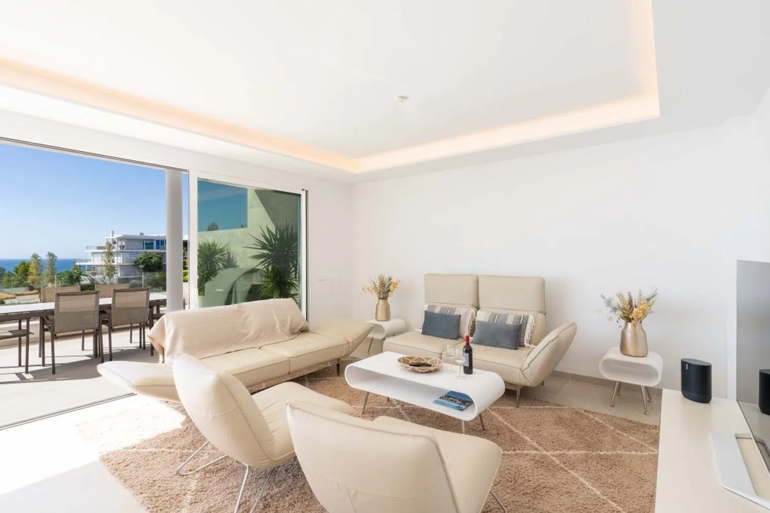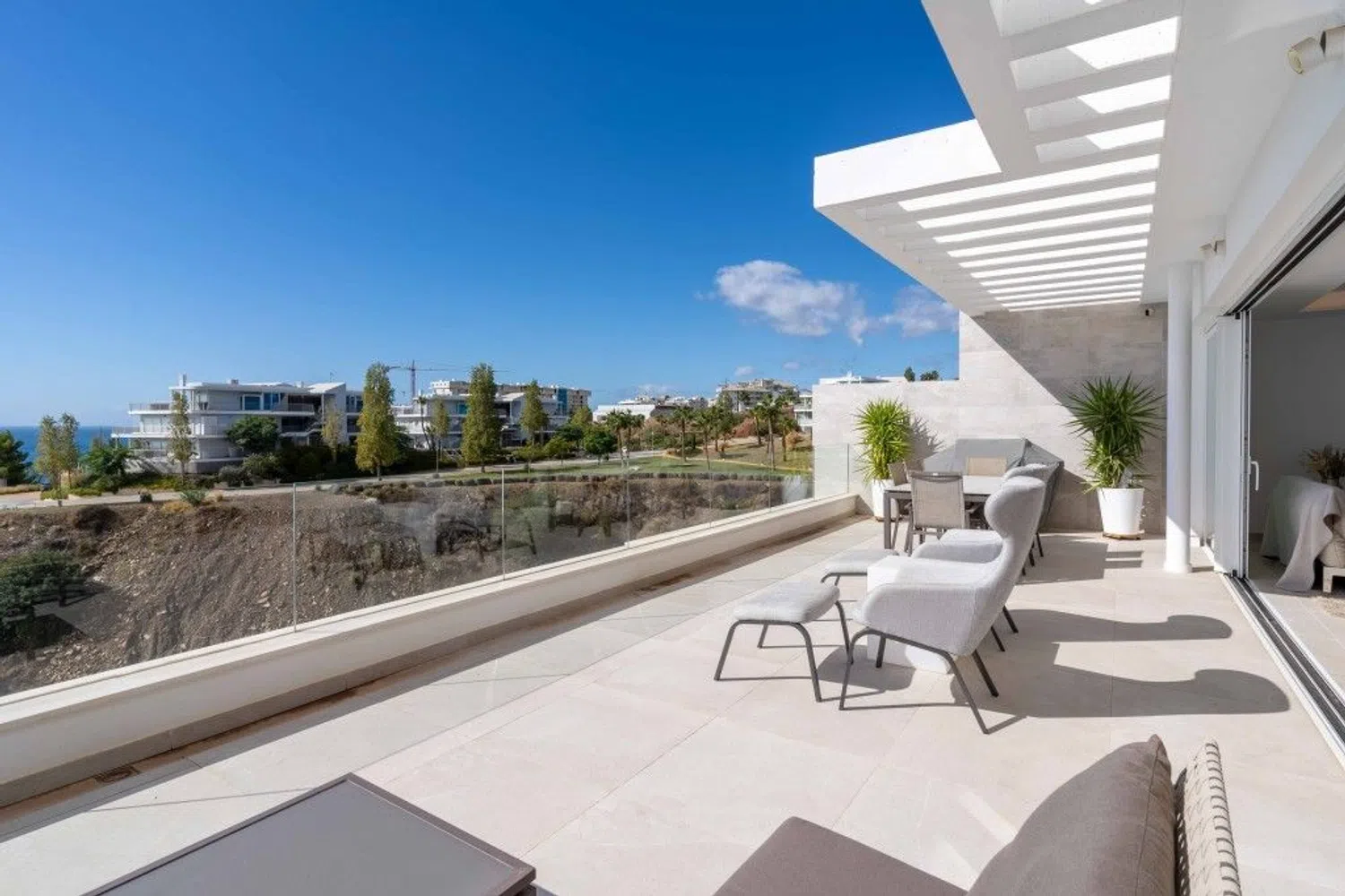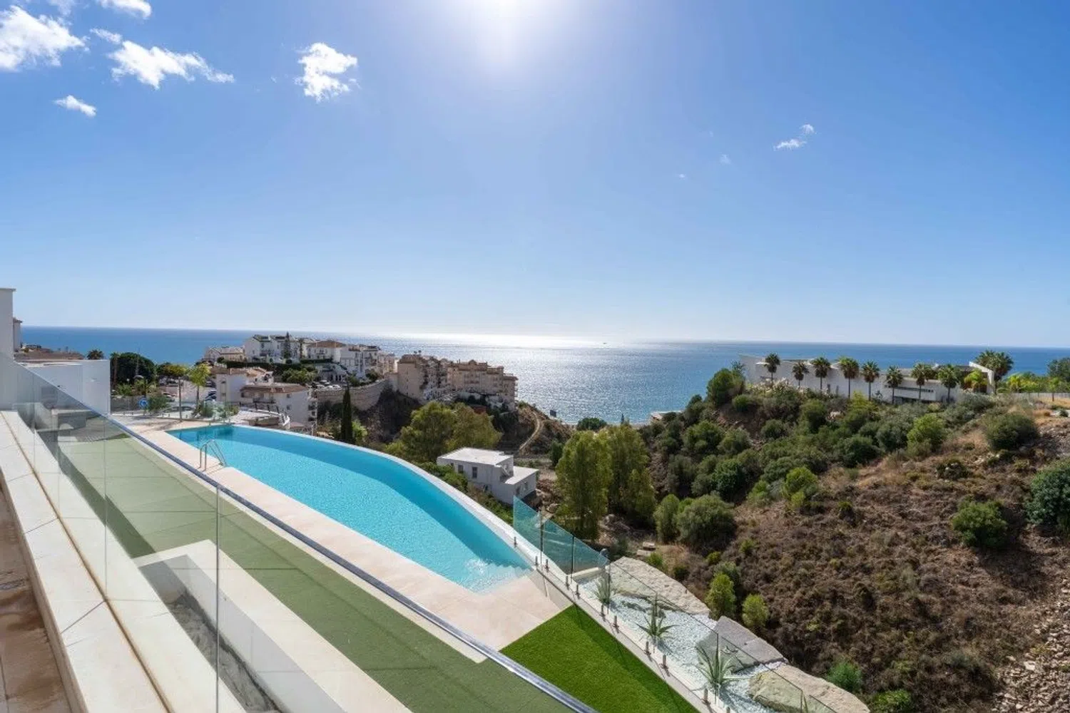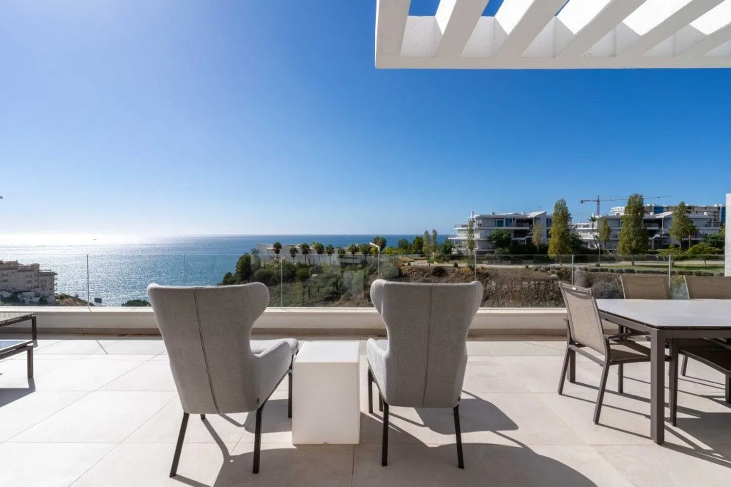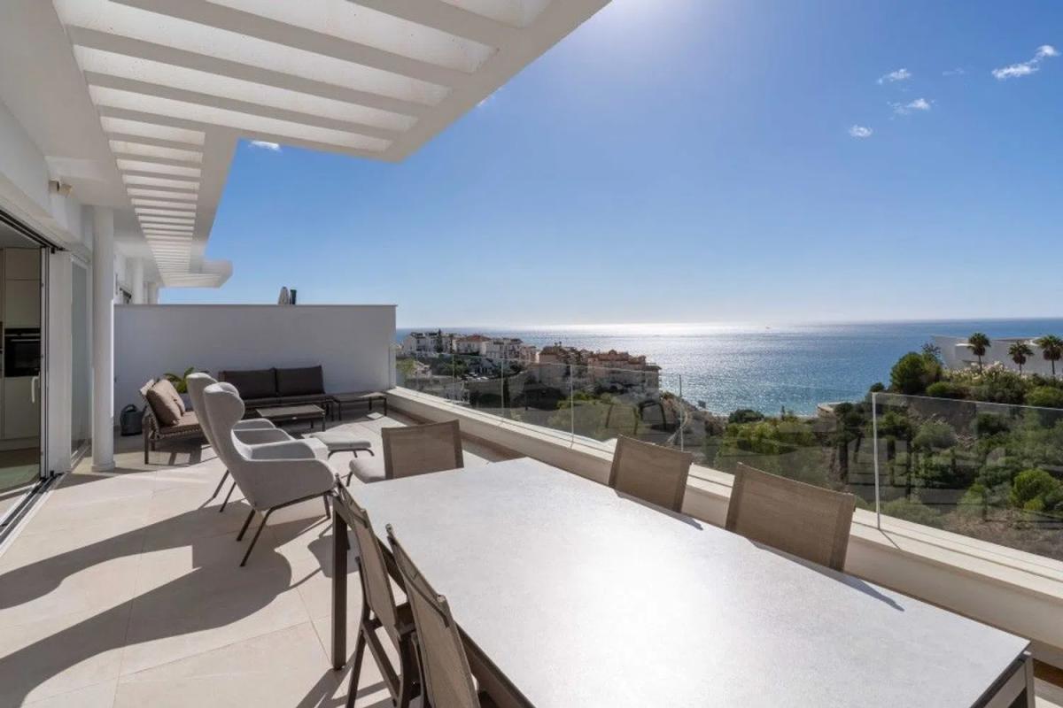 Entre y siéntase como en casa en este maravilloso ático con vistas ininterrumpidas al mar Mediterráneo, la playa y las olas. El ático está situado en una pequeña comunidad de sólo 20 apartamentos en un edificio con una fantástica arquitectura moderna y libre de los ruidos molestos de la vida cotidiana. Usted entra en el ático con el ascensor, que conecta todos los niveles, desde el garaje hasta la terraza de la azotea, privada para usted. Su mirada se posa inmediatamente en el gran espacio de vida del apartamento, inundado de luz, con una ventana continua de 9,2 metros al mar, de los cuales 6 metros se pueden abrir completamente. Este espacio vital combina generosamente la vida, la cocina y la comida. Abra las ventanas y el balcón de 44 m2 se conecta a la perfección y duplica casi por completo su espacio vital. Esto le brinda la oportunidad perfecta de vivir en el interior y al aire libre. El borde de cristal real del balcón le ofrece una vista clara del mar incluso cuando está sentado. El ático perfectamente proporcionado incluye 3 dormitorios y 2 baños, cada uno de los cuales puede calentarse o enfriarse por separado. Los dormitorios tienen persianas eléctricas y se pueden oscurecer completamente. En la azotea de 123 m2 encontrará un jacuzzi exclusivo y una preparación para una cocina exterior. Un sistema adicional de descalcificación independiente en el ático limpia el agua utilizada de forma centralizada. Un sistema domótico permite controlar el aire acondicionado, la calefacción por suelo radiante, las luces y las persianas. Un sistema Eufy con 4 cámaras está instalado como sistema de seguridad privada. Encontrará suficiente espacio de almacenamiento para todas sus pertenencias, ya que se ha instalado un segundo armario empotrado en el dormitorio principal y la isla de la cocina tiene grandes cajones a ambos lados. Se incluyen 2 plazas de aparcamiento de fácil acceso y un trastero bien situado en el garaje.