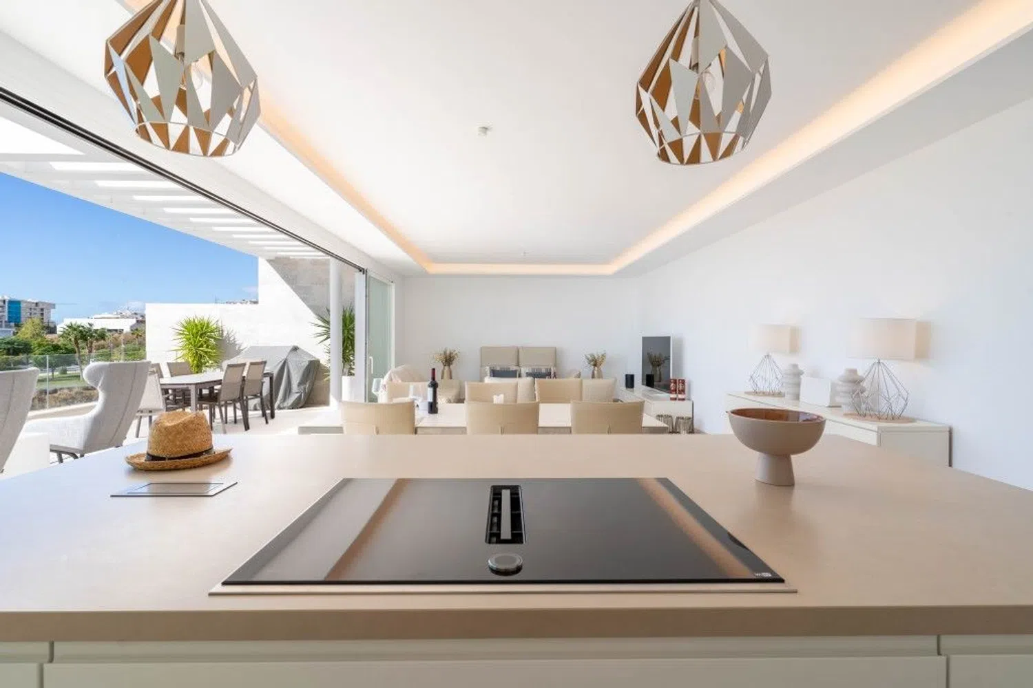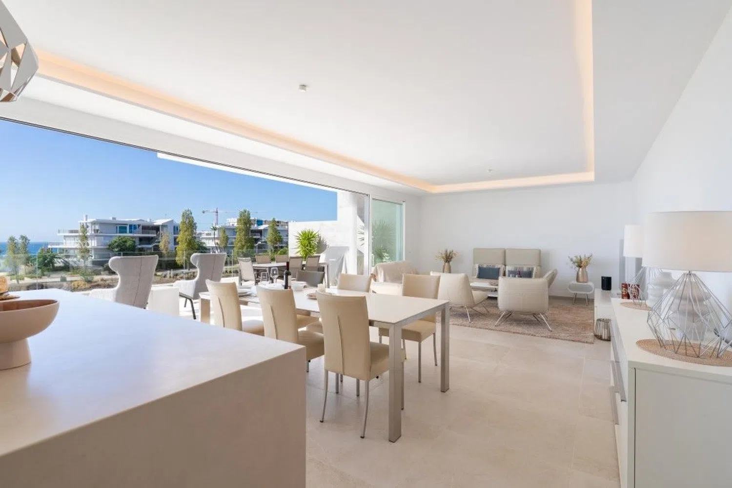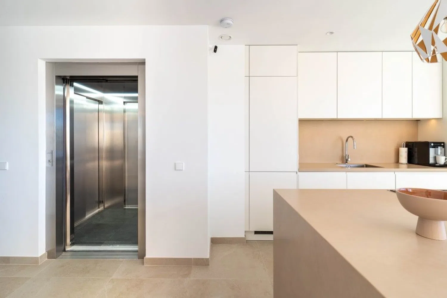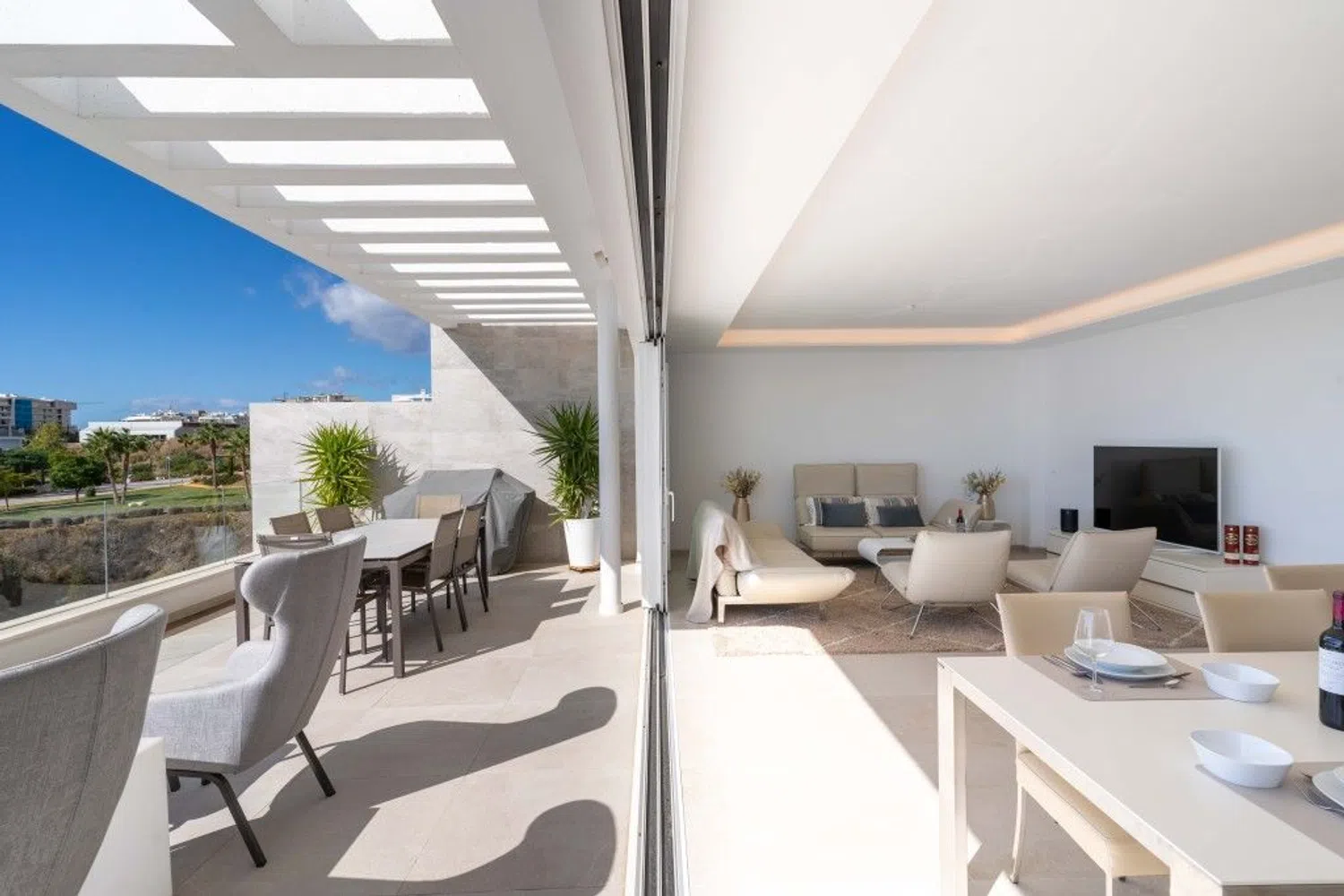 Entre y siéntase como en casa en este maravilloso ático con vistas ininterrumpidas al mar Mediterráneo, la playa y las olas. El ático está situado en una pequeña comunidad de sólo 20 apartamentos en un edificio con una fantástica arquitectura moderna y libre de los ruidos molestos de la vida cotidiana. Usted entra en el ático con el ascensor, que conecta todos los niveles, desde el garaje hasta la terraza de la azotea, privada para usted. Su mirada se posa inmediatamente en el gran espacio de vida del apartamento, inundado de luz, con una ventana continua de 9,2 metros al mar, de los cuales 6 metros se pueden abrir completamente. Este espacio vital combina generosamente la vida, la cocina y la comida. Abra las ventanas y el balcón de 44 m2 se conecta a la perfección y duplica casi por completo su espacio vital. Esto le brinda la oportunidad perfecta de vivir en el interior y al aire libre. El borde de cristal real del balcón le ofrece una vista clara del mar incluso cuando está sentado. El ático perfectamente proporcionado incluye 3 dormitorios y 2 baños, cada uno de los cuales puede calentarse o enfriarse por separado. Los dormitorios tienen persianas eléctricas y se pueden oscurecer completamente. En la azotea de 123 m2 encontrará un jacuzzi exclusivo y una preparación para una cocina exterior. Un sistema adicional de descalcificación independiente en el ático limpia el agua utilizada de forma centralizada. Un sistema domótico permite controlar el aire acondicionado, la calefacción por suelo radiante, las luces y las persianas. Un sistema Eufy con 4 cámaras está instalado como sistema de seguridad privada. Encontrará suficiente espacio de almacenamiento para todas sus pertenencias, ya que se ha instalado un segundo armario empotrado en el dormitorio principal y la isla de la cocina tiene grandes cajones a ambos lados. Se incluyen 2 plazas de aparcamiento de fácil acceso y un trastero bien situado en el garaje.