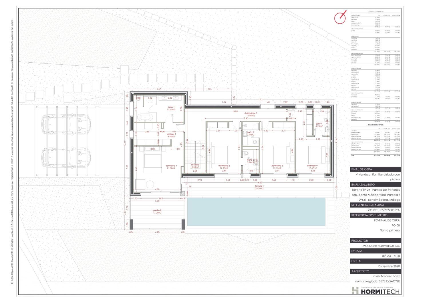 Spectacular modern villa with sea views in a highly exclusive and gated community with security. This property is located in a unique enclave, the last pristine place in Benalmádena, just 900 meters from the beach and less than 20 minutes from the airport or Marbella. The villa consists of 4 bedrooms and 4 bathrooms plus a guest toilet in a total of 376m2 built area, all on a plot of 2010m2 with sea and mountain views. This property has been built by the company Hormitech, renowned for the efficiency of its constructions.