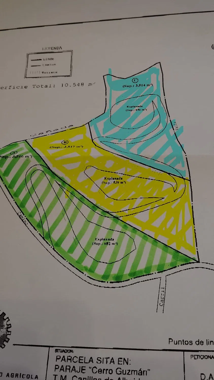 Parcela completa de 10.548m2. Localizada en el Cerro de Guzman en Canillas de Albaida. Dividida a su vez en 3 posibles parcelas con 3 llanos y carriles construidos. 1º Parcela (abajo/verde): 3.540m2: 40.000€ 2º Parcela (enmedio/amarillo): 3.517m2: 30.000€ 3º Parcela (Arriba / Azul): 3.514m2: 50.00€ Parcela TOTAL de 10.548€: 100.000€ Se venden por separado o conjunto, terreno escriturado y papeles en orden.